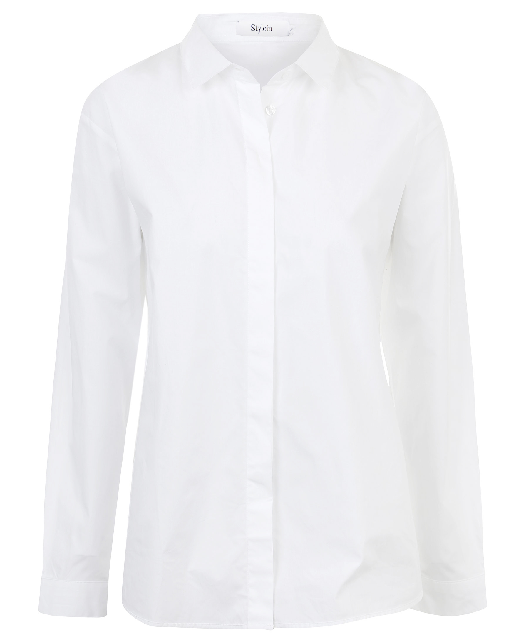 Vit, klassisk bomullsskjorta i ledig siluett från Stylein. Spetsig krage och dolda knappar fram. Två knappar i ärmslut. Tillverkad i 100% bomull.