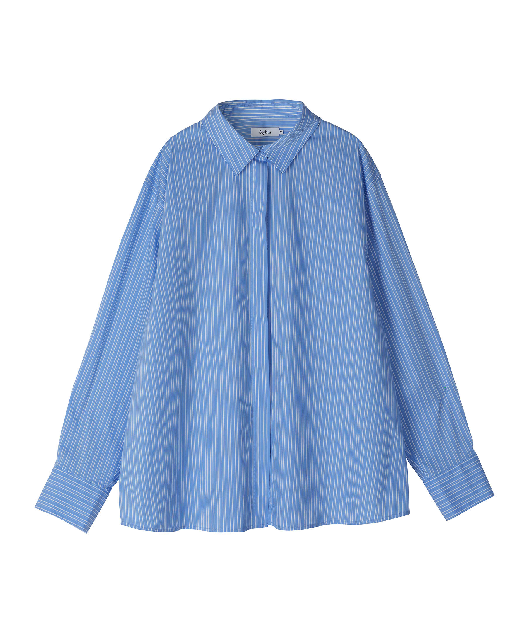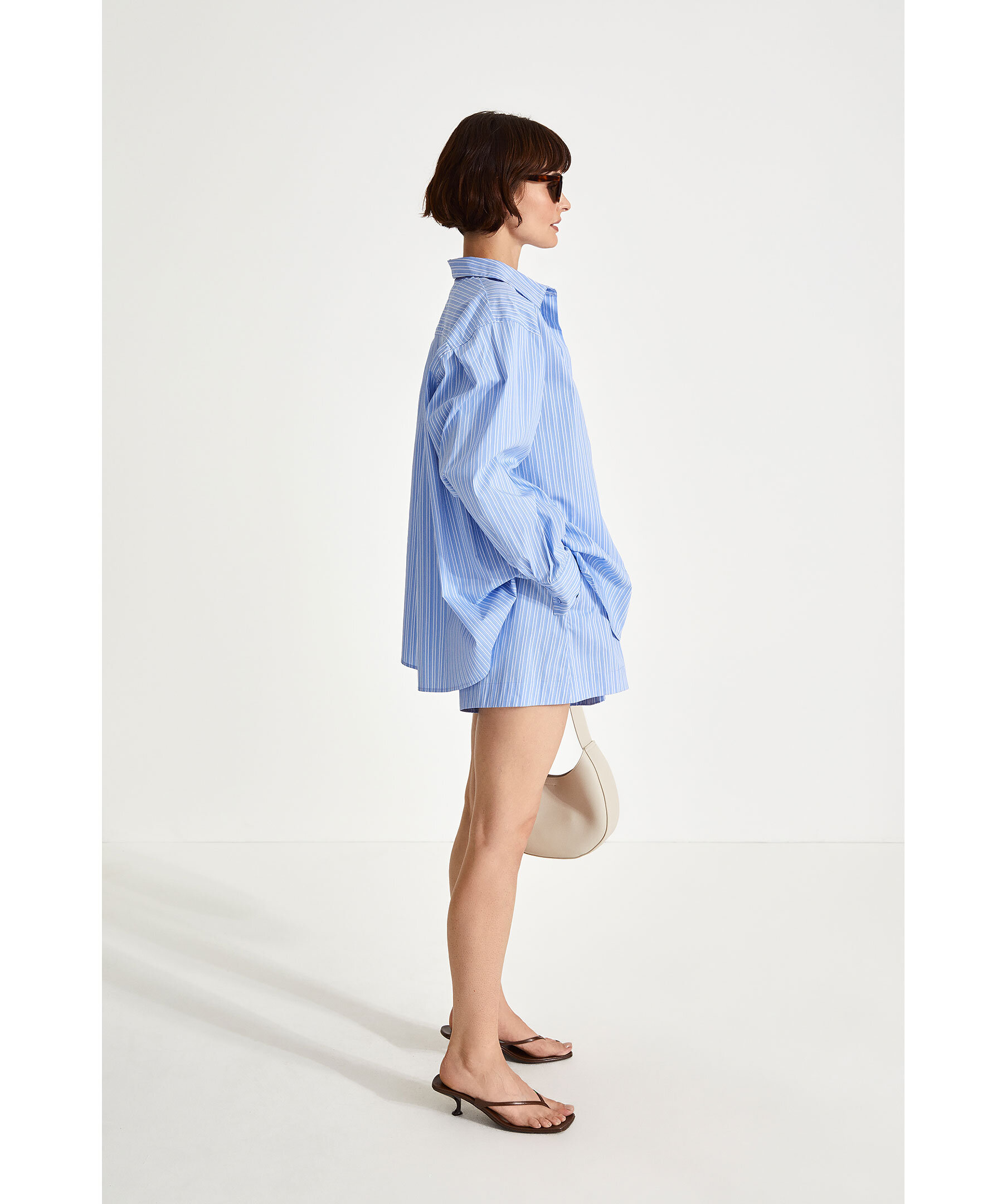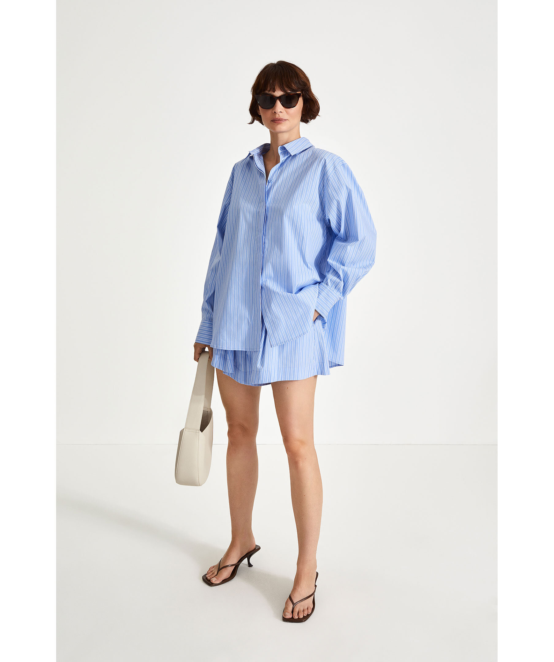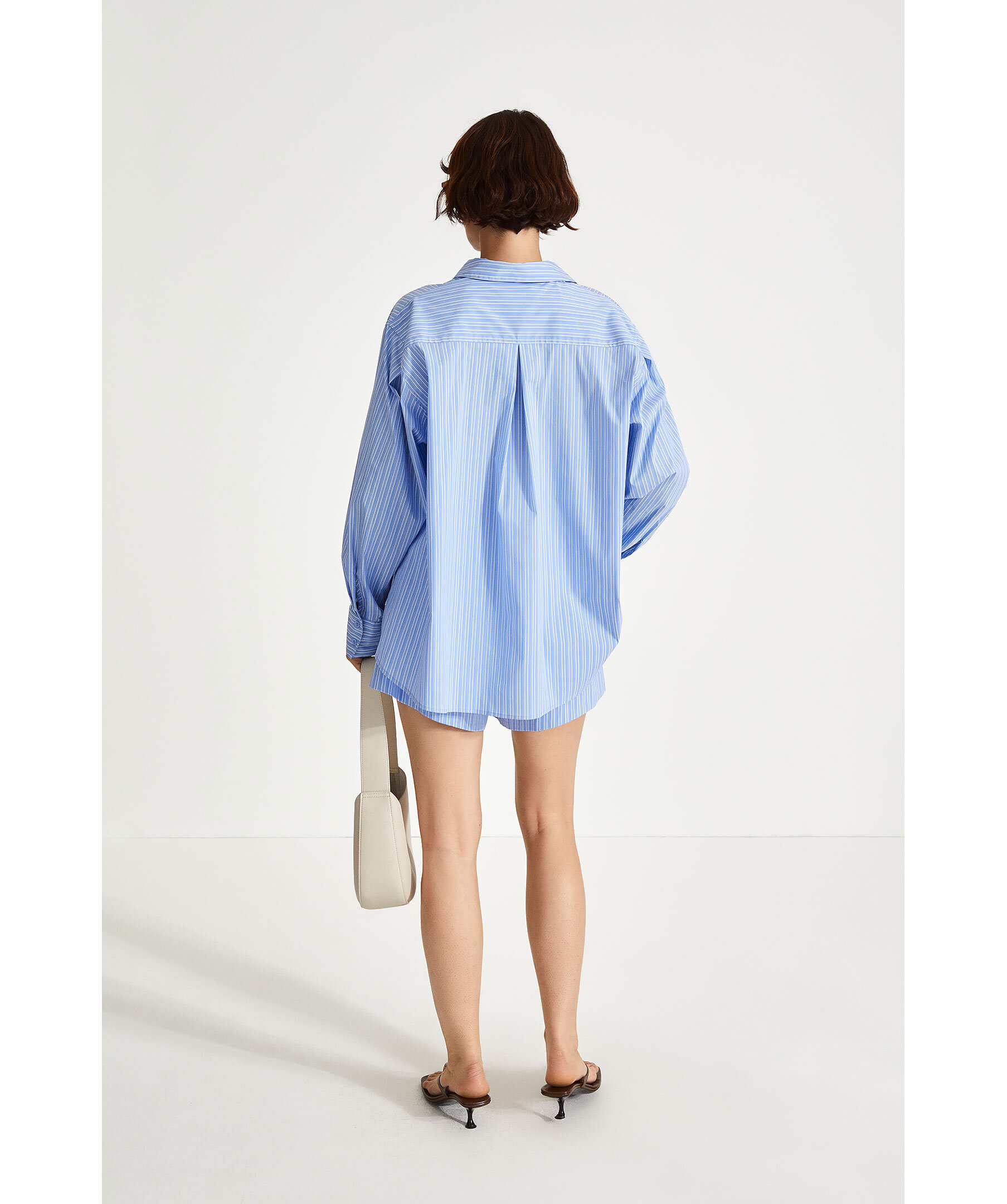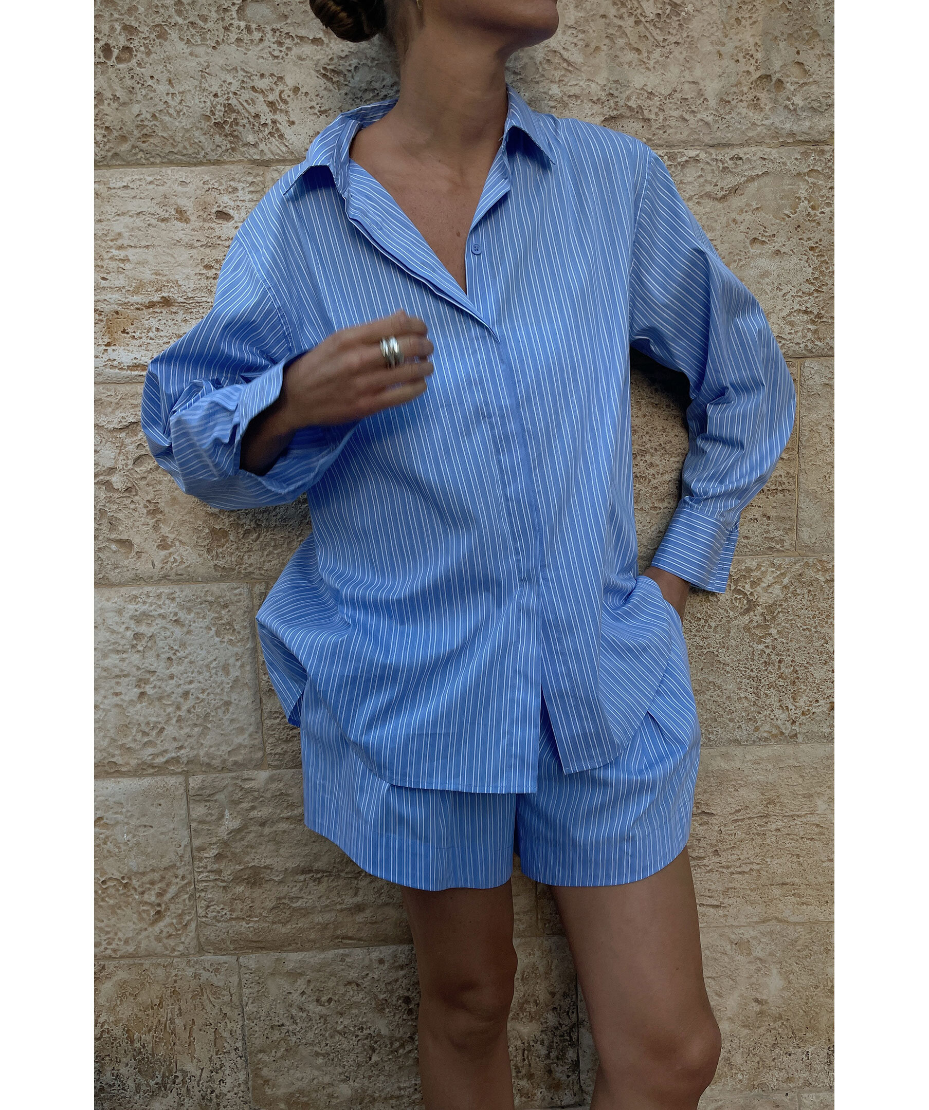 Blå, klassisk randig skjorta från Stylein. Jeanne-skjortan är en klassisk button-down gjord av ett mjukt tyg i bomullsblandning med långa ärmar och en vacker boxig siluett för en bekväm och avslappnad passform.