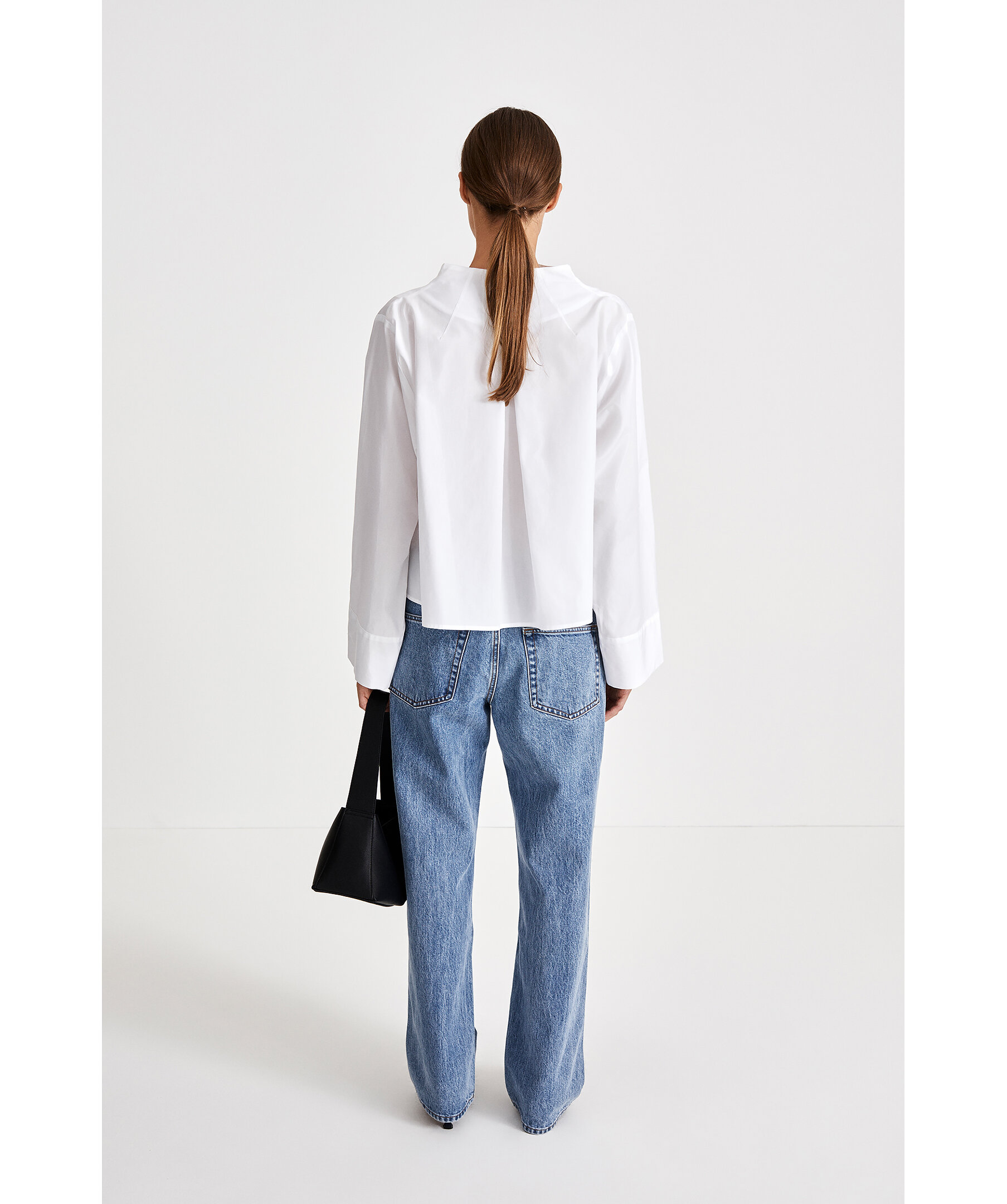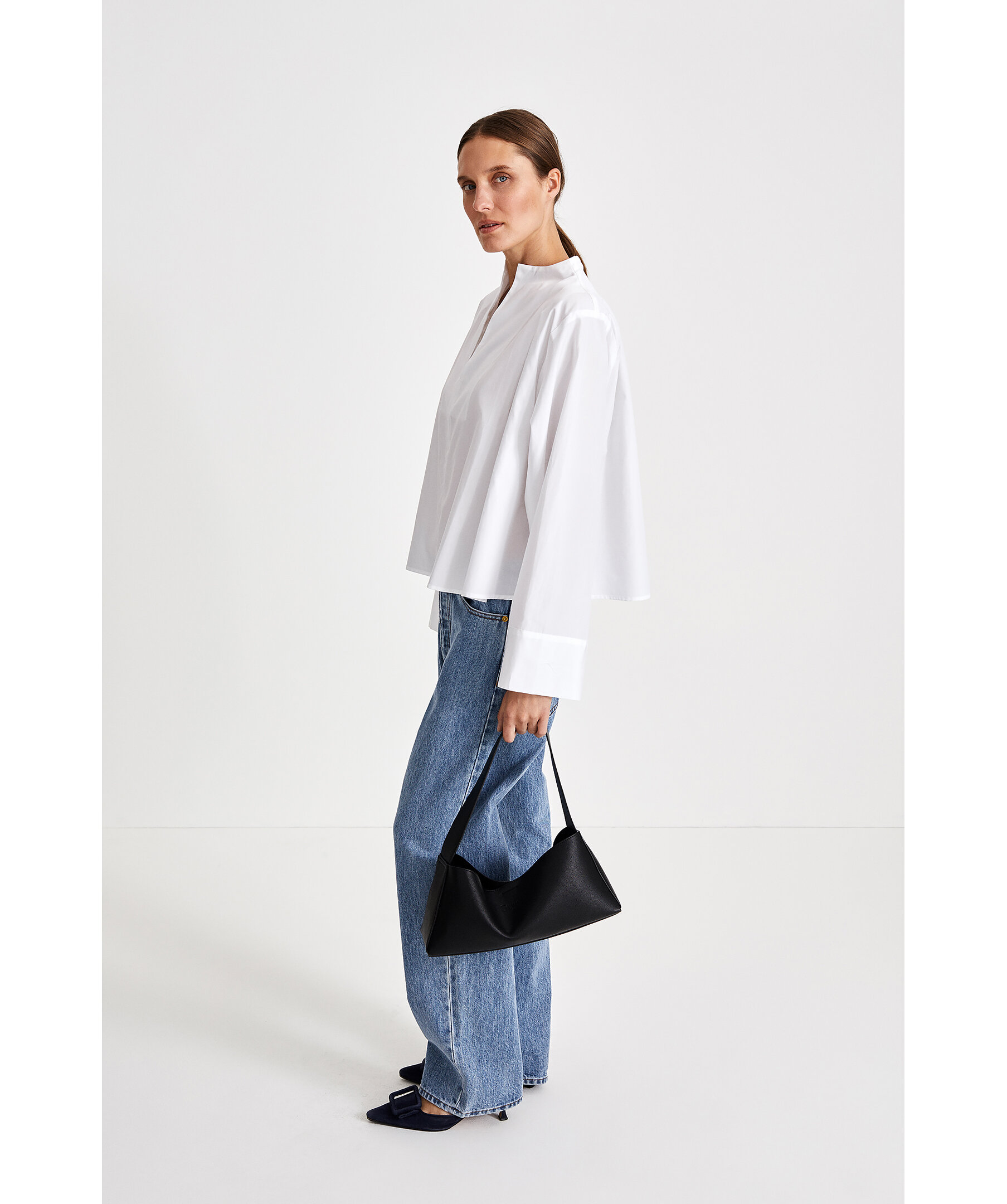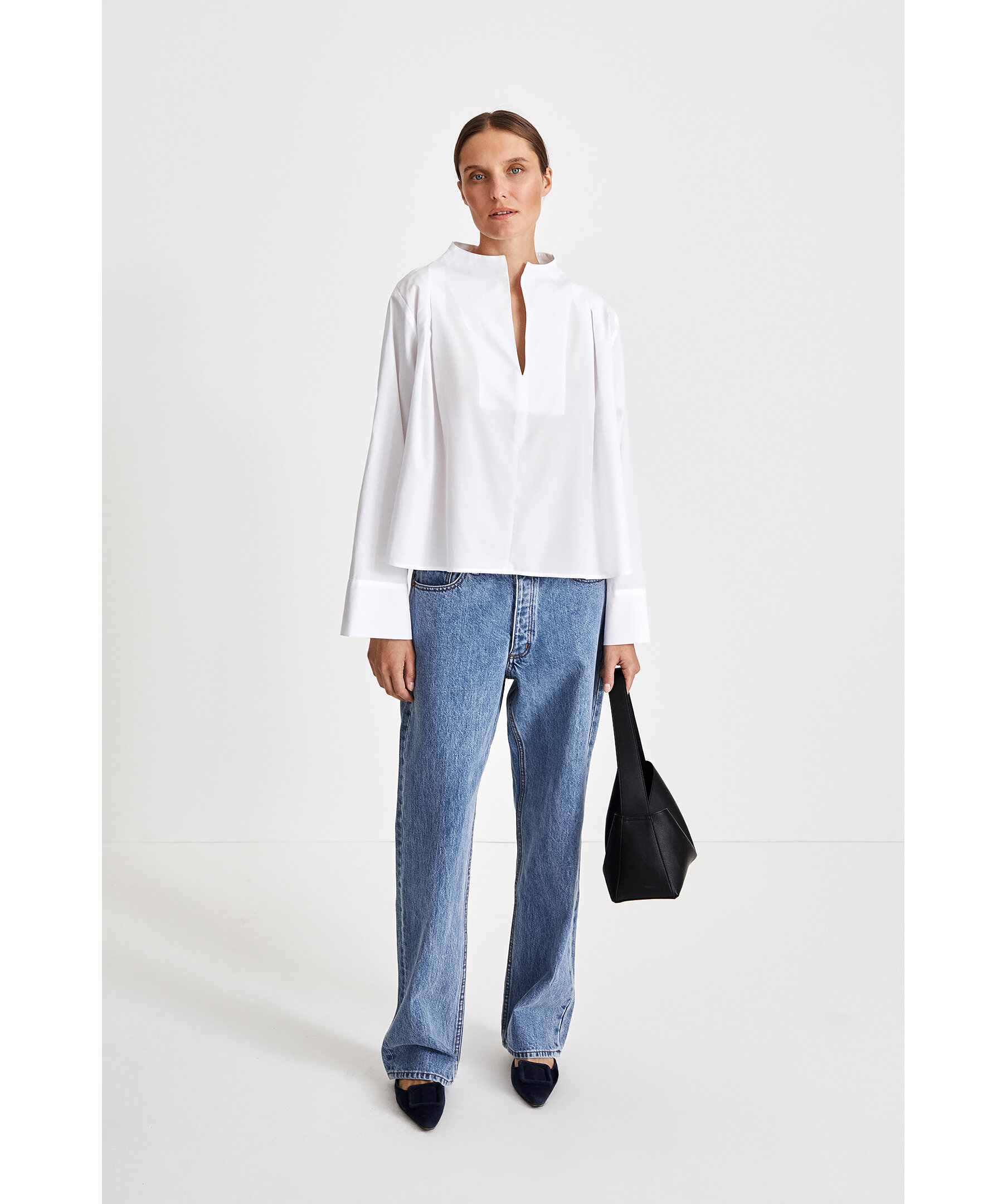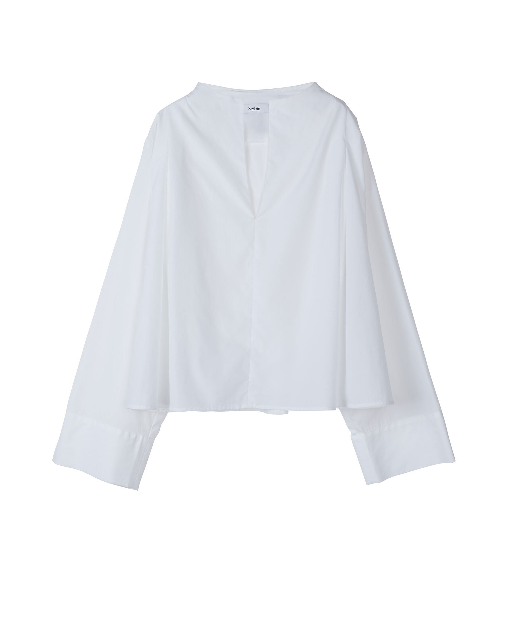 Vit stilren blus från Stylein. V-ringad med hög krage. Aningen cropad passform. Långa ärmar med vida ärmslut. Tillverkad i 100% Bomull.