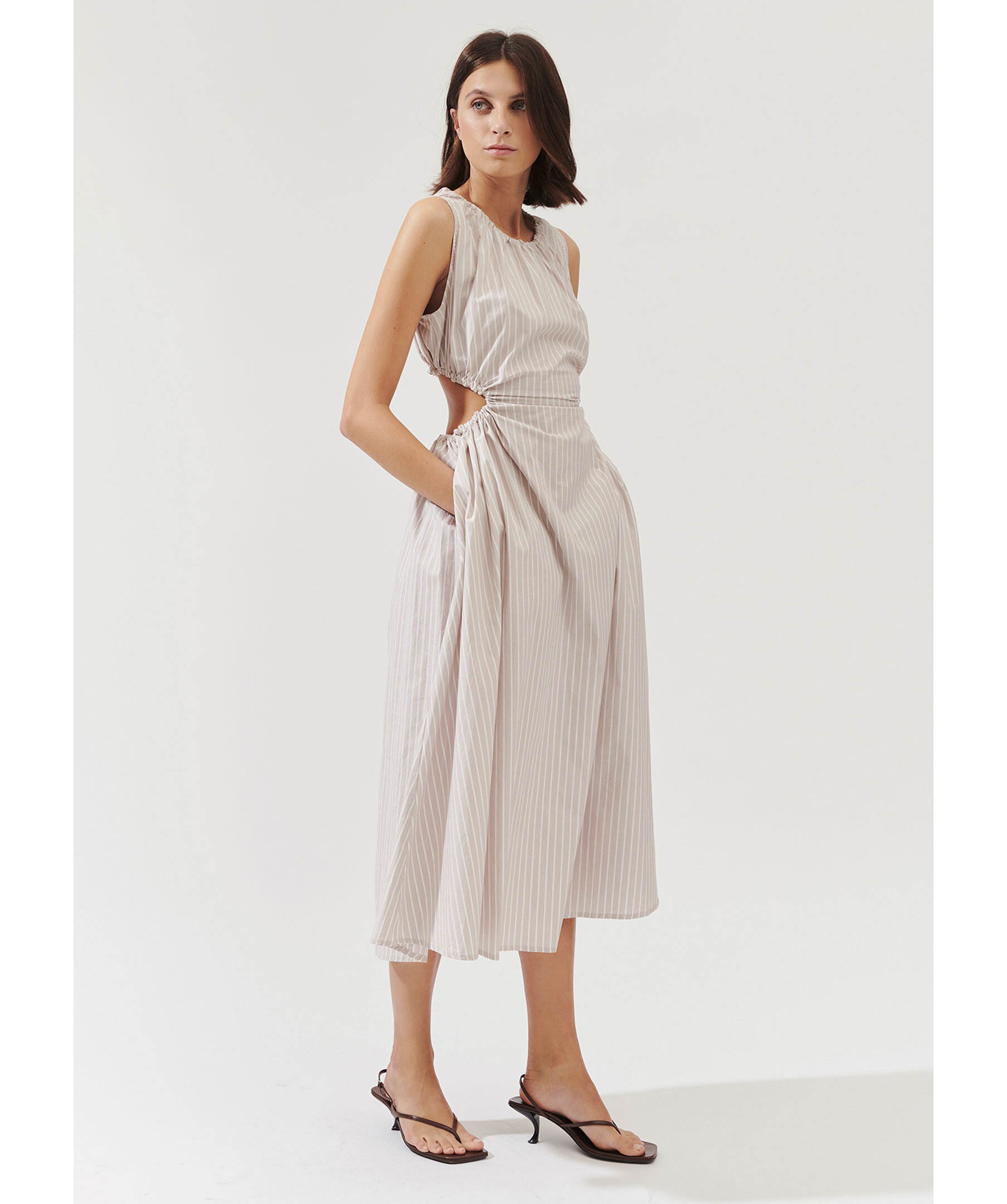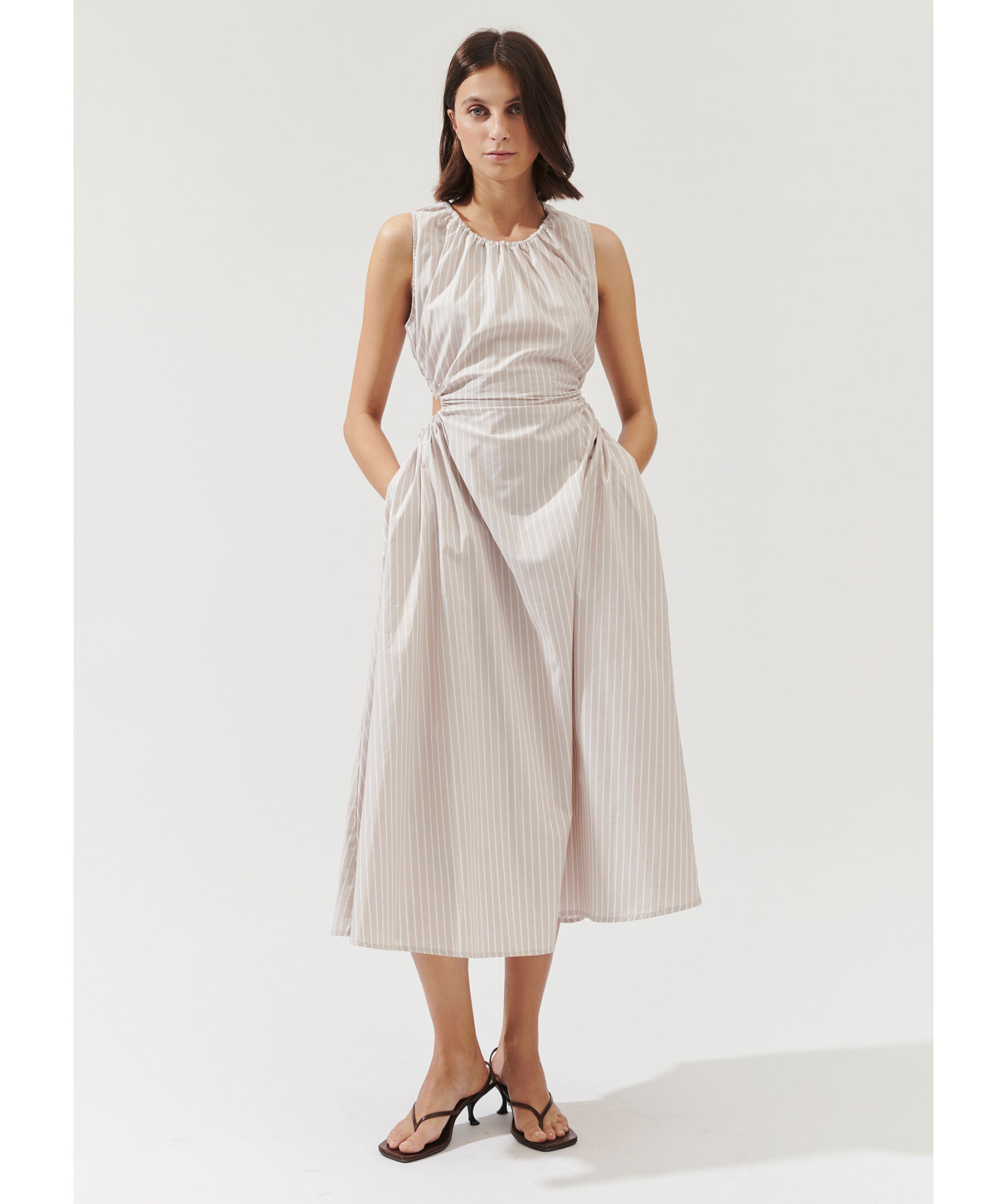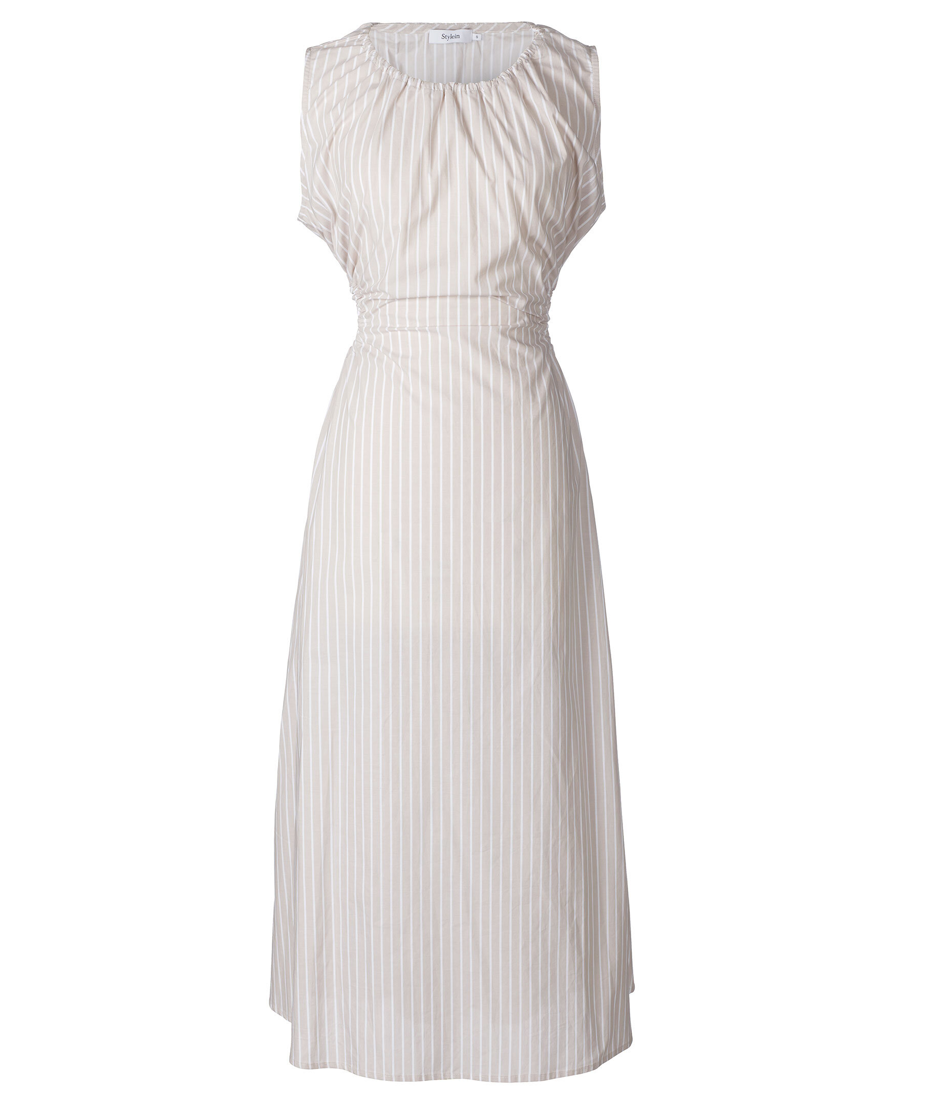 Beige och vit randig klänning från Stylein. Delvis öppen rygg, snörning baktill. Rundad halsrining. Fickor i sidan. Klänningen slutar strax under knäna.