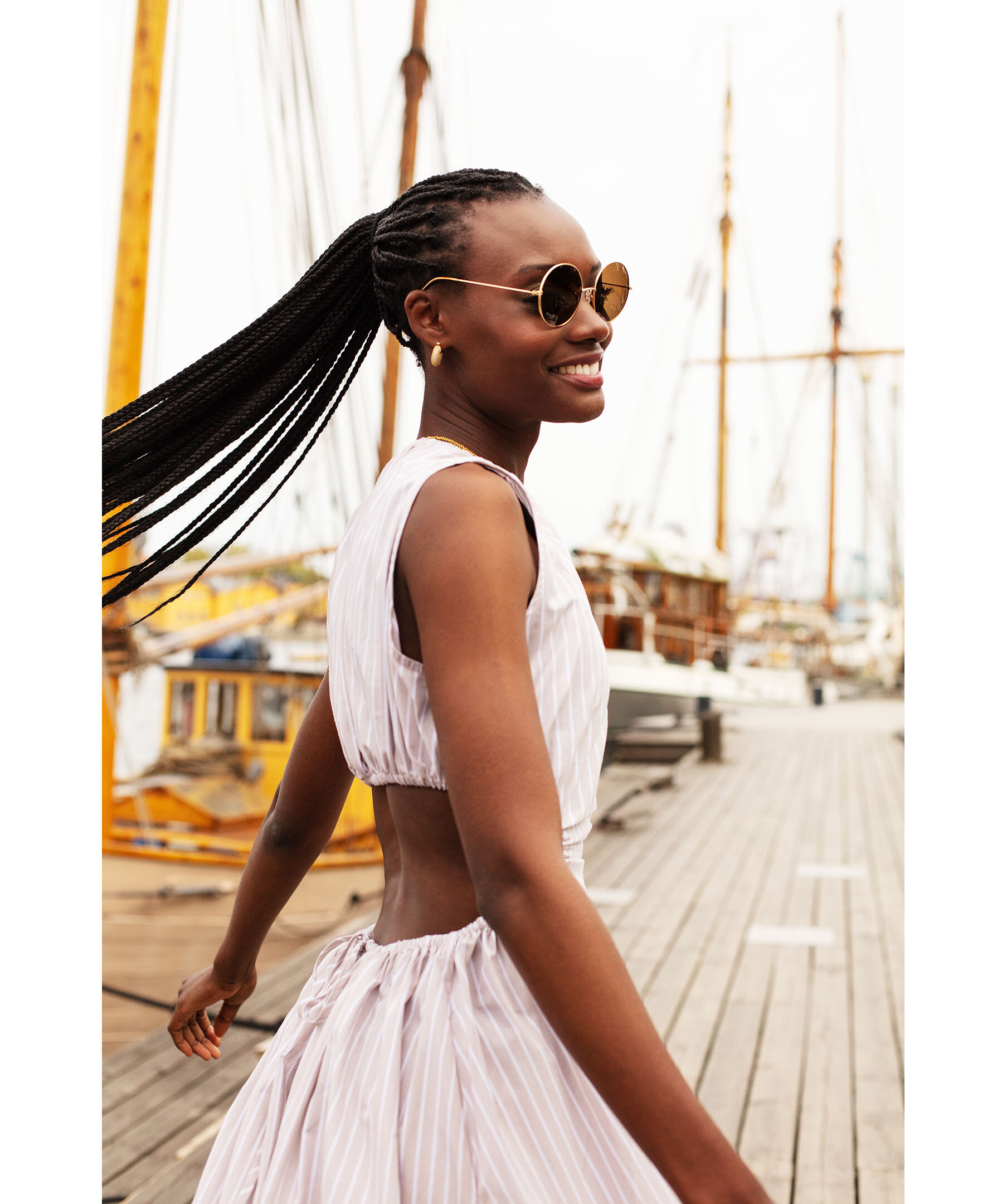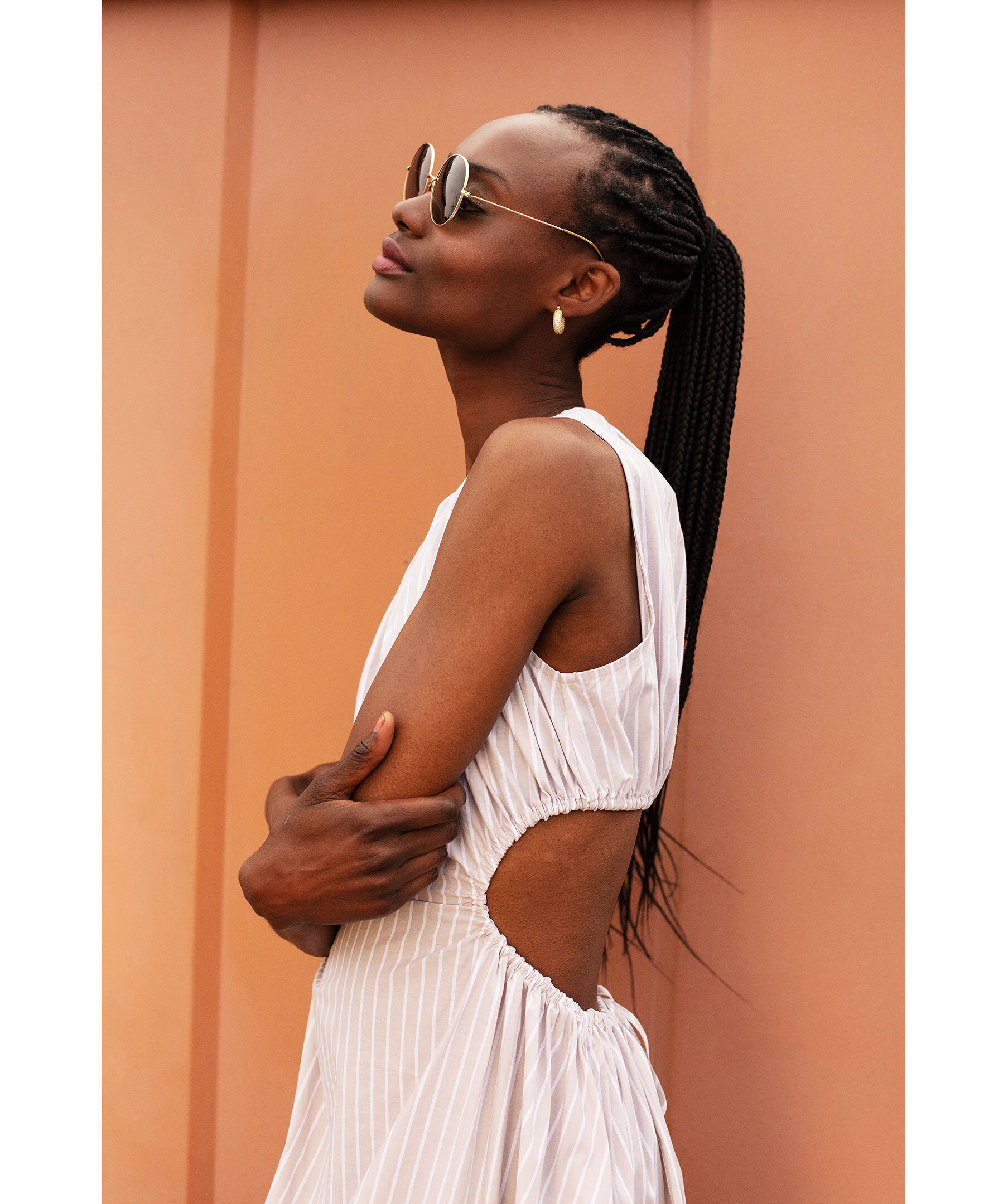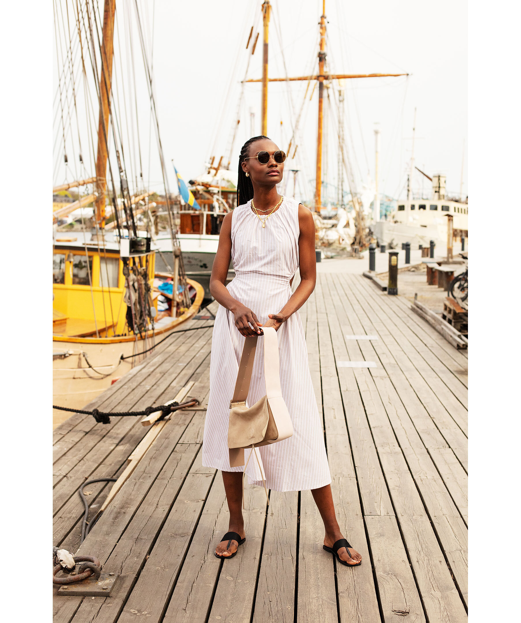 Beige och vit randig klänning från Stylein. Delvis öppen rygg, snörning baktill. Rundad halsrining. Fickor i sidan. Klänningen slutar strax under knäna.