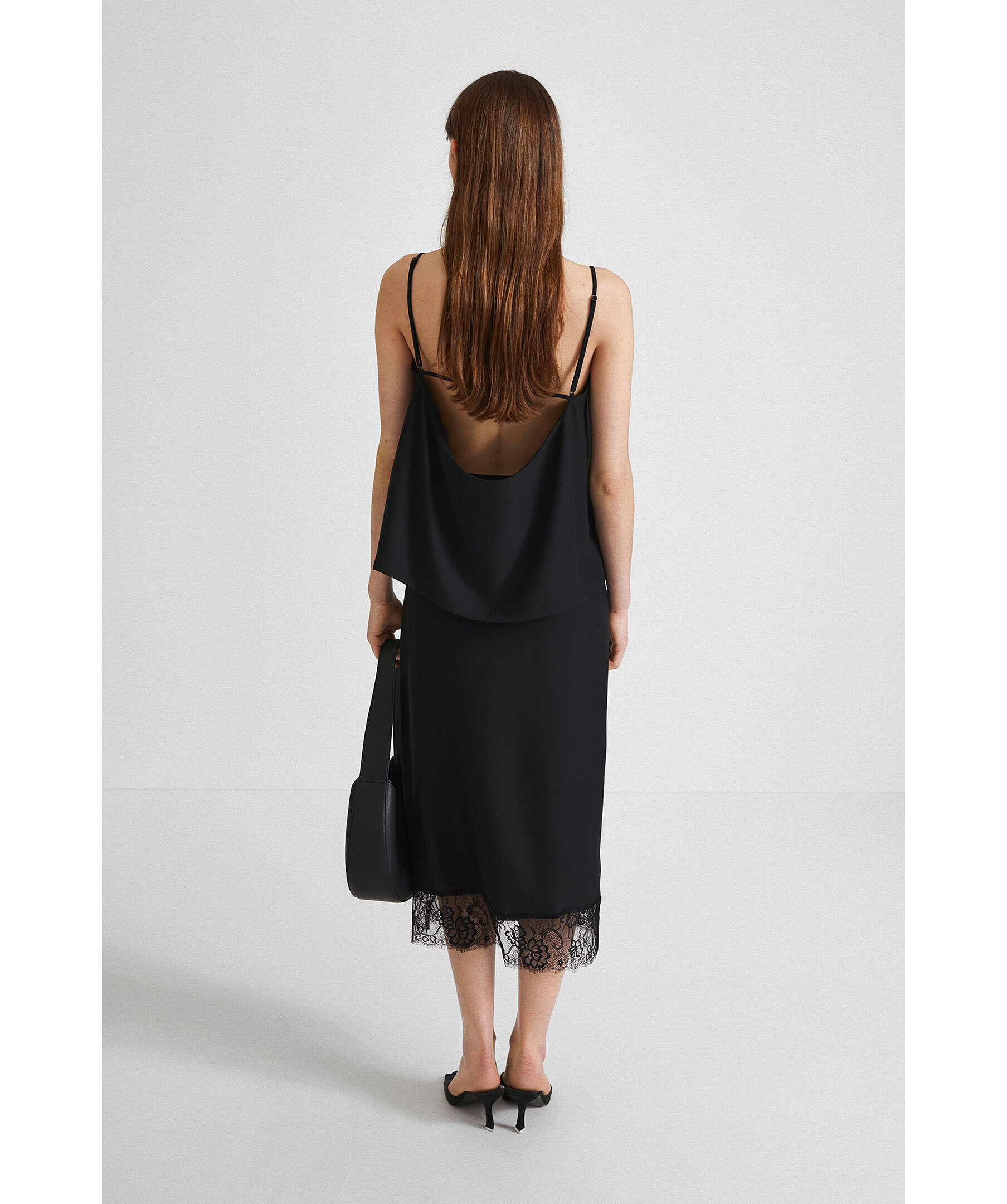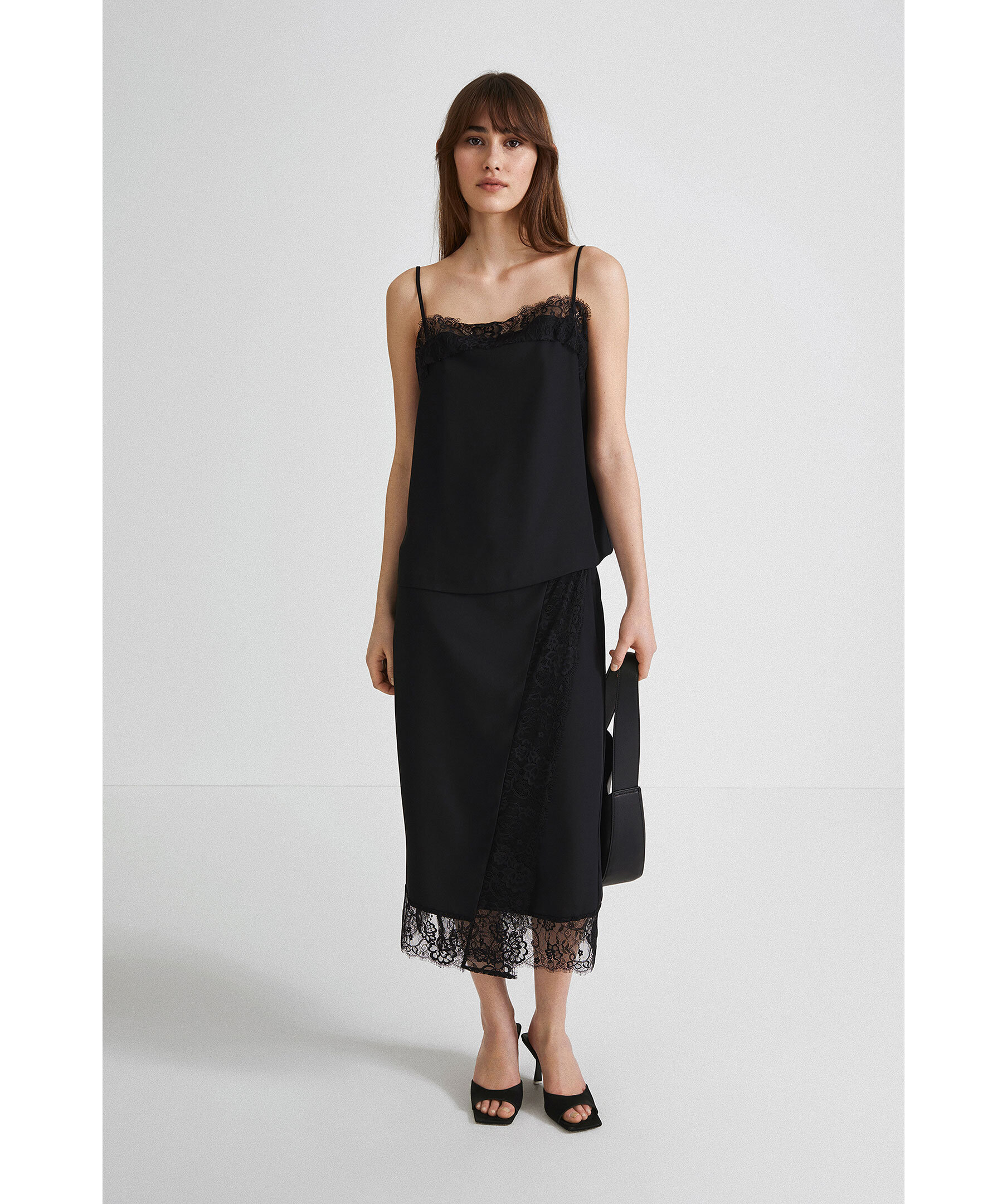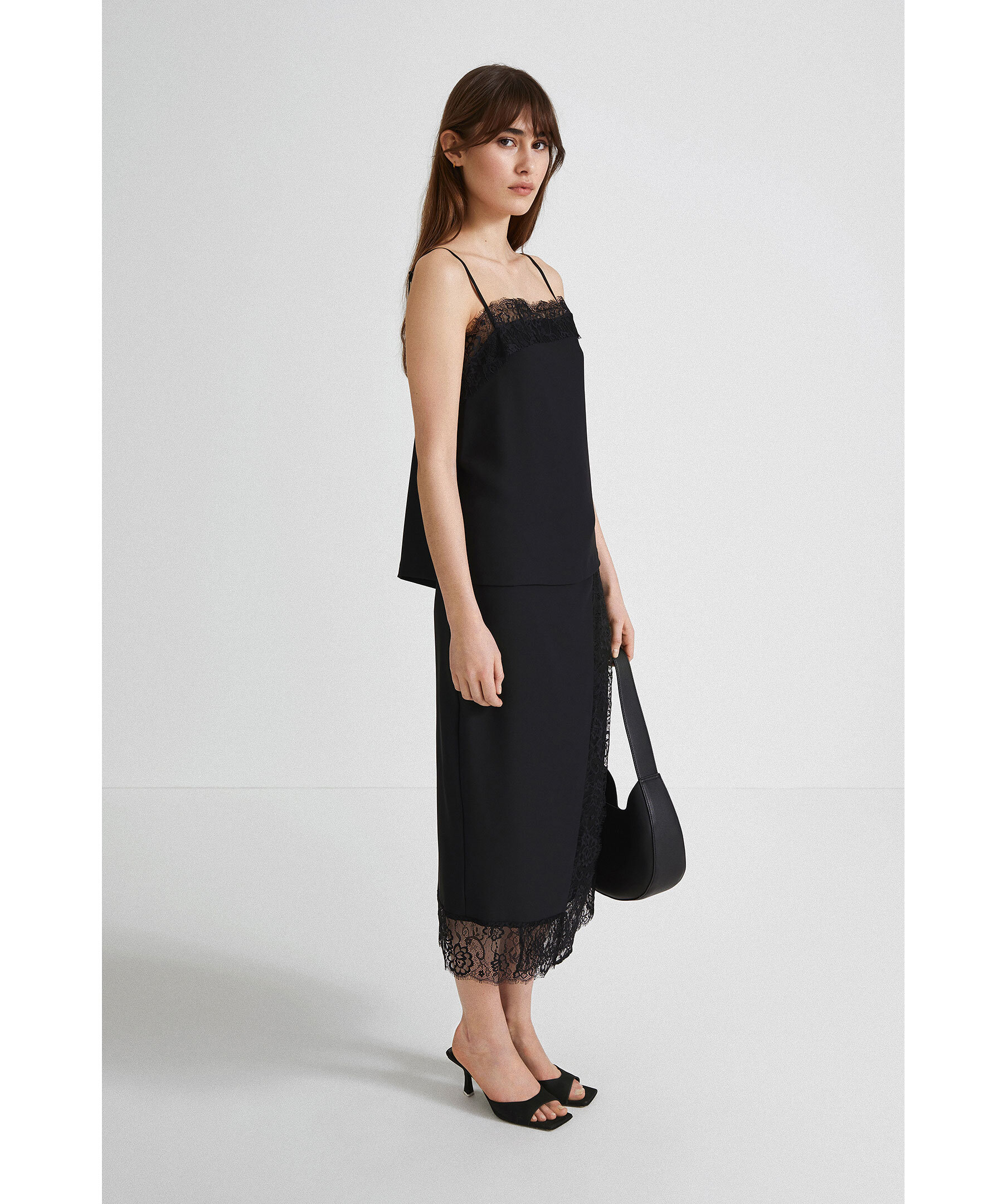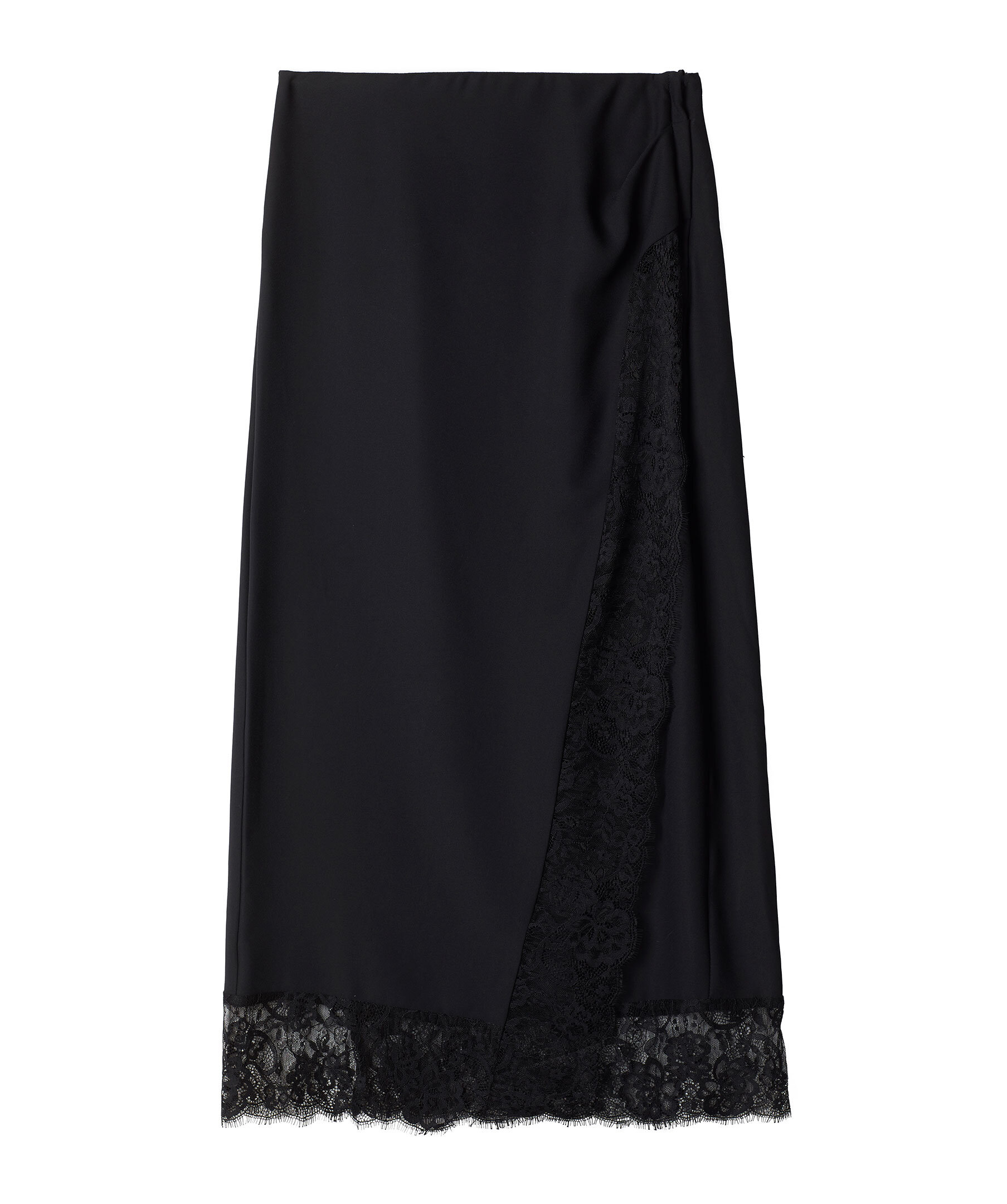 Svart vadlång kjol från Stylein. Rak och semi figursydd passform med elastiskt midjeband. Omlottsydd framtill med spets detaljer på kjolens kanter. Dold dragkedja på vänster sida.
