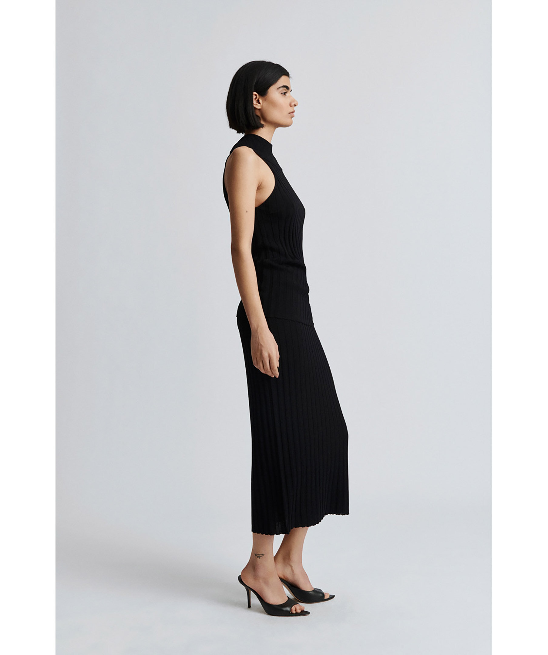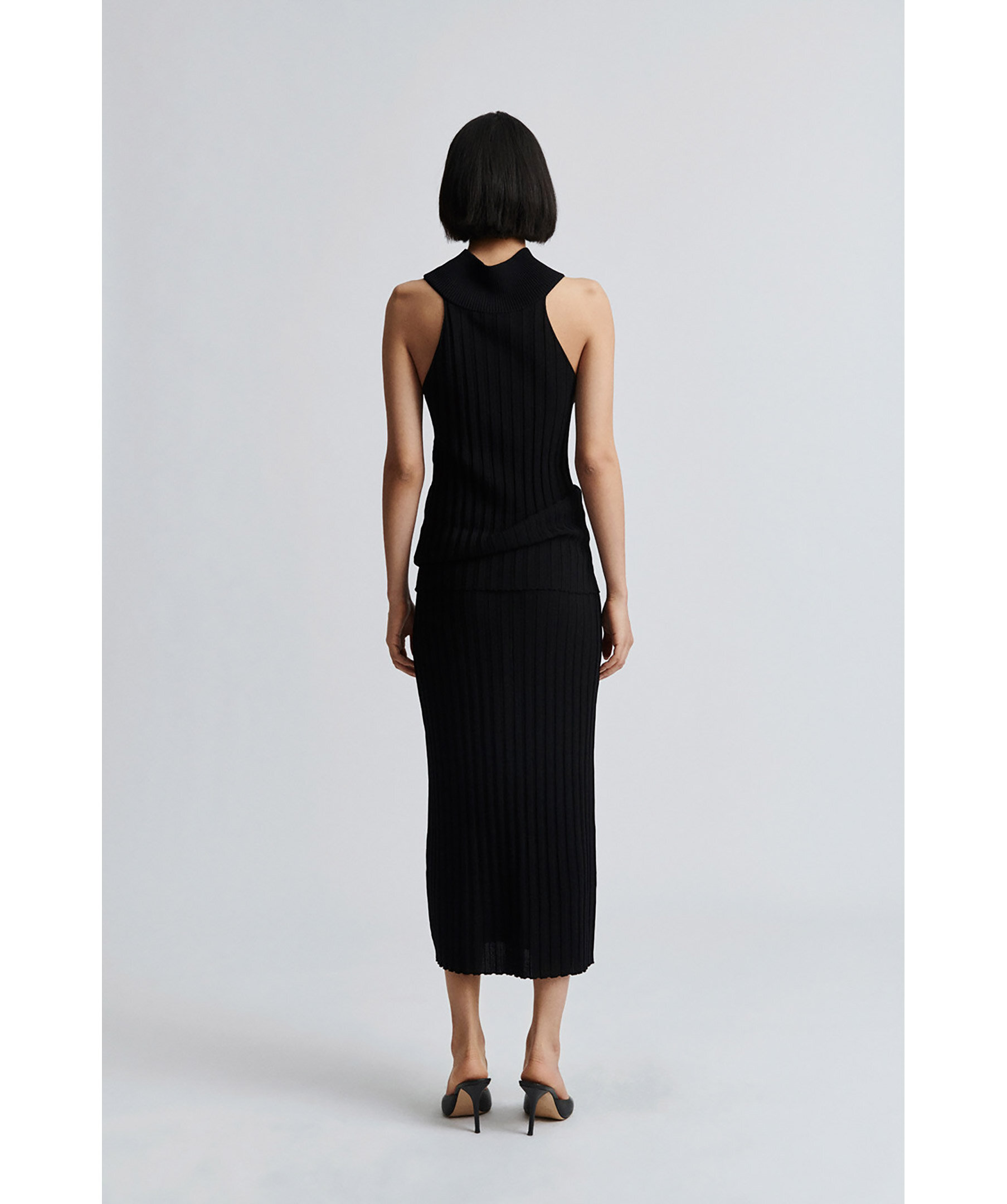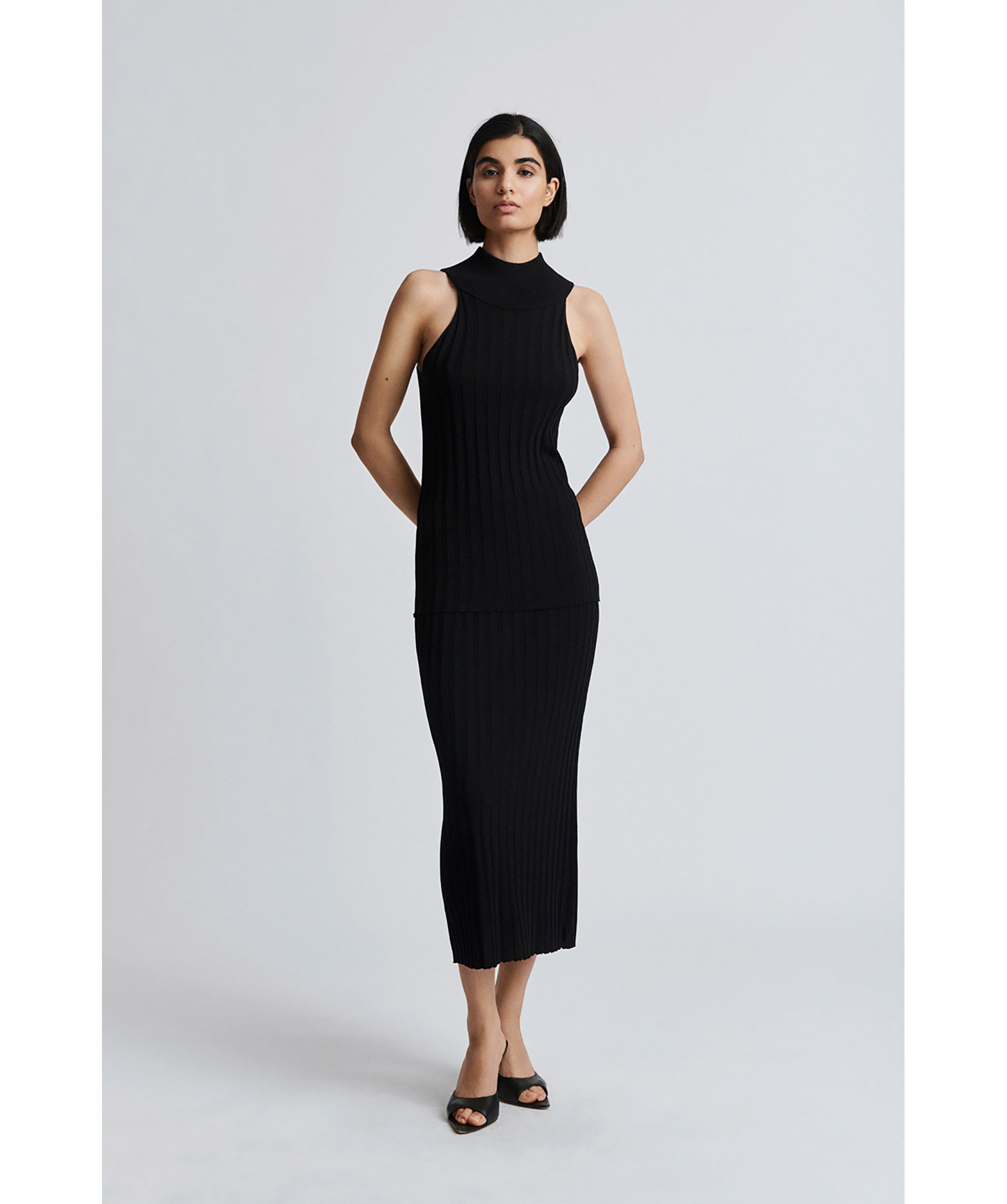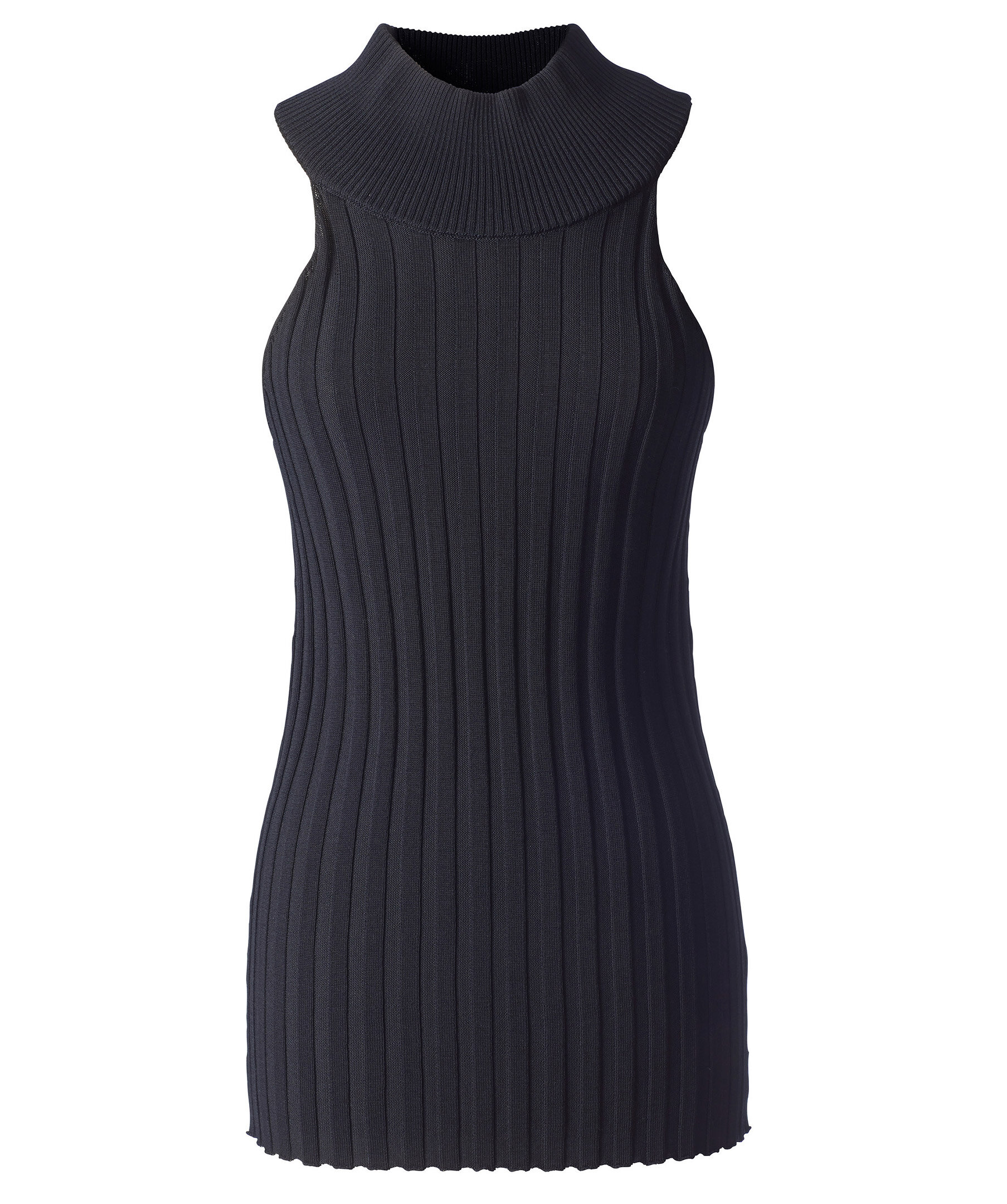 Svart, ribbstickad topp med en vacker, hög krage från Stylein. Gjord i en vacker glänsande ribb jersey. Den har en figursydd passform, trattkrage och djupt ärmhål för en bekväm passform.