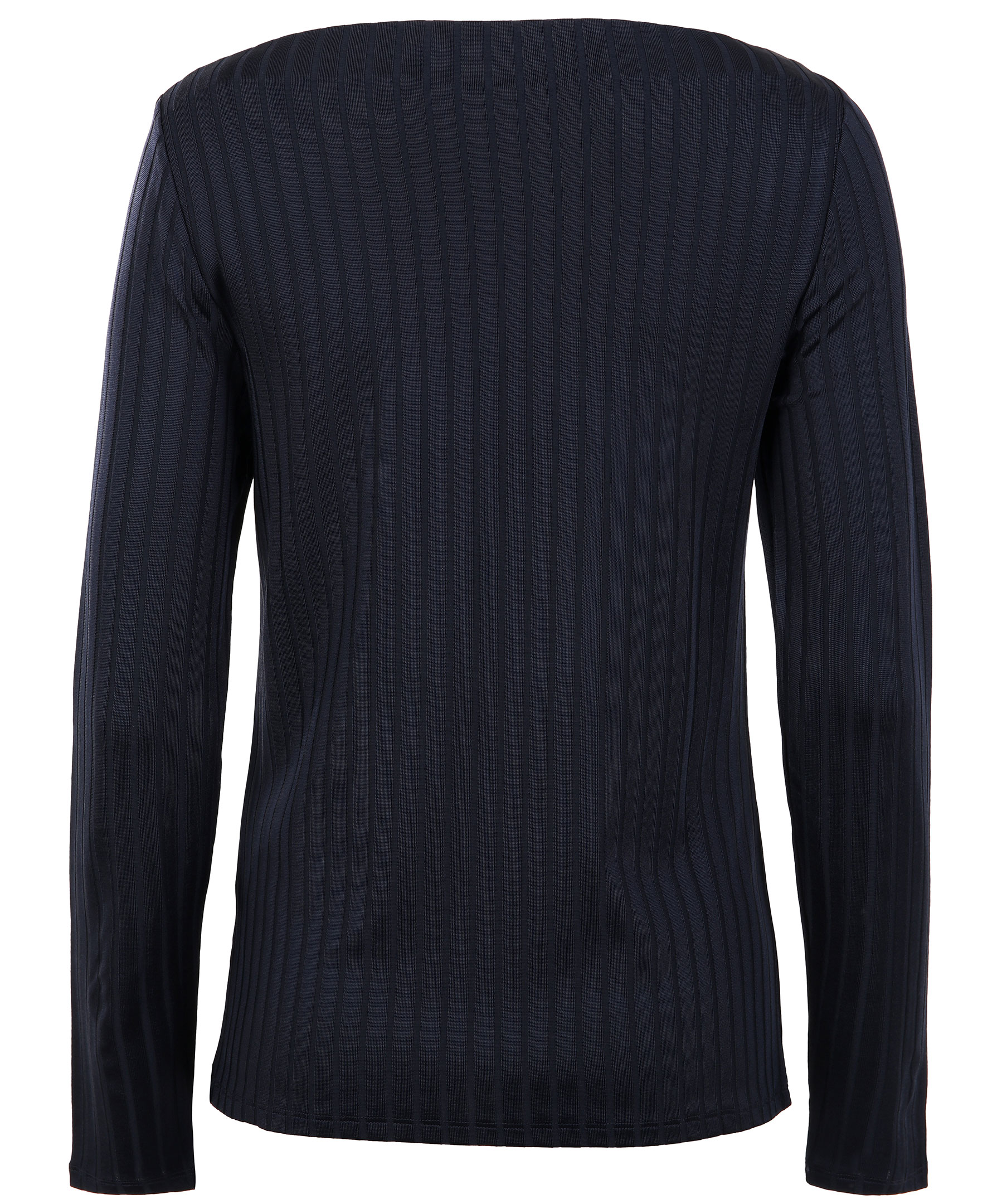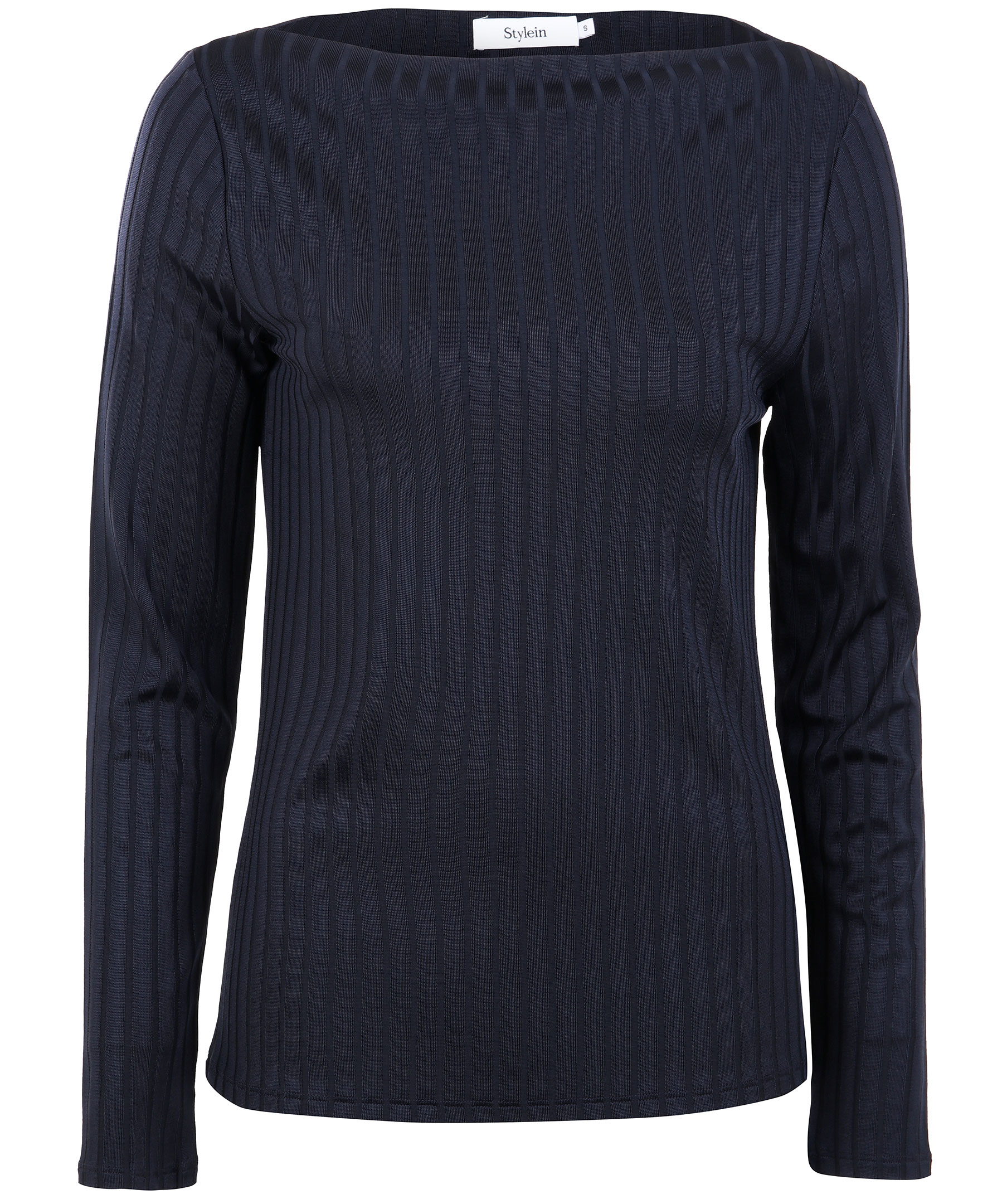 Marinblå topp med långa ärmar från Stylein. Glansigt tyg med ribbat mönster och hög, båthalsad ringning. Rak passform och tillverkad i viskosblandning.