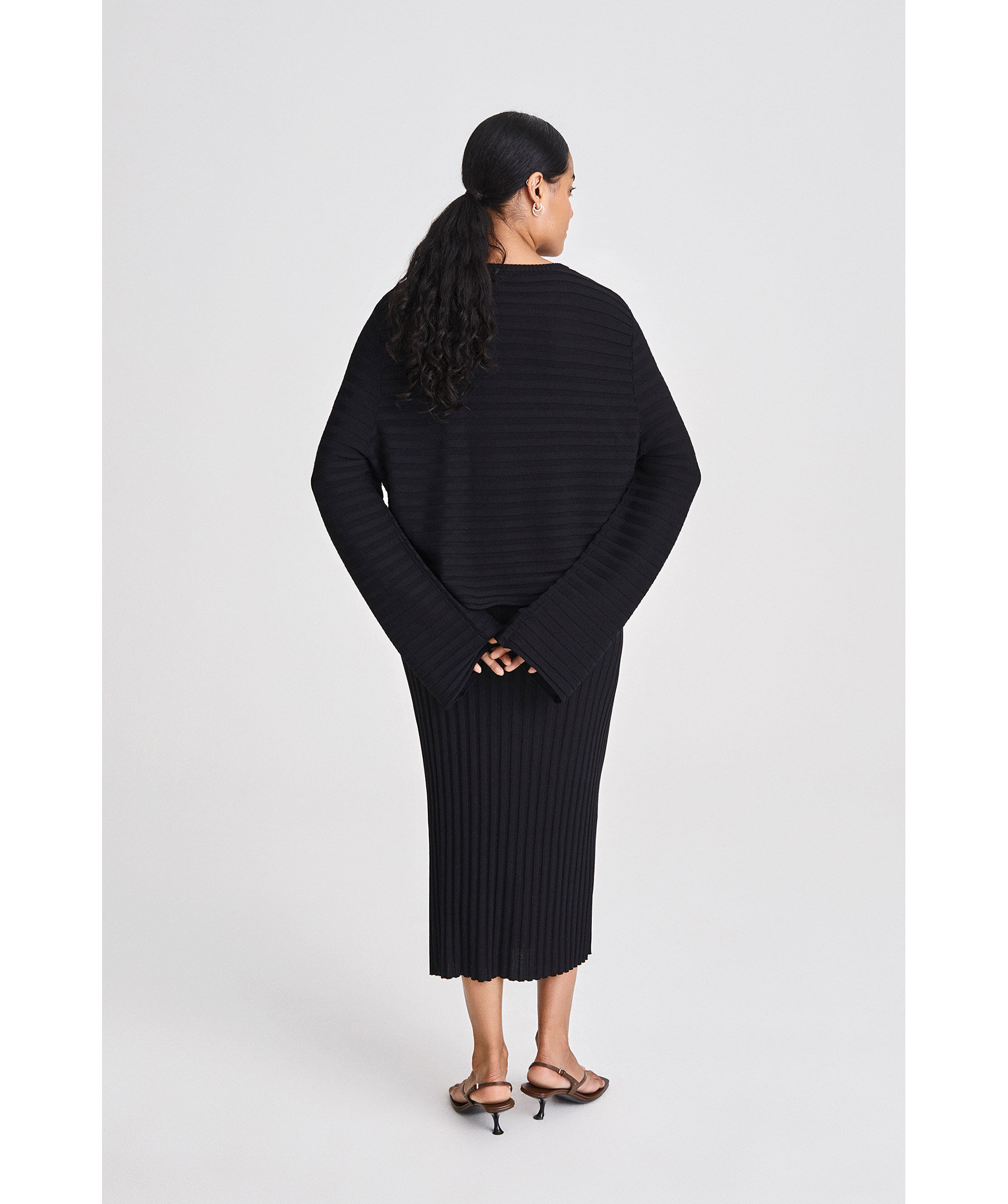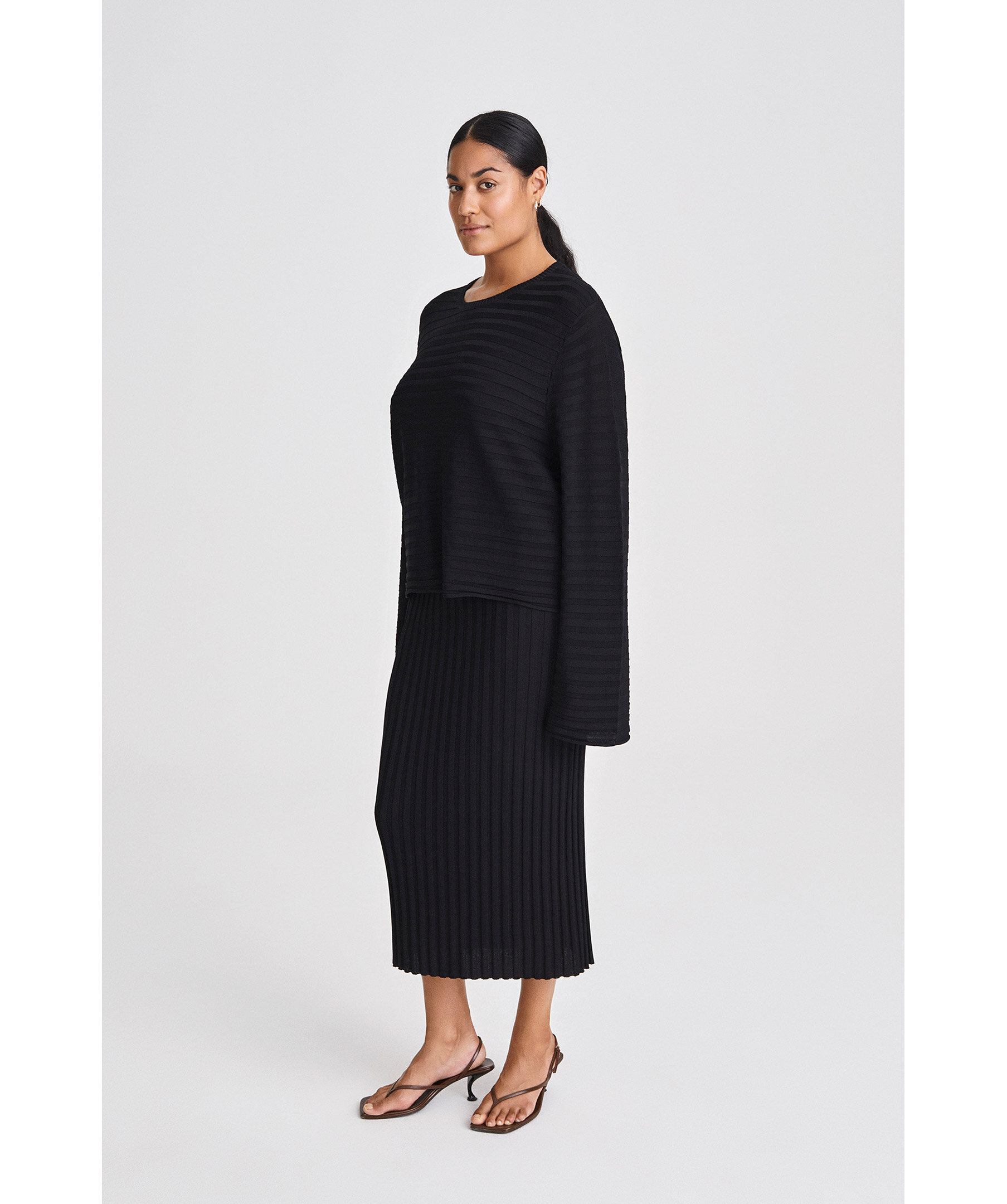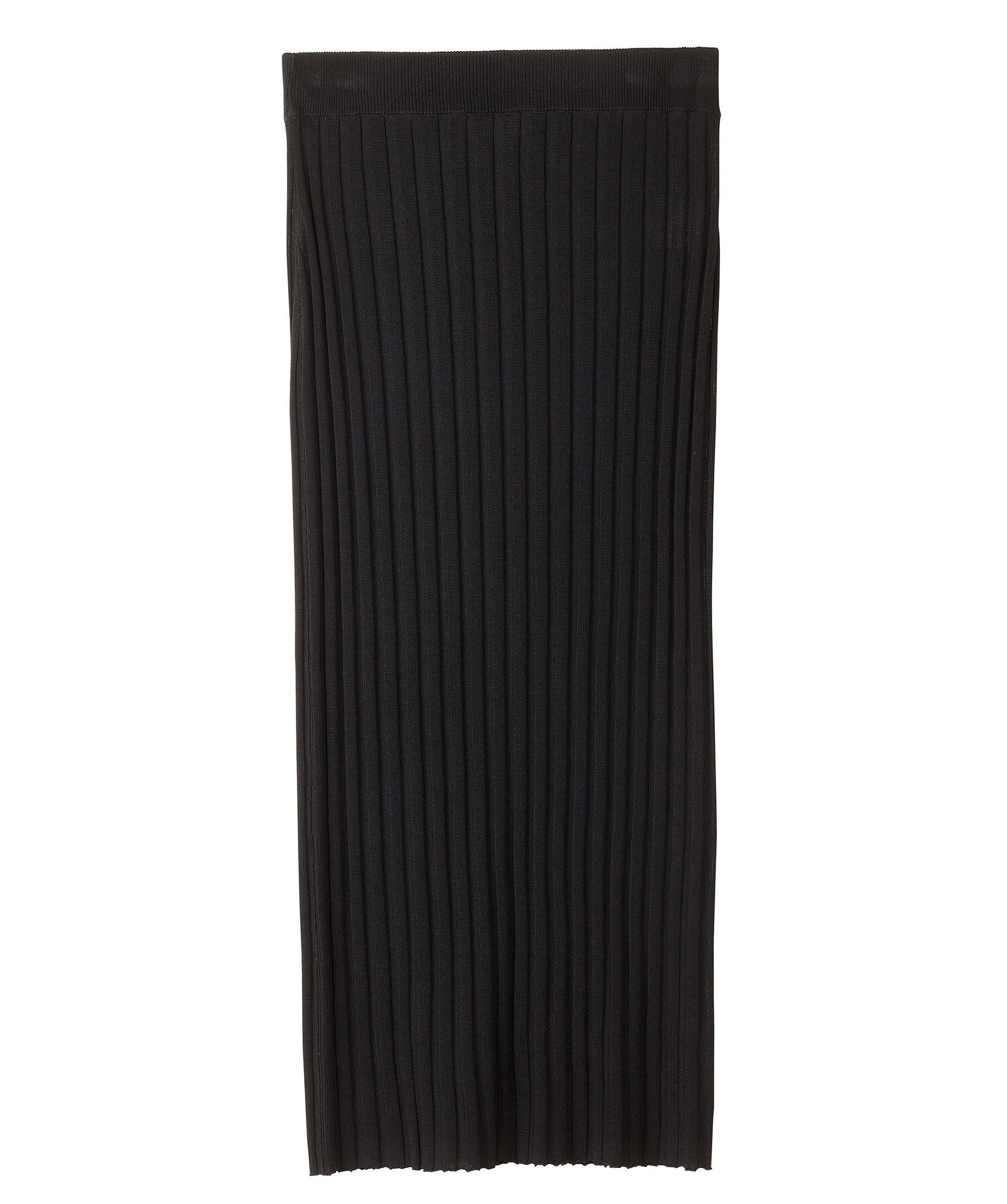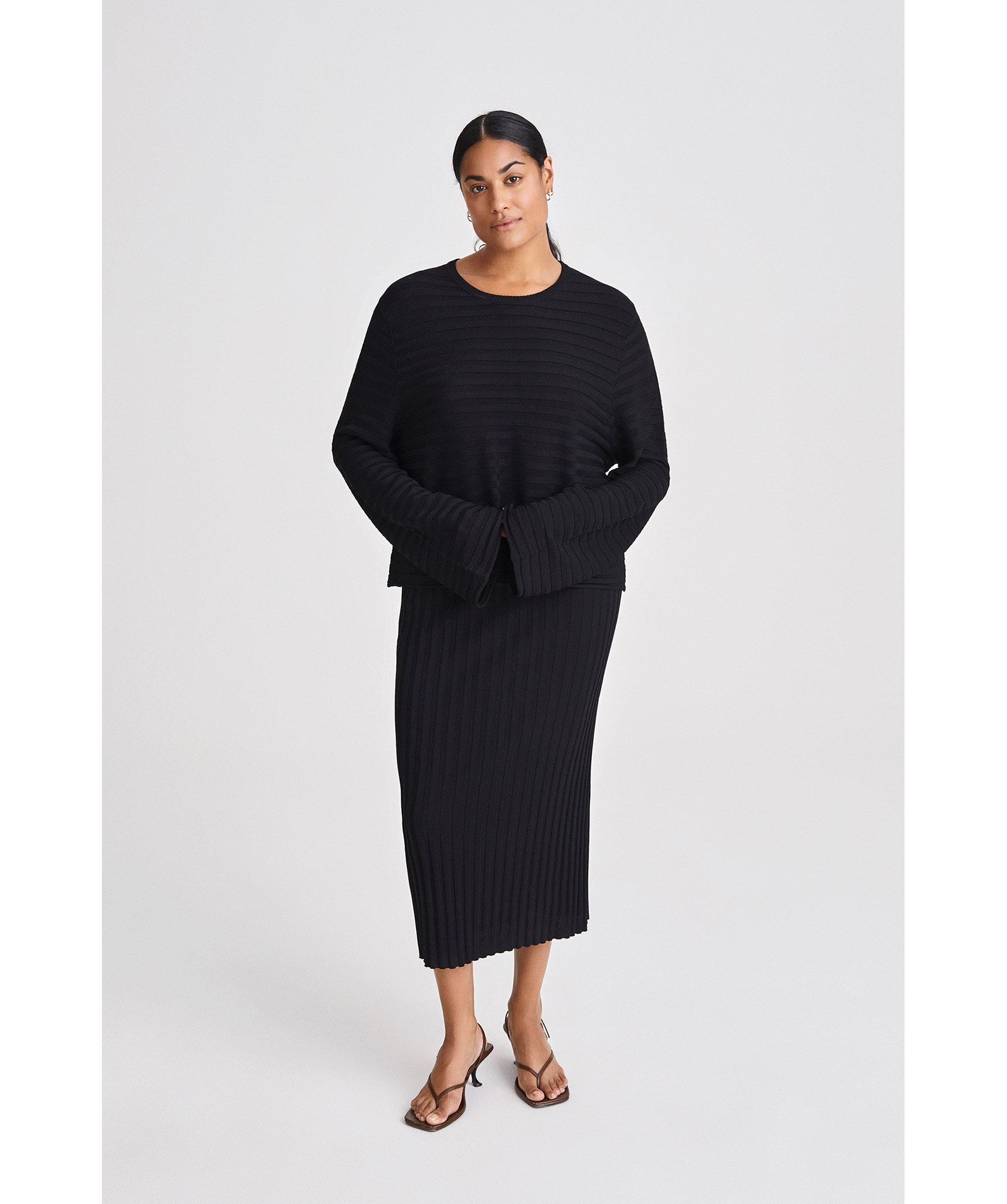 Svart, rak och stickad kjol från Stylein. Gjord i en glänsande ribbstickad jersey. Den här kjolen har den perfekta längden på mitten av vaden med ett bekvämt elastiskt midjeband.