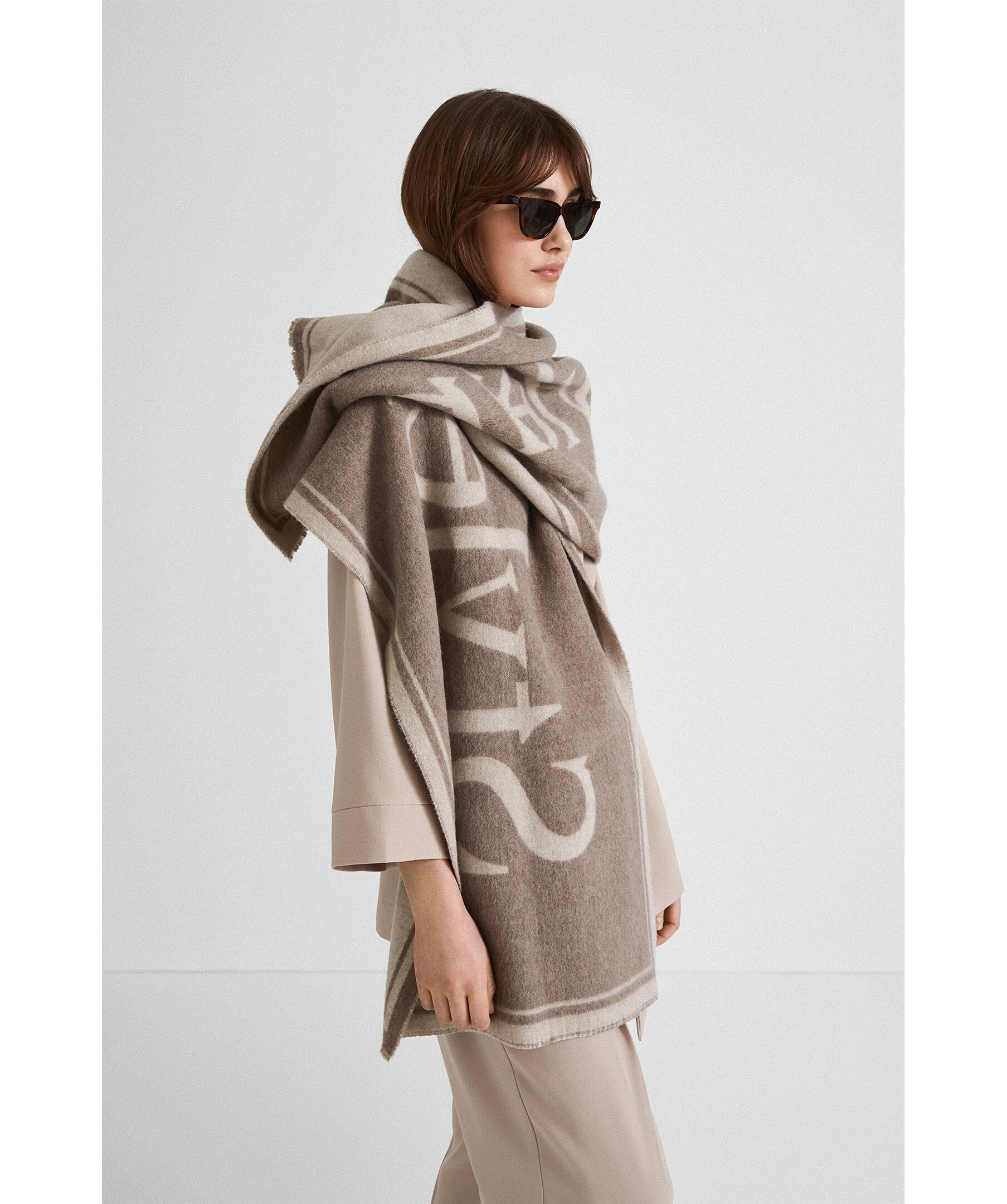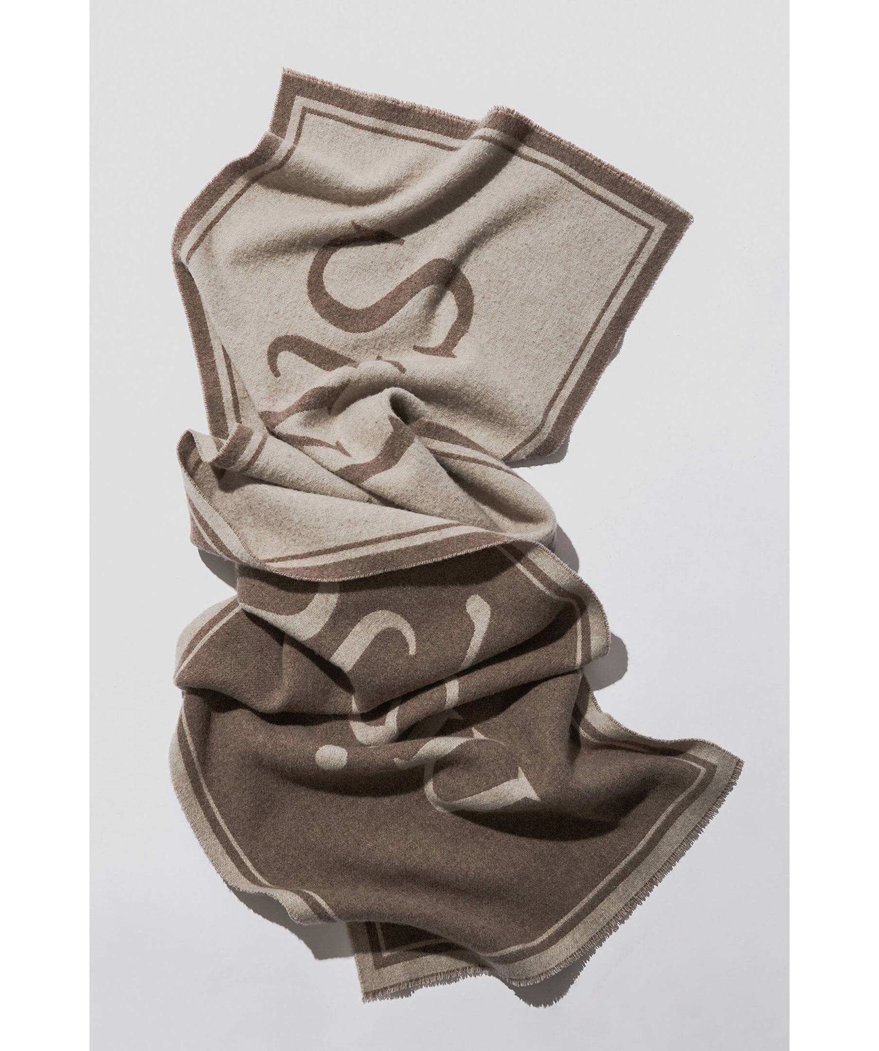 Beige och brun, finstickad halsduk från Stylein. Två stora Stylein-logotyper centrerade på varje sida. Den är gjord av mjuk ullblandning. Styla över din jacka under höst och vinter eller bär den inne under kallare kontorsdagar för en varm och chic vardagslook. Bredd: 50 cm, Längd: 200 cm.