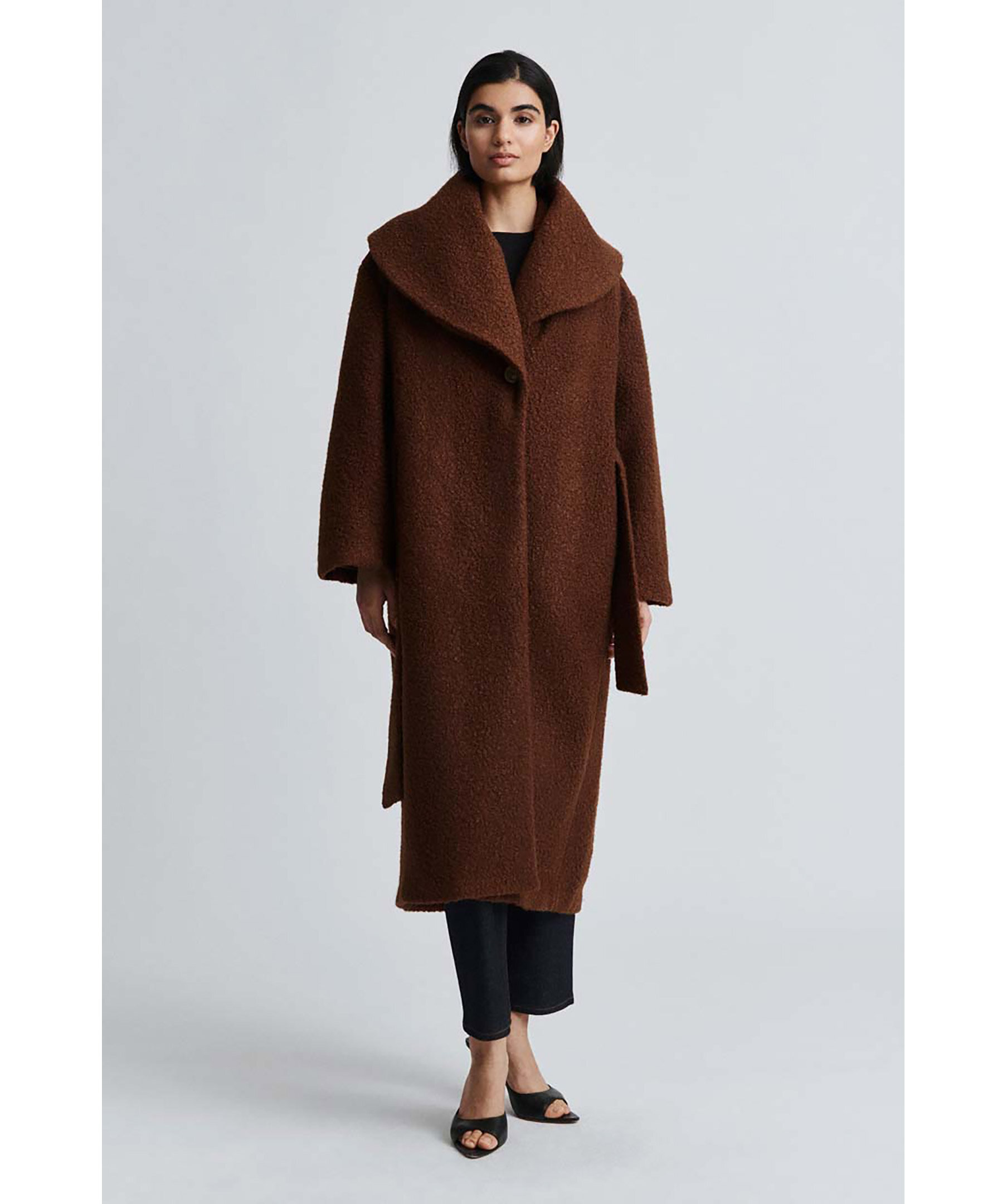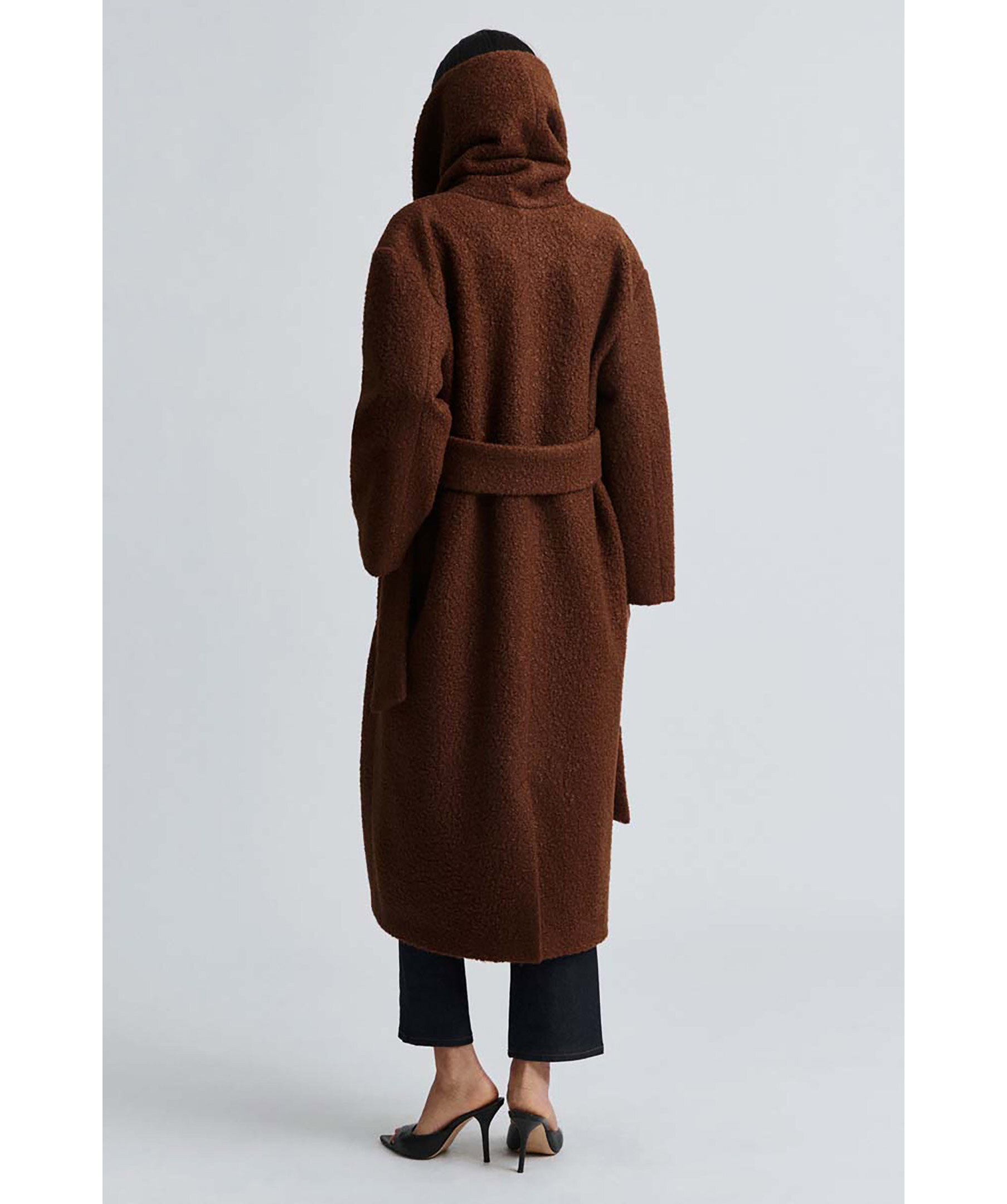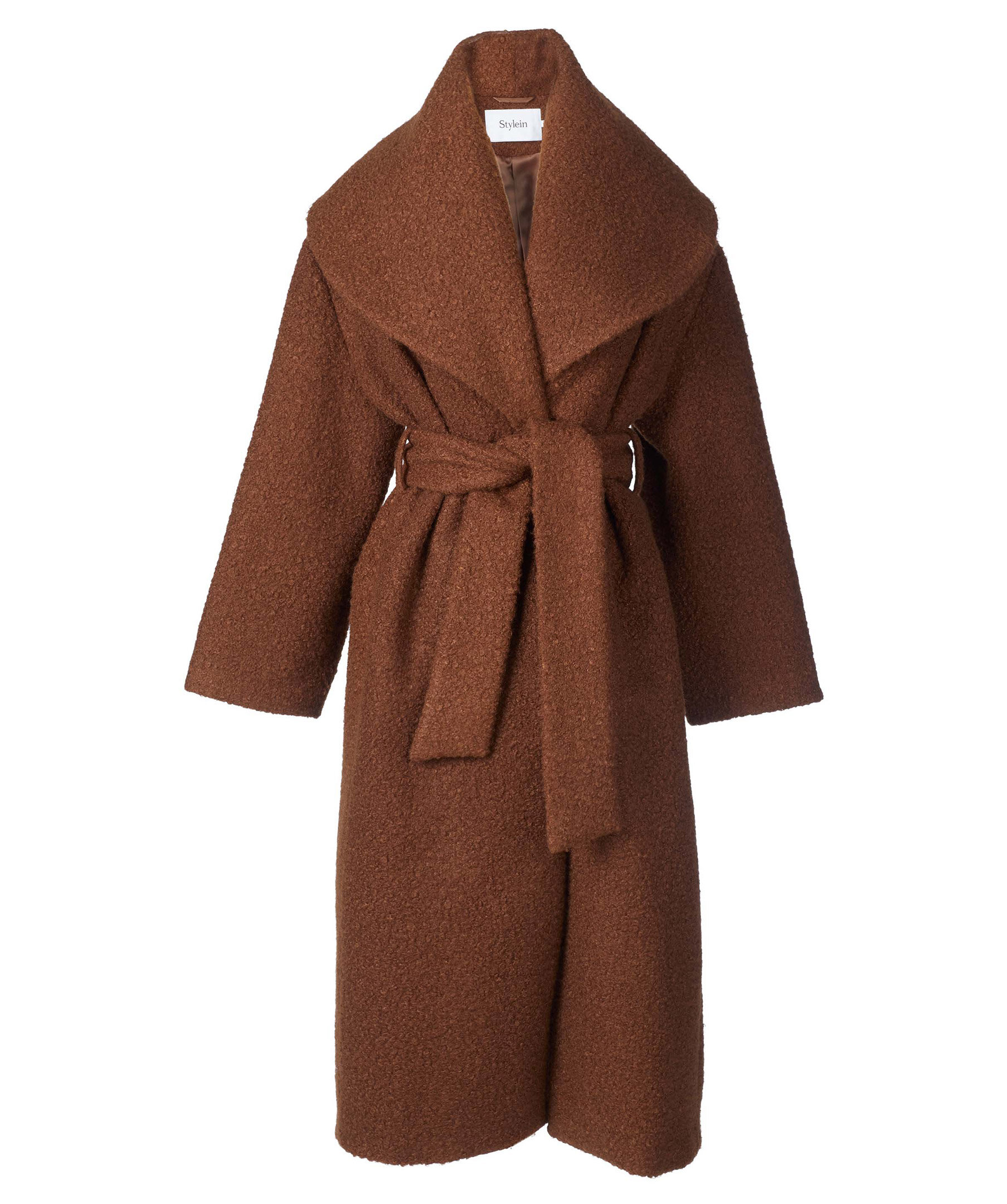 Brun kappa med vadlång längd och långa ärmar från Stylein. Sjalkrage i ett stycke, fickor i sidorna och ett avtagbart skärp med öglor i midjan. Modellen är 177 cm och bär storlek S.