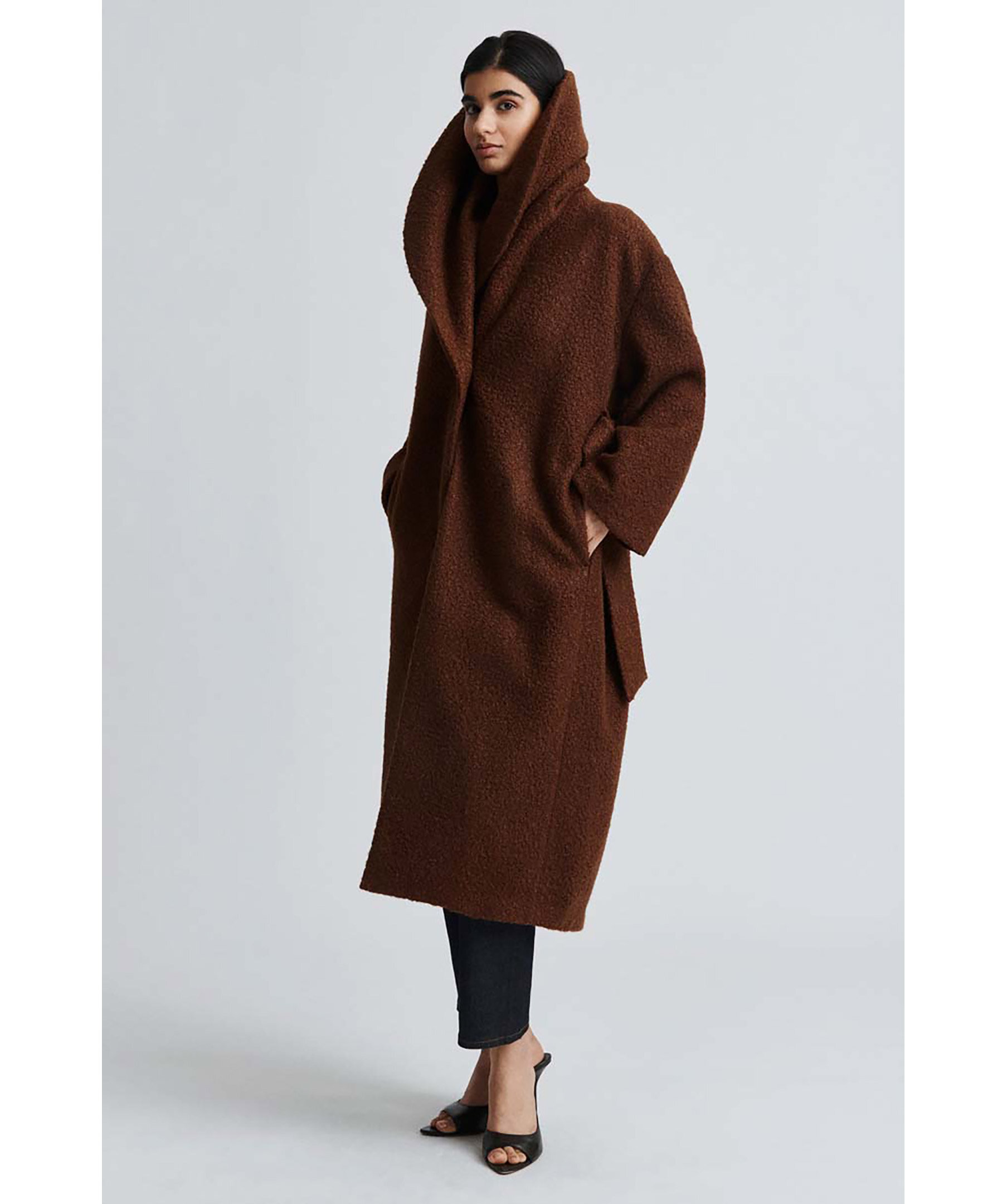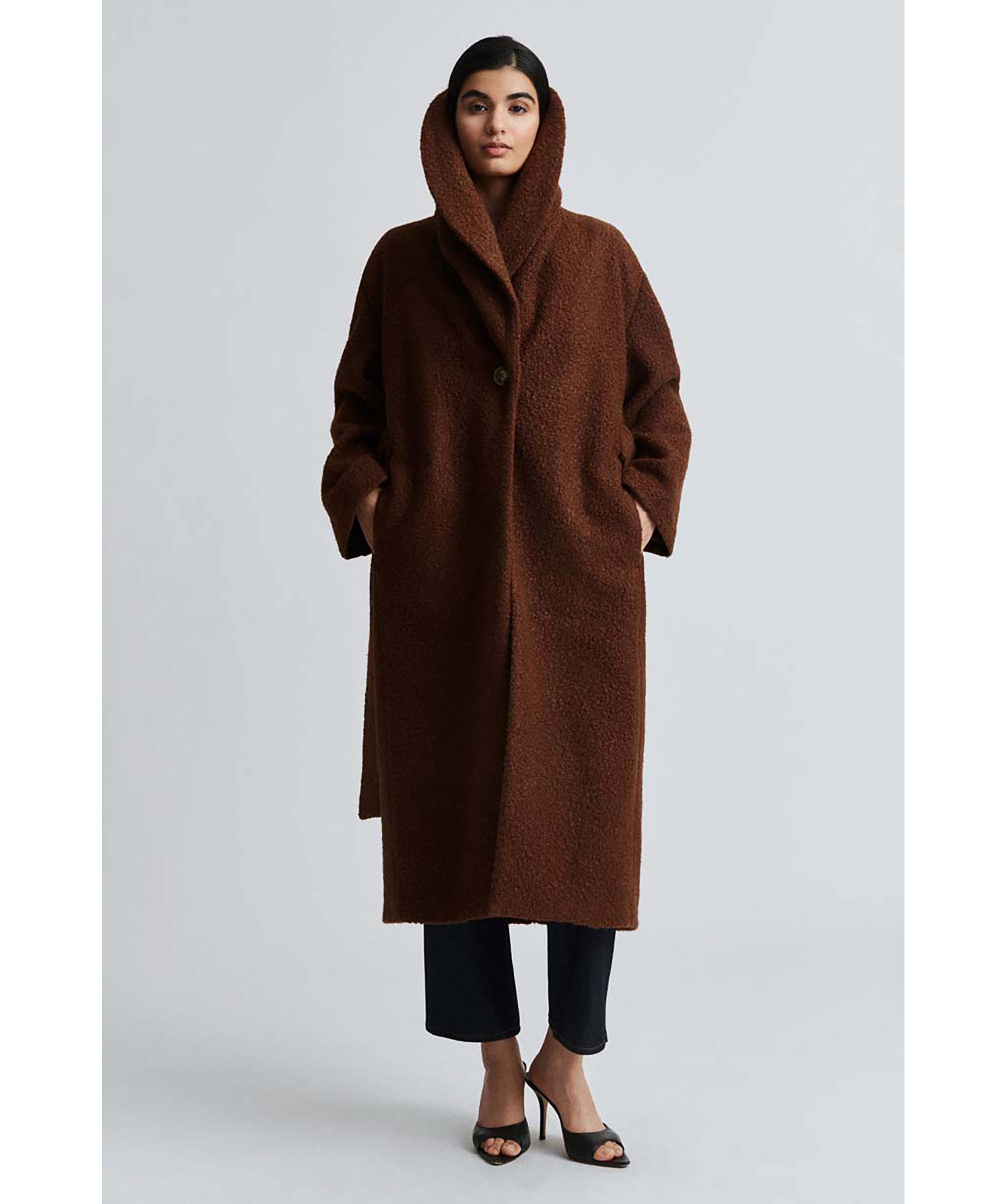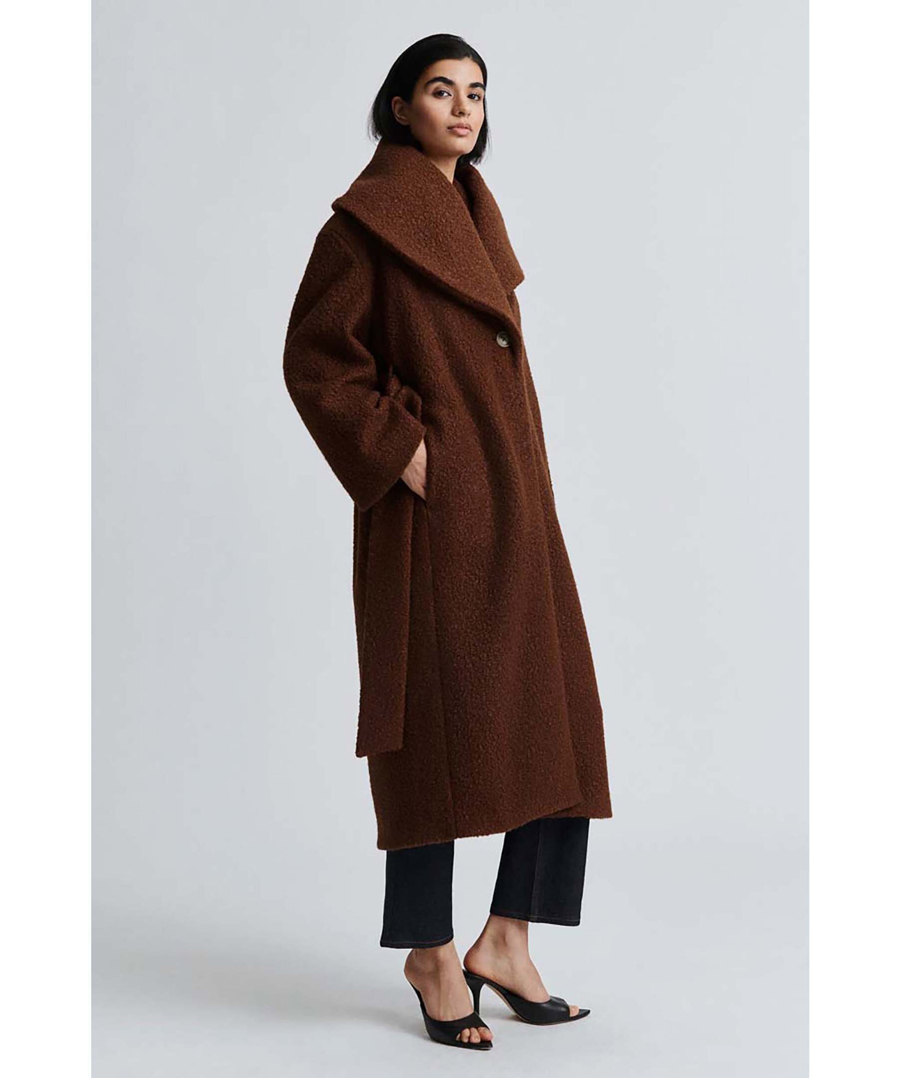 Brun kappa med vadlång längd och långa ärmar från Stylein. Sjalkrage i ett stycke, fickor i sidorna och ett avtagbart skärp med öglor i midjan. Modellen är 177 cm och bär storlek S.