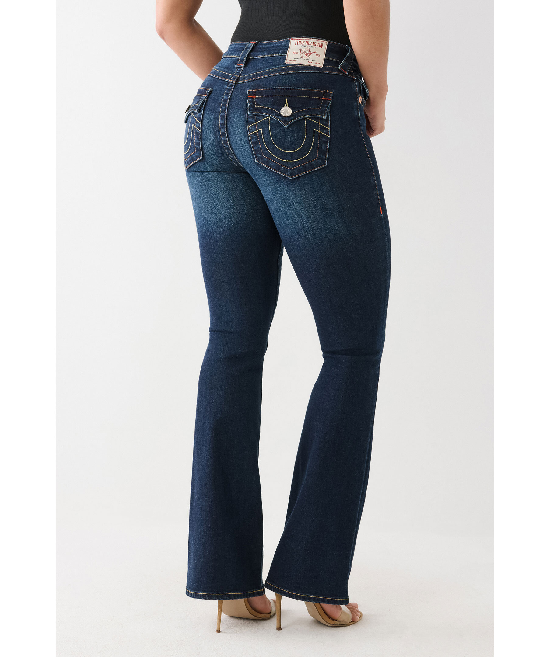 Jeans i färgen Muddy Waters från True Religion i bootcut modell. Mellanhög midja med bälteshällor. Två framfickor och en liten myntficka med knapp samt två bakfickor med lock och knapp. Subtil blekning och flerfärgade sömmar. Hästsko formade sömmar på bakfickorna. Tillverkade i en bomullsblandning.