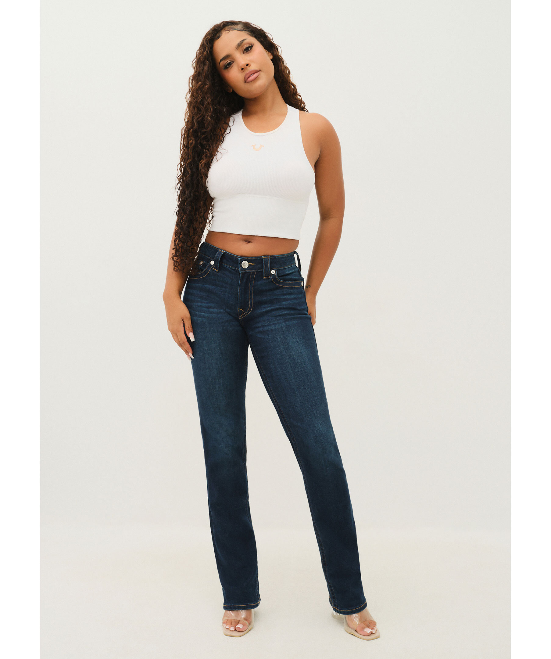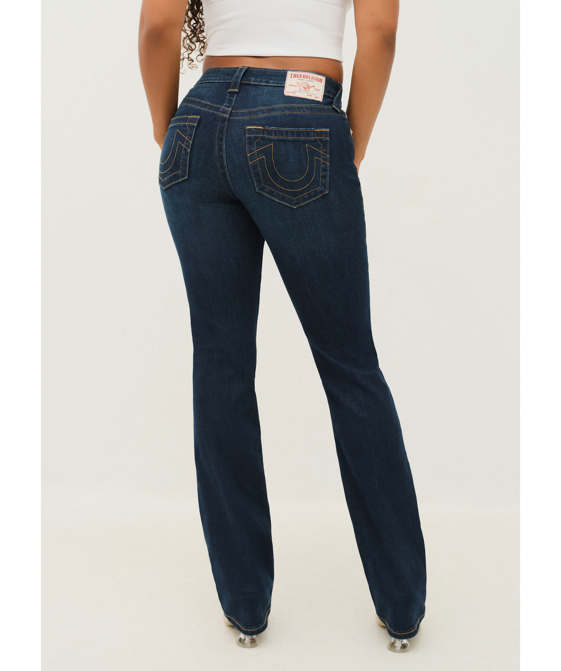 Mörkblå jeans från True Religion. Mellanhög midja med bälteshällor. Två framfickor och en liten myntficka samt två bakfickor. Hästskosömmar på bakfickorna. Tillverkade i en bomullsblandning.