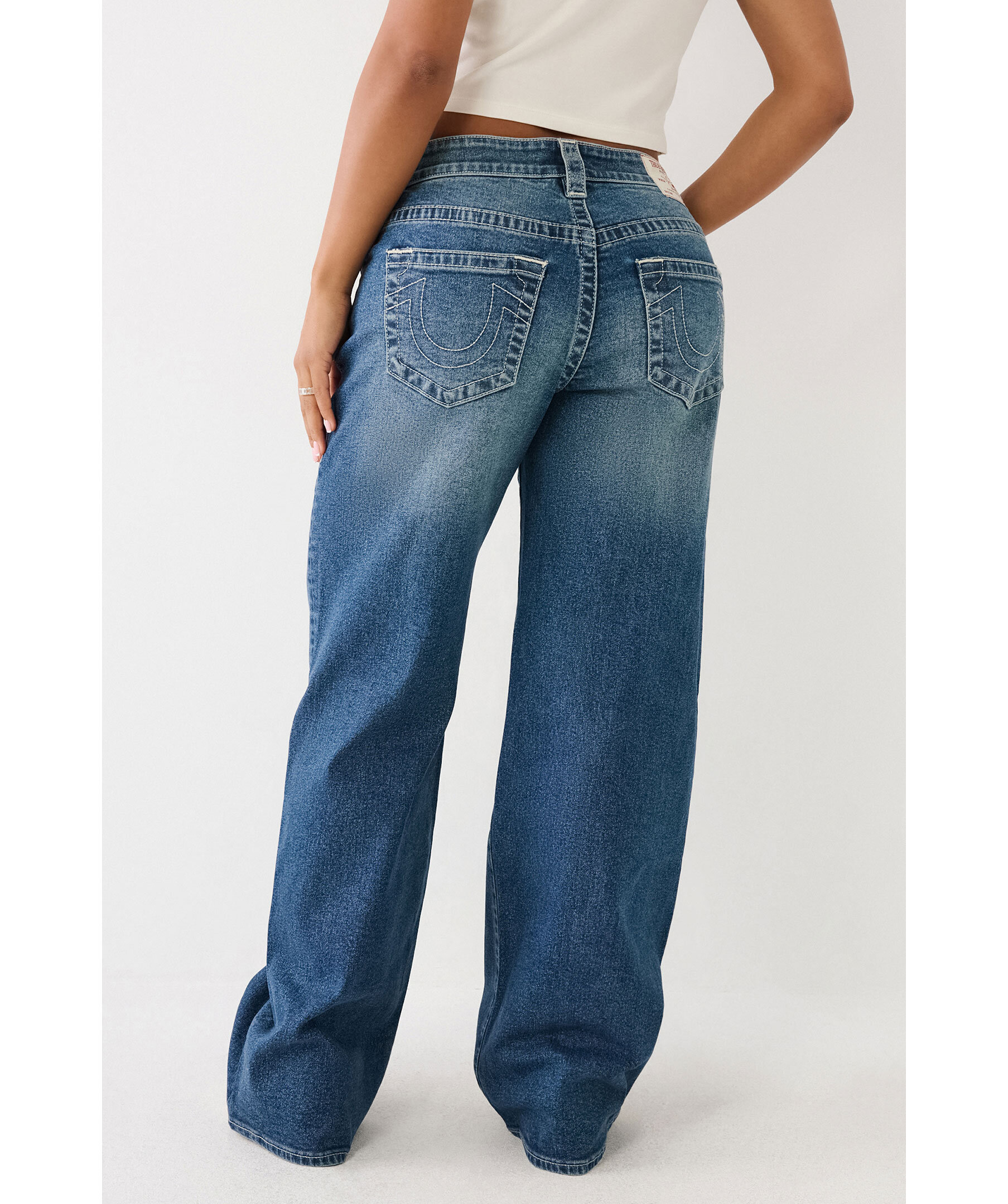 Mörkblåa jeans från True Religion. Jeansen har en avslappnad passform, bälteshällor i midjan, fem fickor och kontrasterande sömmar samt hästskodetaljer på bakfickorna. Tillverkade i en bomullsblandning.
