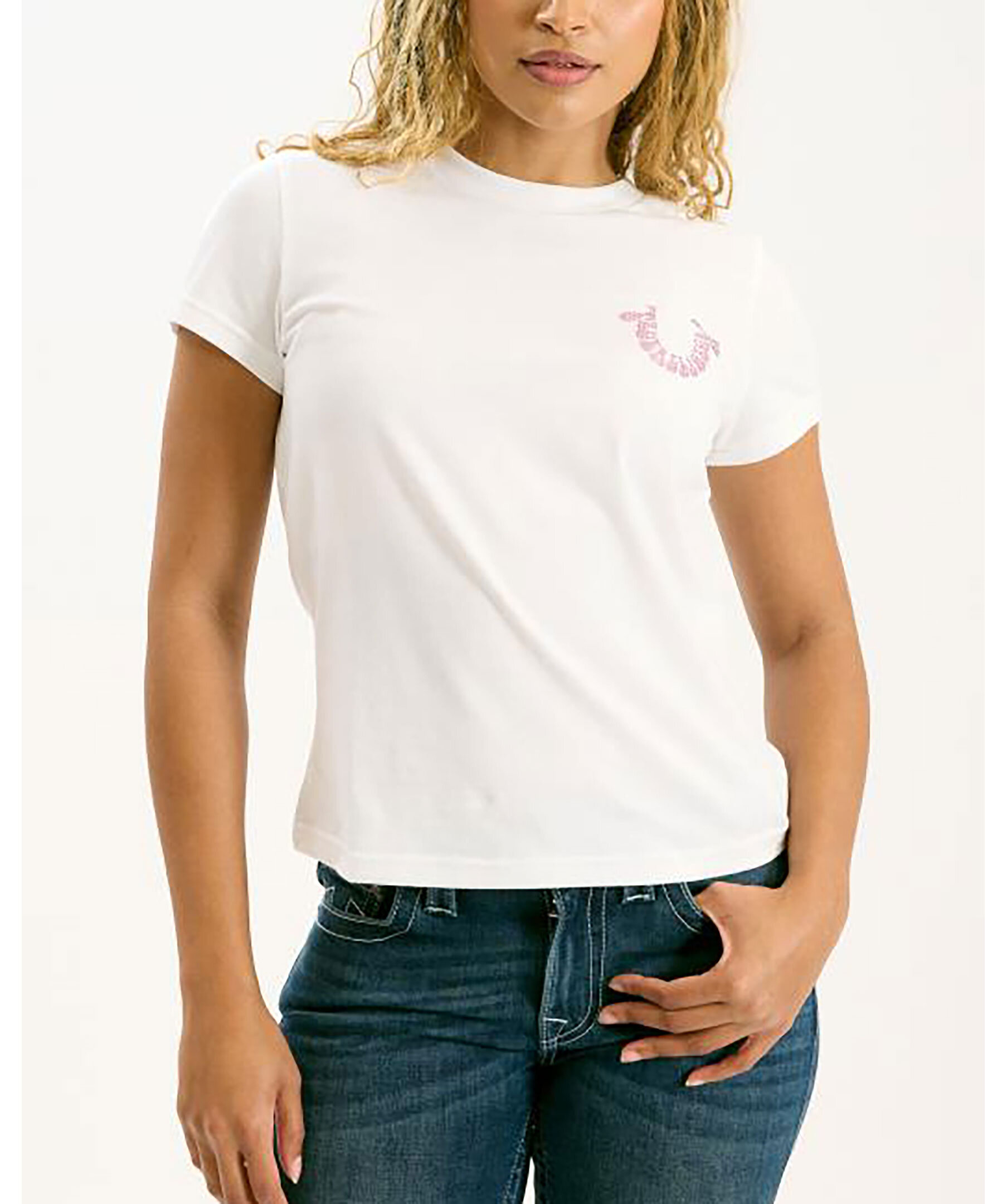 Vit t-shirt från True Religion. T-shirten har rundad halsringning och en rosa hästsko-logotyp med strasstenar på bröstet. Tillverkad i en bomullsblandning.