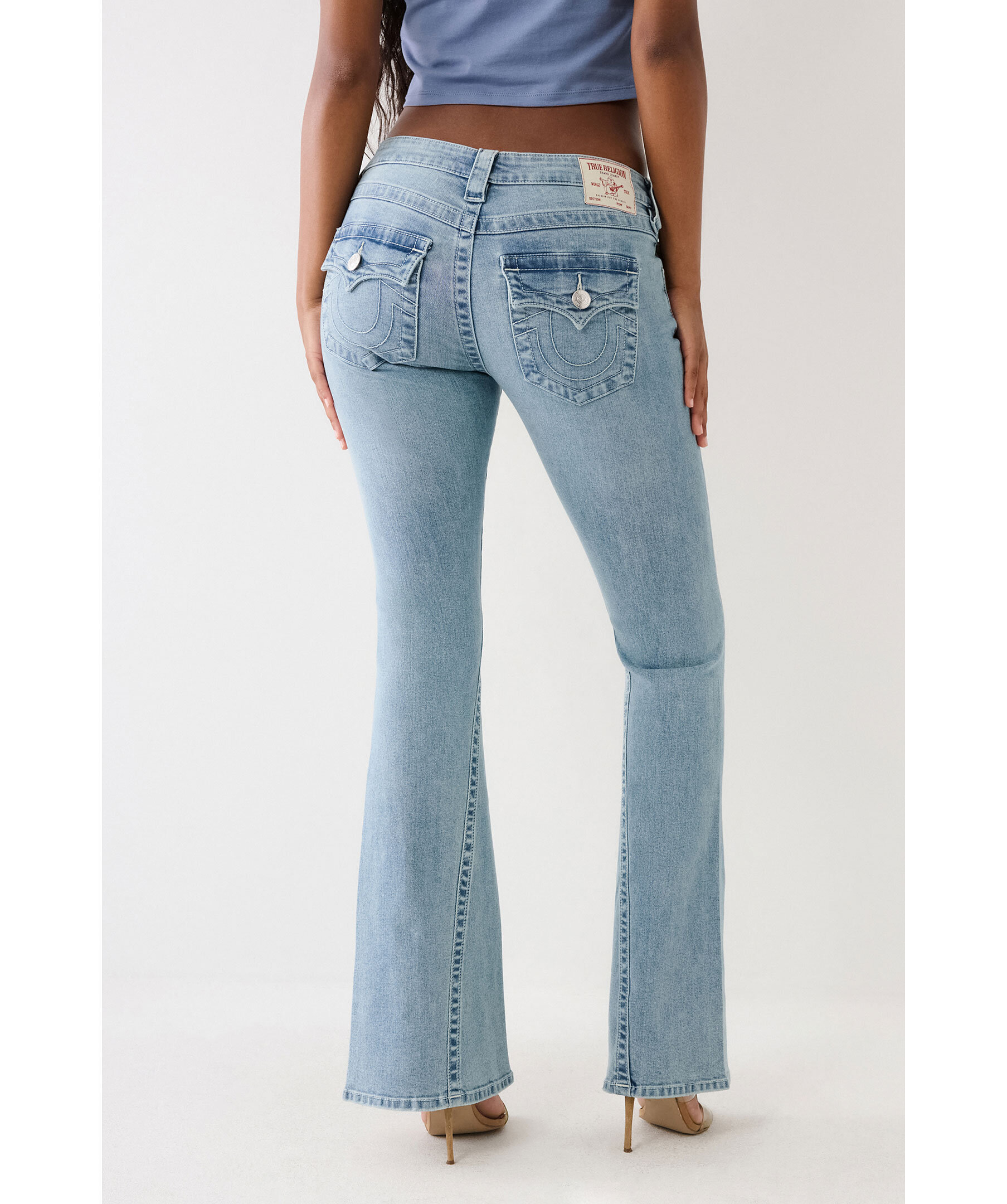 Jeans i färgen Peak Spot från True Religion med utsvängda ben. Låg midja med bälteshällor. Två framfickor och en liten myntficka med knapp samt två bakfickor med lock och knapp. Subtil blekning och vita sömmar. Hästsko formade sömmar på bakfickorna samt deras ikoniska vridna innersömmar. Tillverkade i en bomullsblandning.
