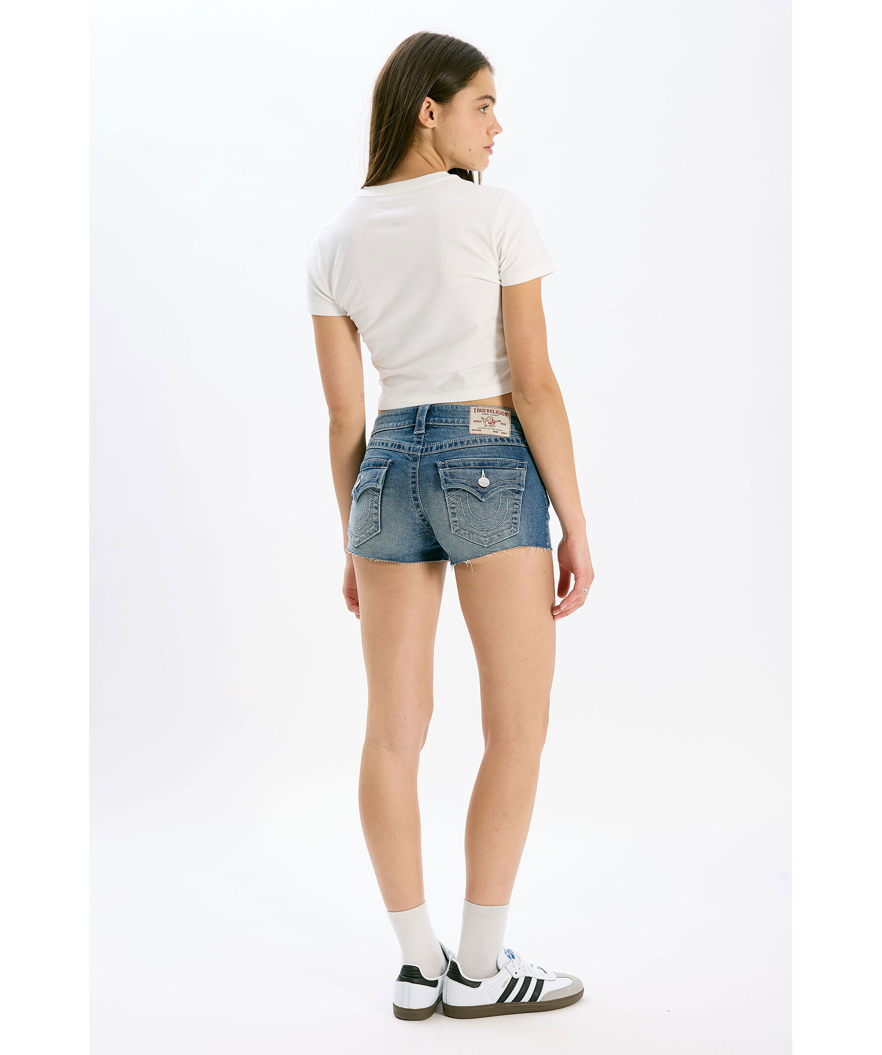 Blåa jeanshorts från True Religion. Shortsen har en låg midja med bälteshällor, fem fickor samt fransar vid benslut. Tillverkade i en bomullsblandning.