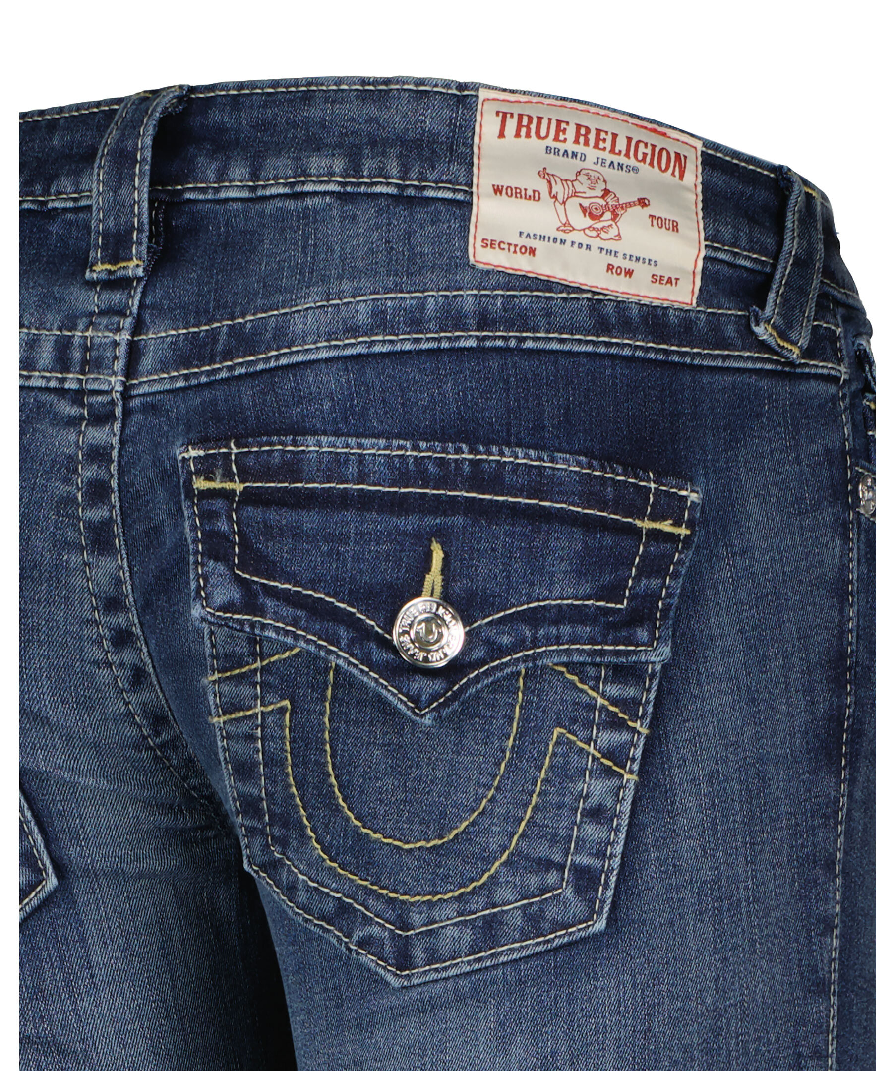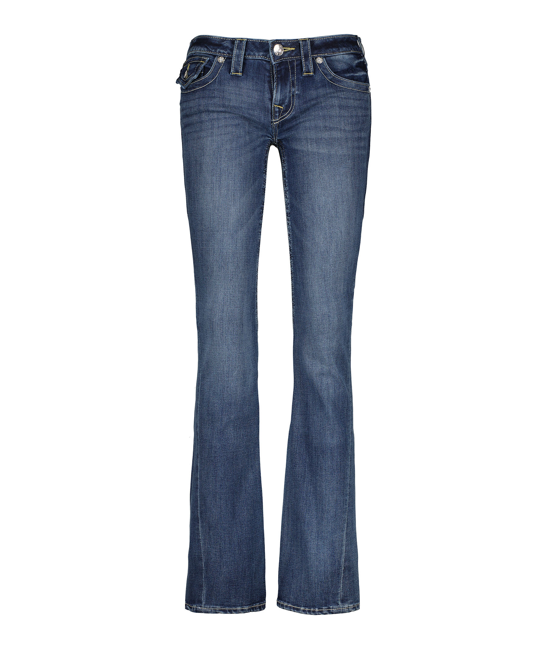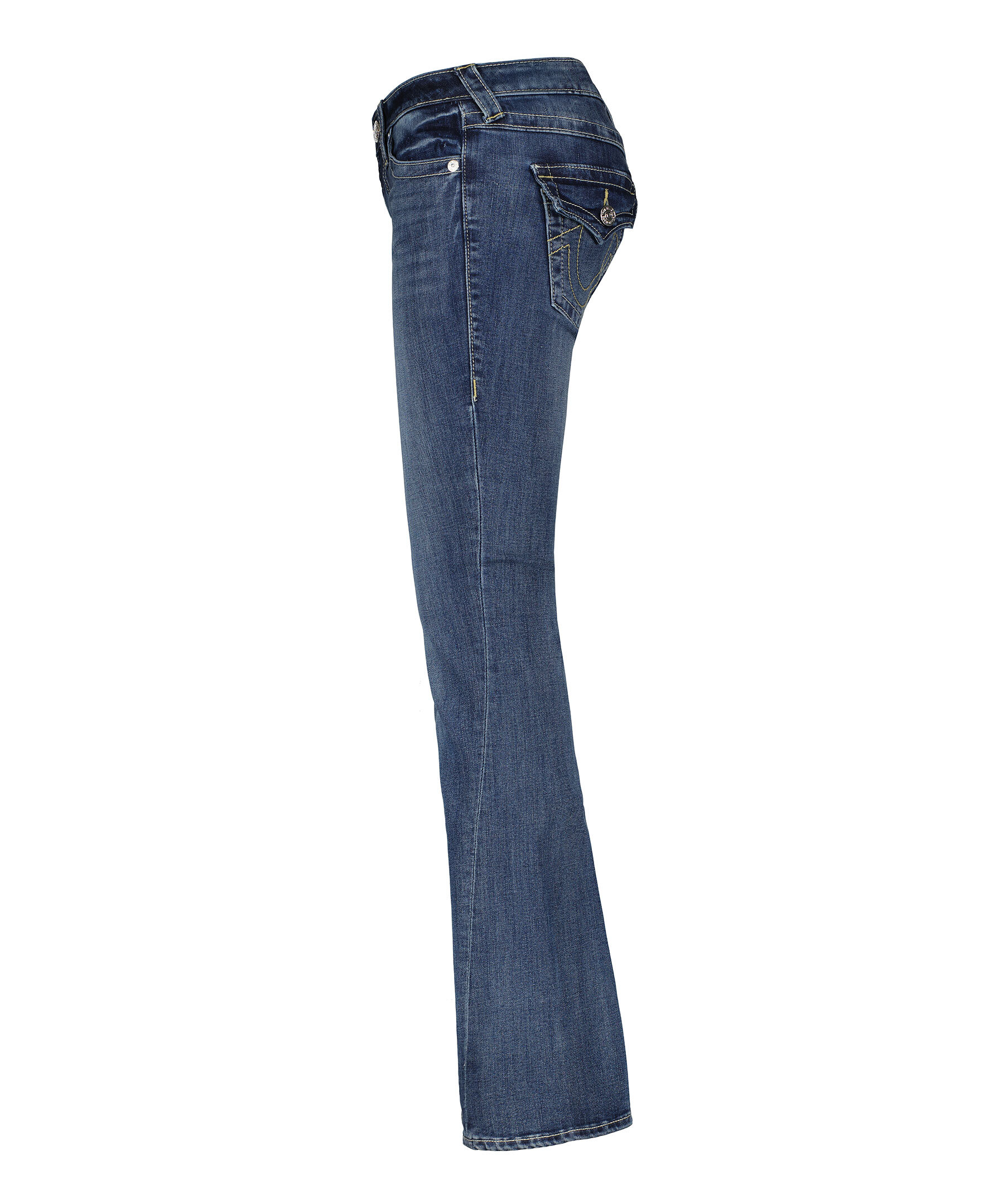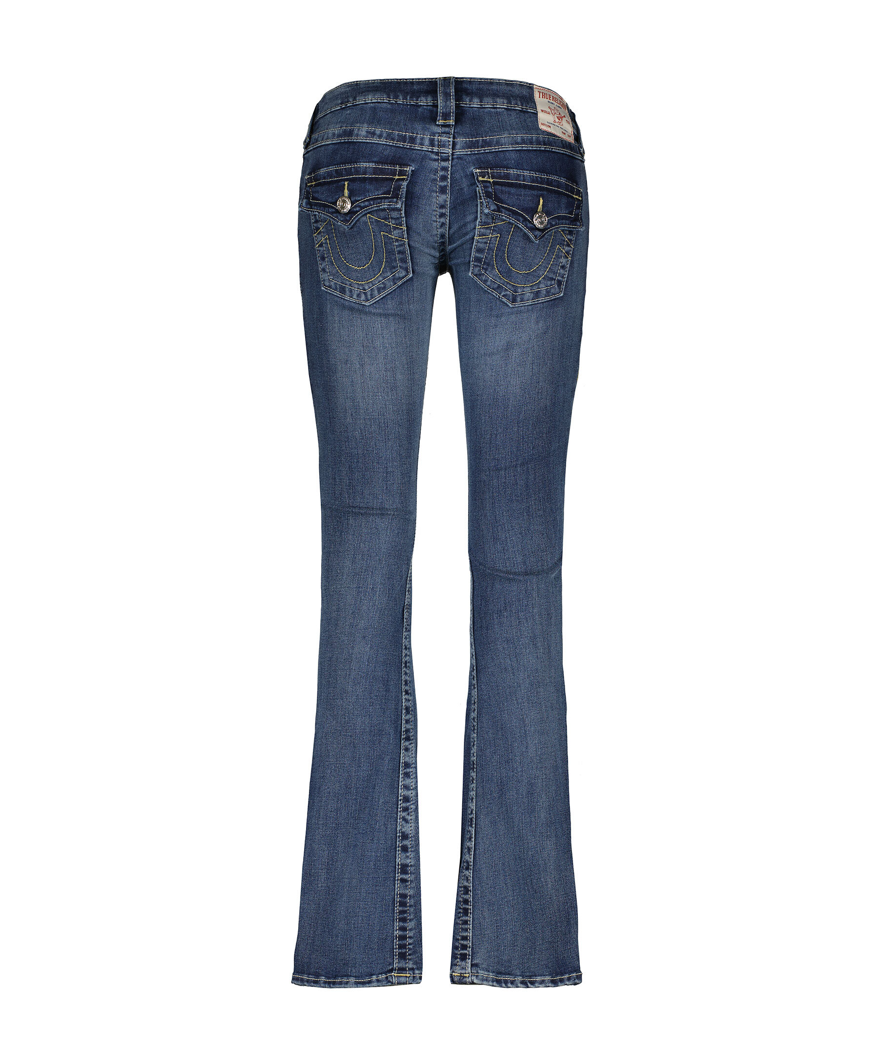 Jeans i färgen Naida från True Religion med utsvängda ben. Låg midja med bälteshällor. Två framfickor och en liten myntficka med knapp samt två bakfickor med lock och knapp. Subtil blekning och hästsko formade sömmar på bakfickorna samt deras ikoniska vridna innersömmar. Tillverkade i en bomullsblandning.