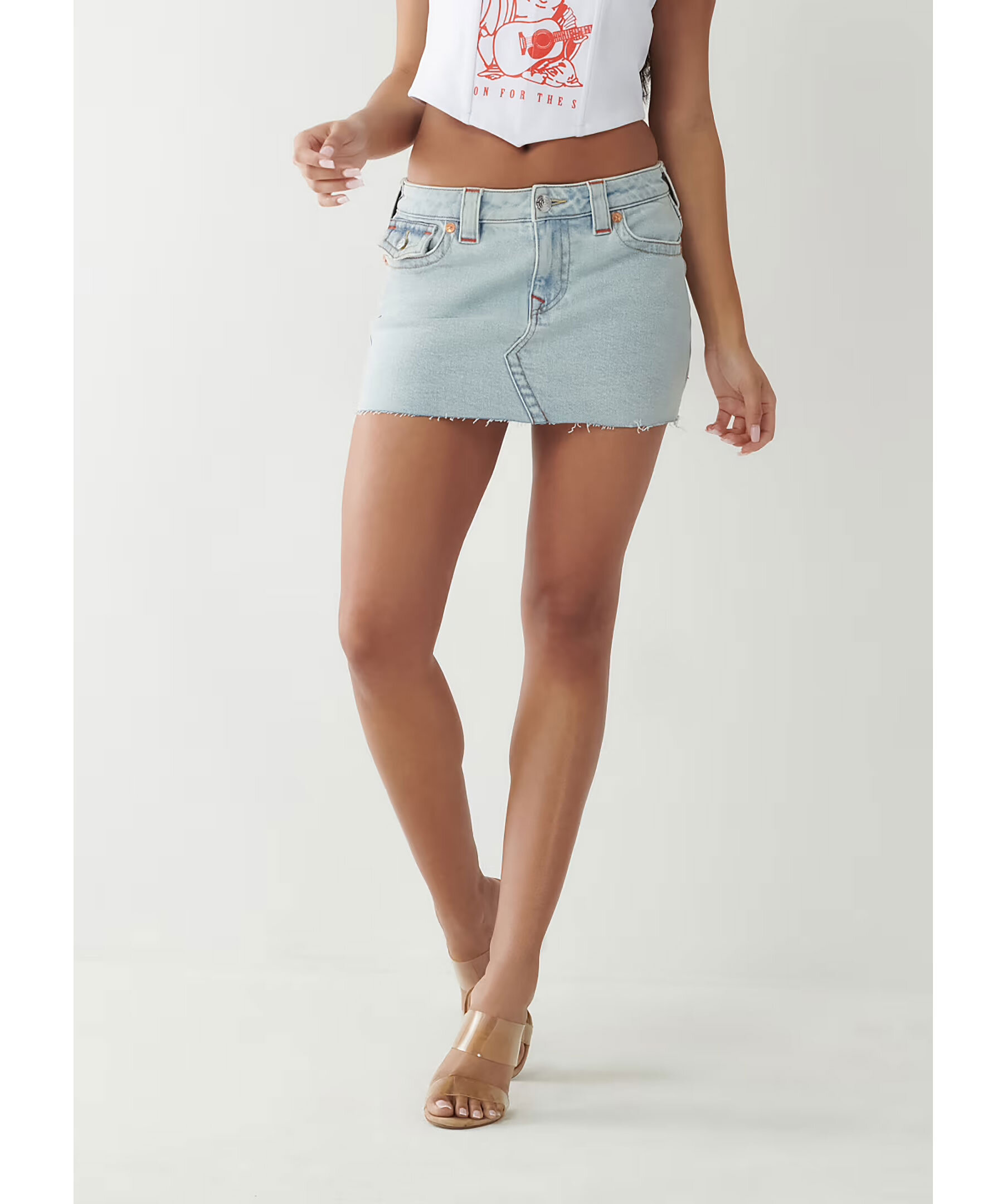 Minikjol i denim i färgen Luminous Night från True Religion. Kjolen har en avklipps look nedtill, bälteshällor i midjan, två framfickor och en liten myntficka med knapp samt två bakfickor med lock och knapp. Färgglada, hästsko formade sömmar på bakfickorna. Tillverkad i en bomullsblandning.