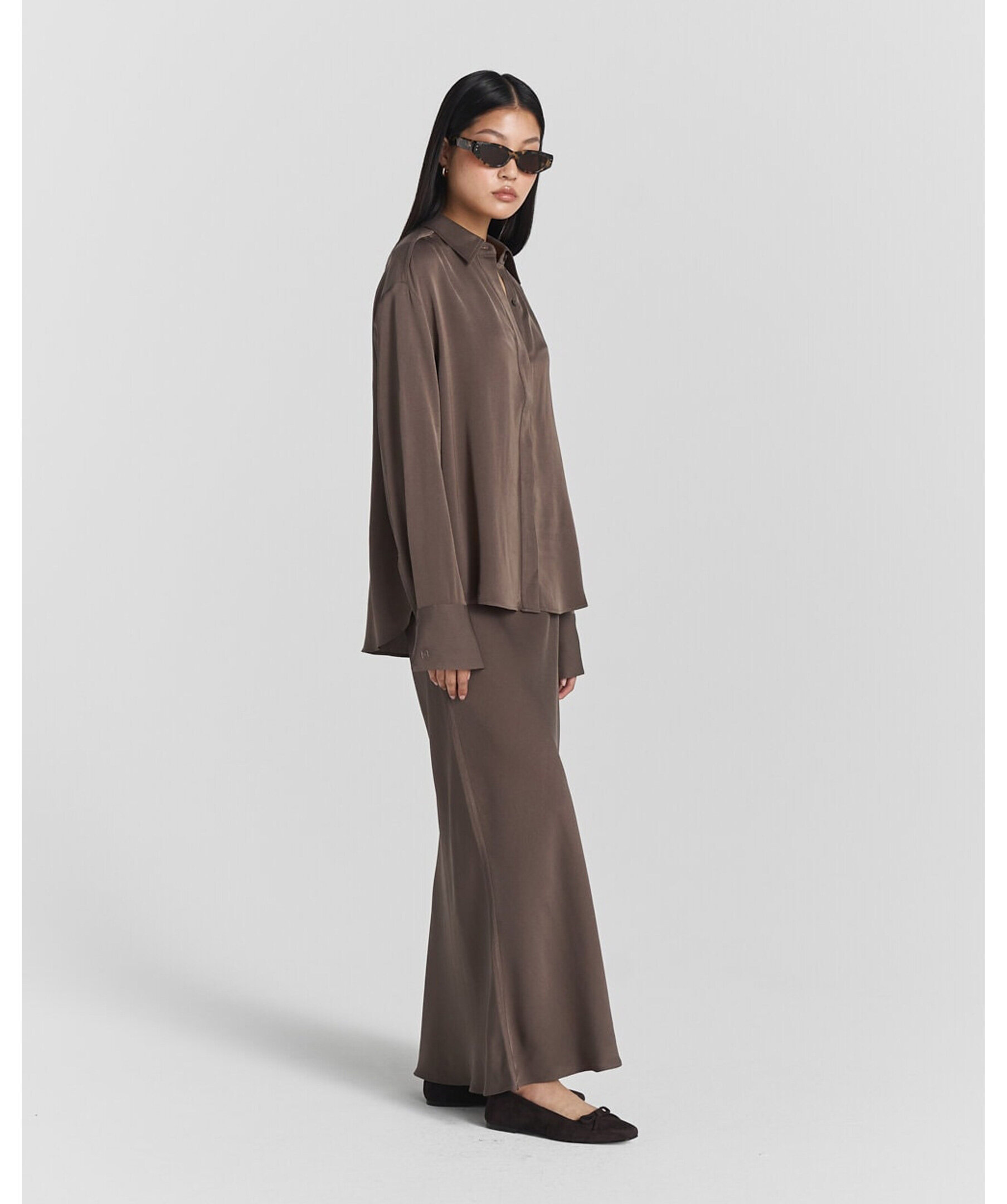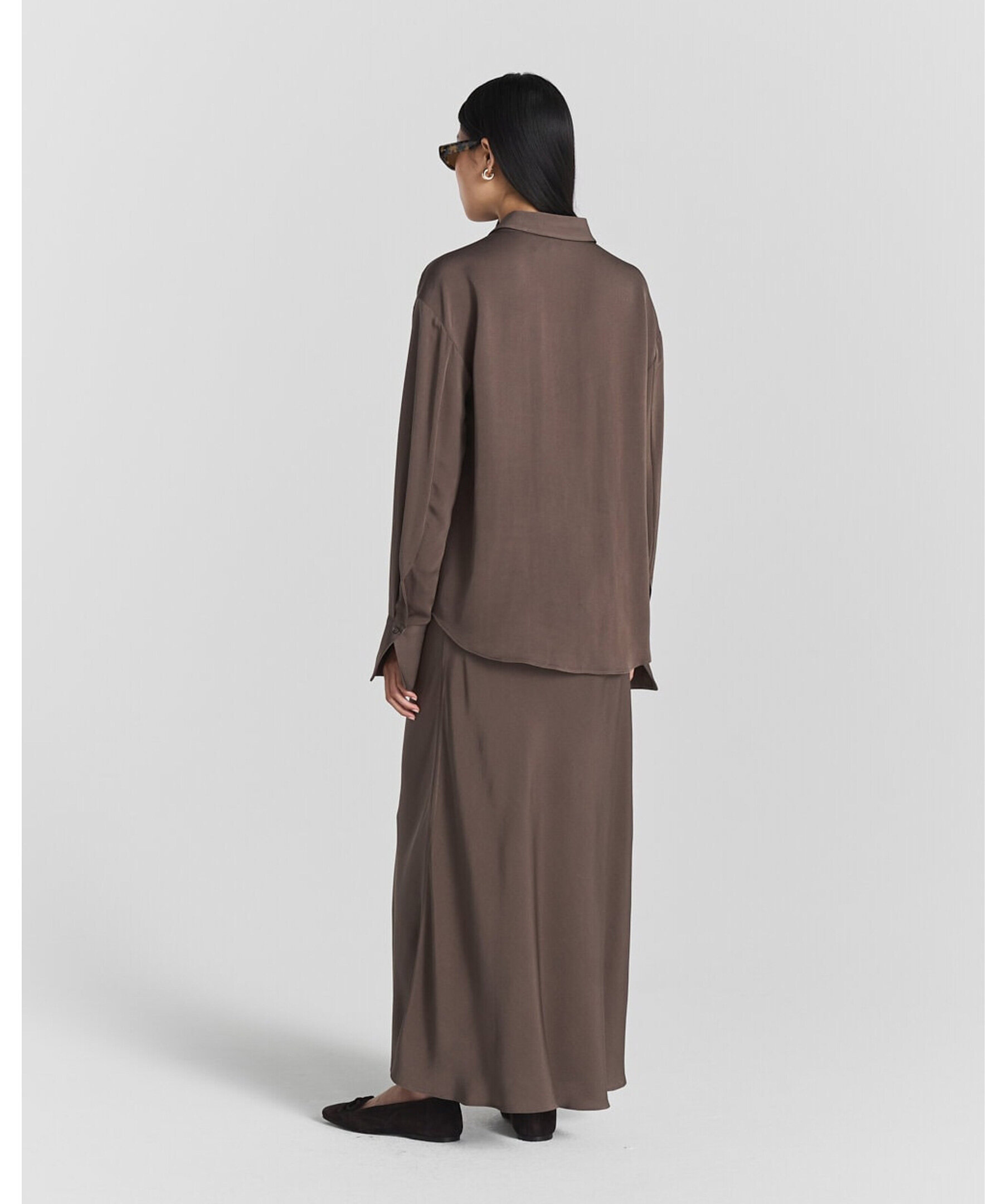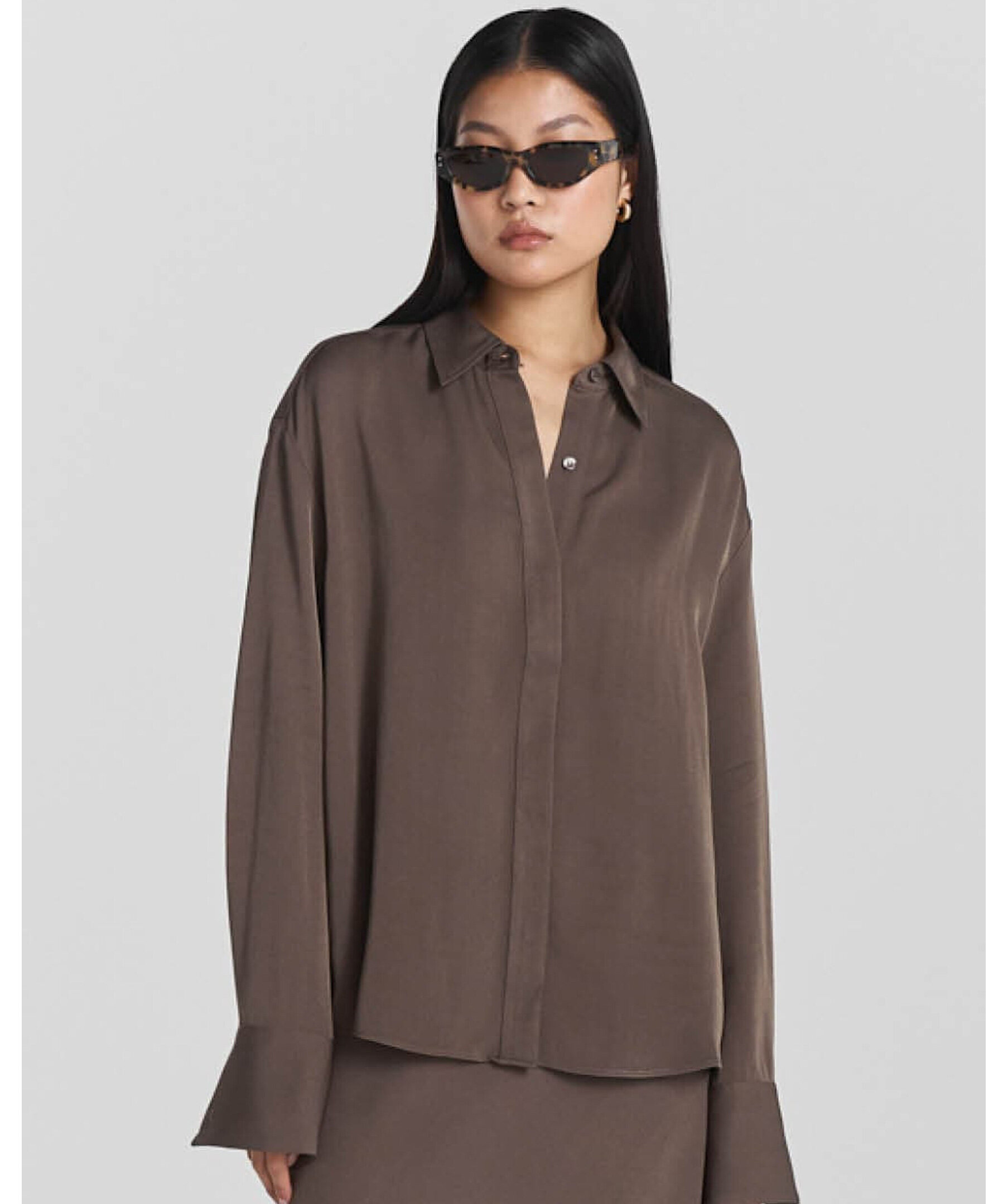 Långärmad brun satinblus från Twist & Tango i mjuk och flytande viscose som draperar elegant. Blusen har klassisk krage och långa ärmar med knäppta manschetter — perfekt att bära både till vardags och till fest.