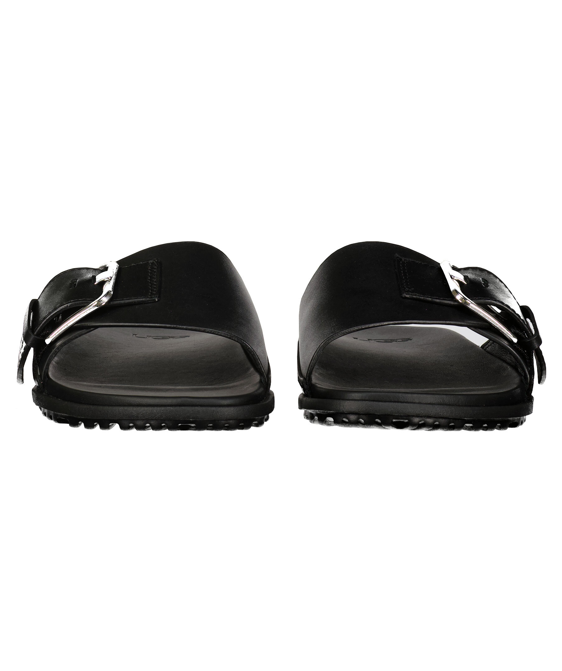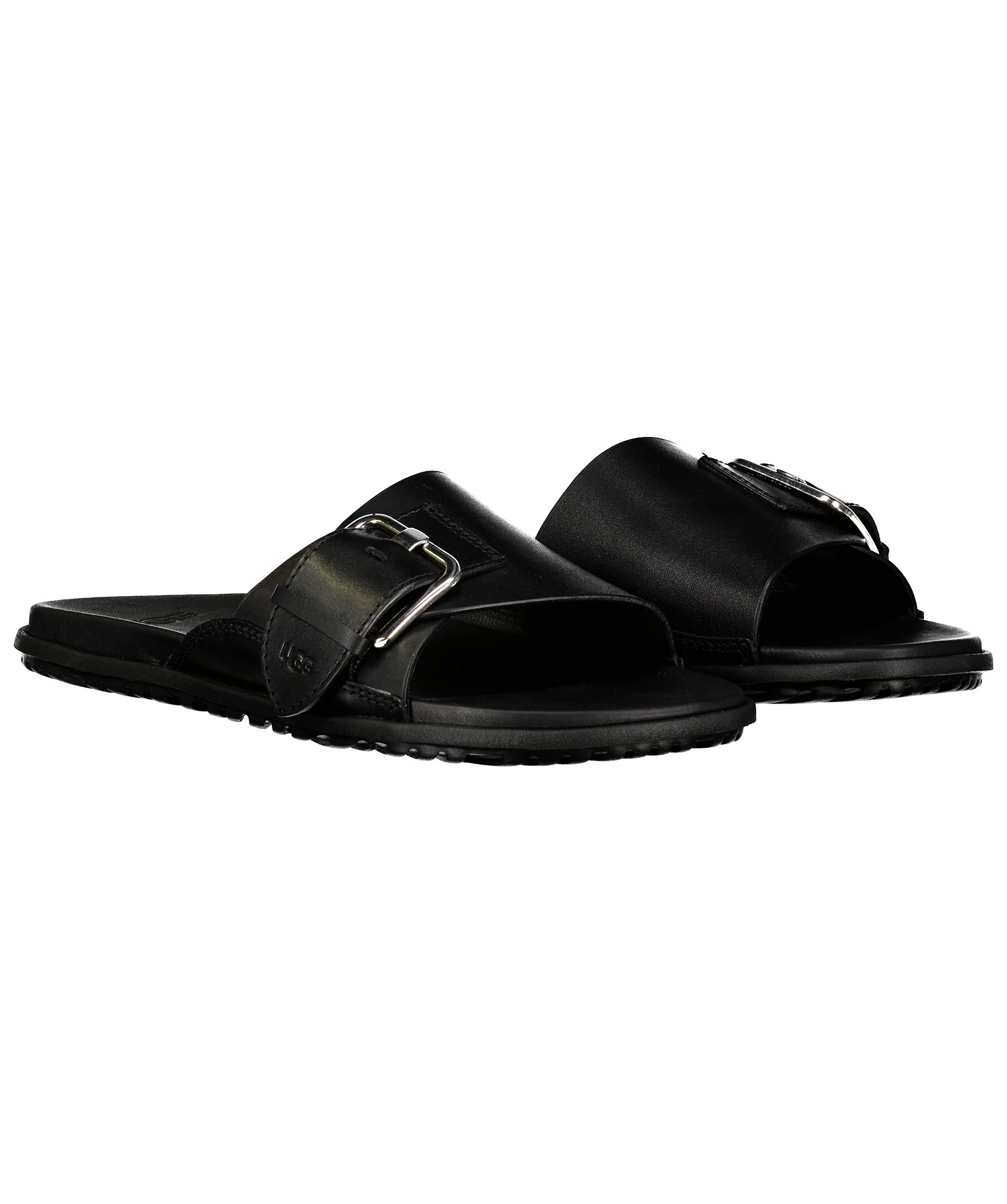 Svarta tofflor med spänne från Ugg. Tillverkad i läder och gummi. spänne i metall, embossad logotyp på remmen.
