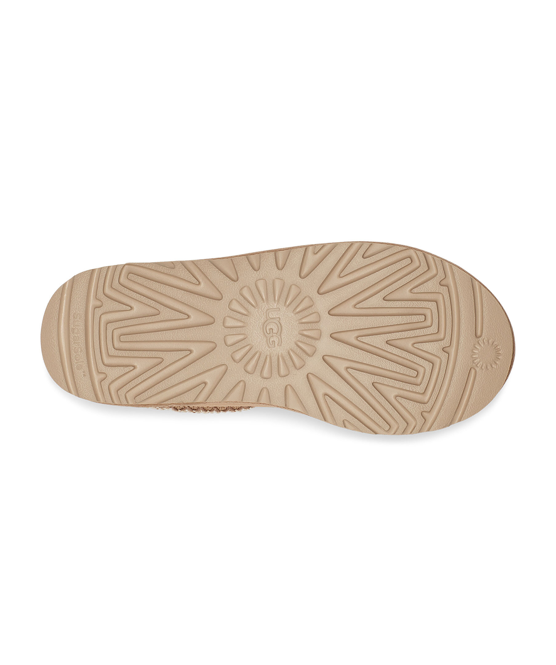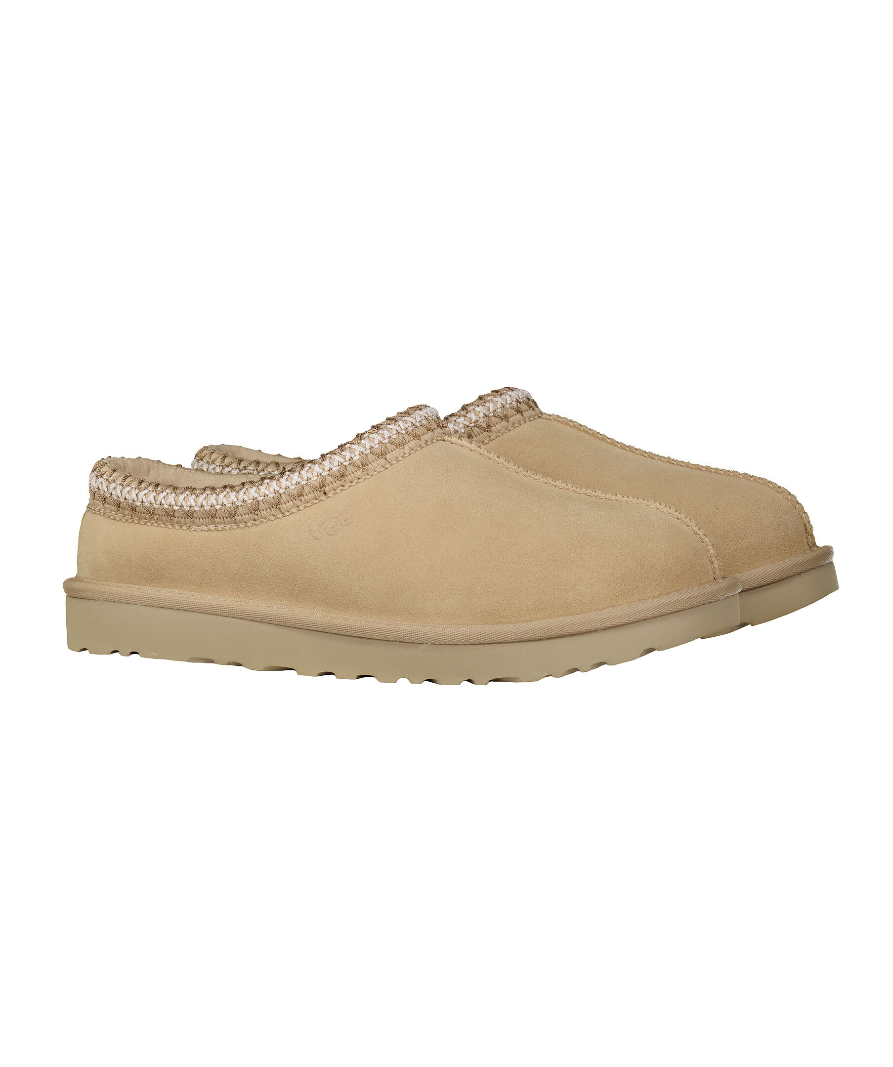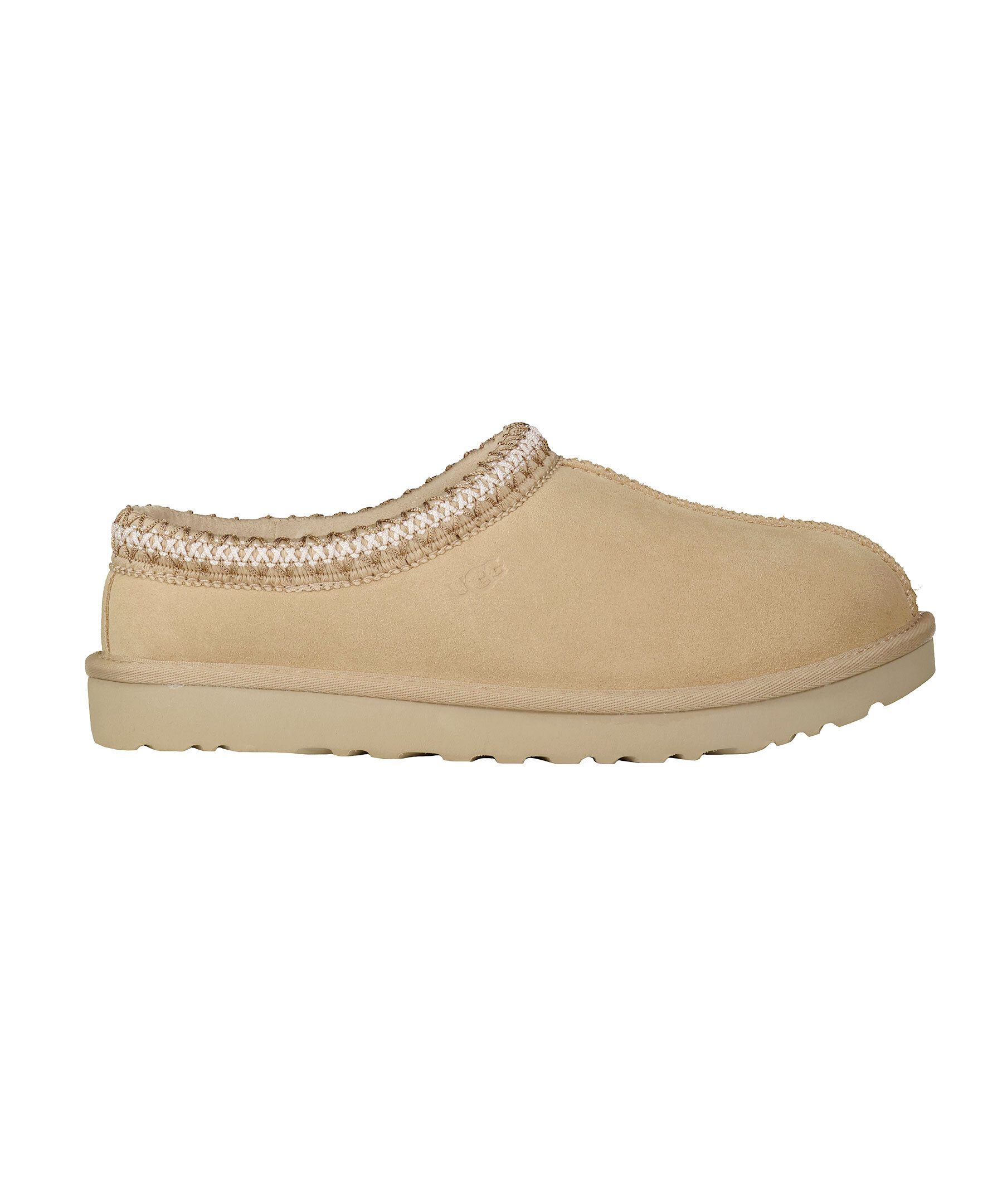 Ljusbeigea tofflor i mocka från UGG. Fodrade med mjuk ull. Flätat mönster vid tofflans öppning. Skon passar utmärkt att använda till ute- och inomhusbruk. Sulan är den klassiska lätta UGG sulan. De är inte tillverkade för slaskigt och blött klimat och rekommenderas att inte användas när det är blött ute. Man behöver behandla skorna med skoimpregnering regelbundet för att skorna ska hålla längre och stå emot väta bättre.