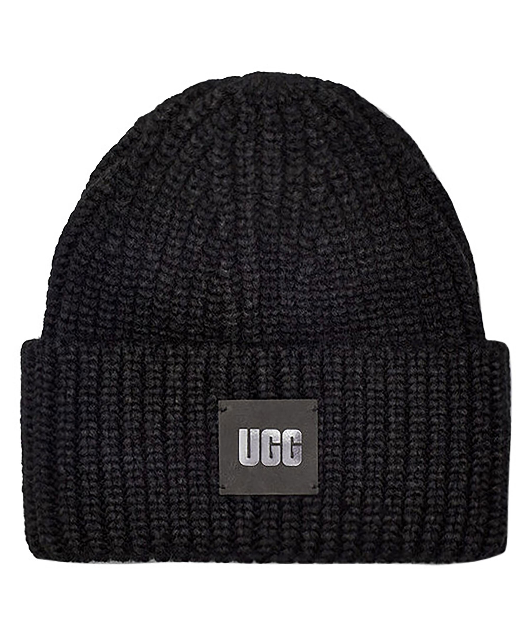 Svart, ribbstickad mössa tillverkad av en mysig ullblandning från UGG. Bred mudd, patch med logotyp i äkta läder fram.