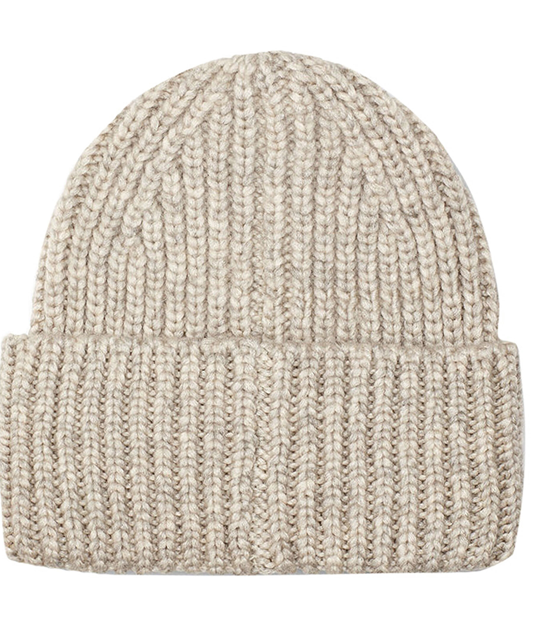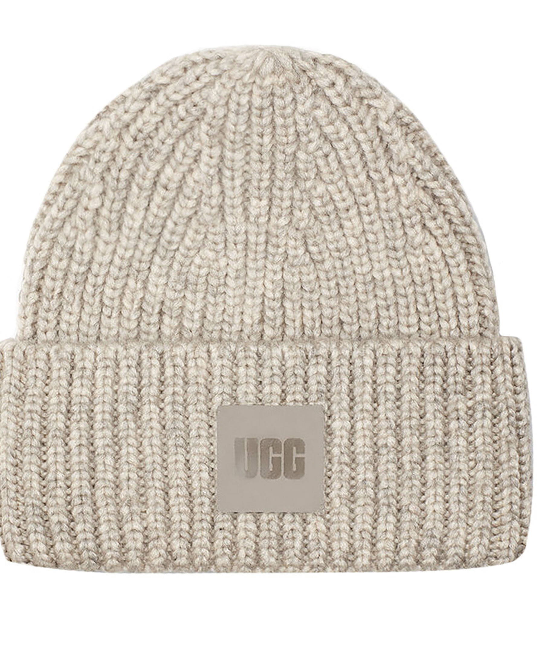 Ljusgrå, ribbstickad mössa tillverkad av en mysig ullblandning från UGG. Bred mudd, patch med logotyp i äkta läder fram.