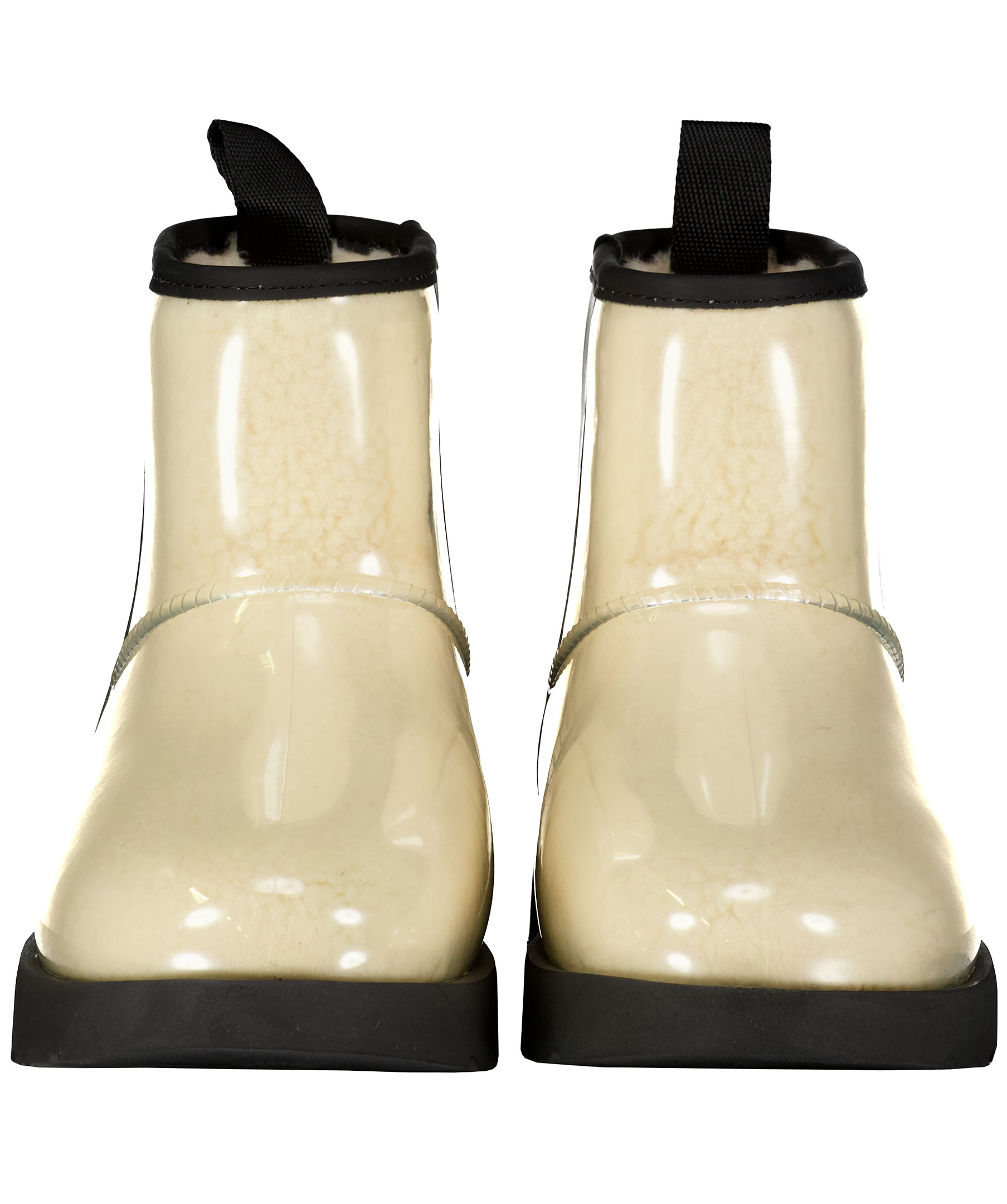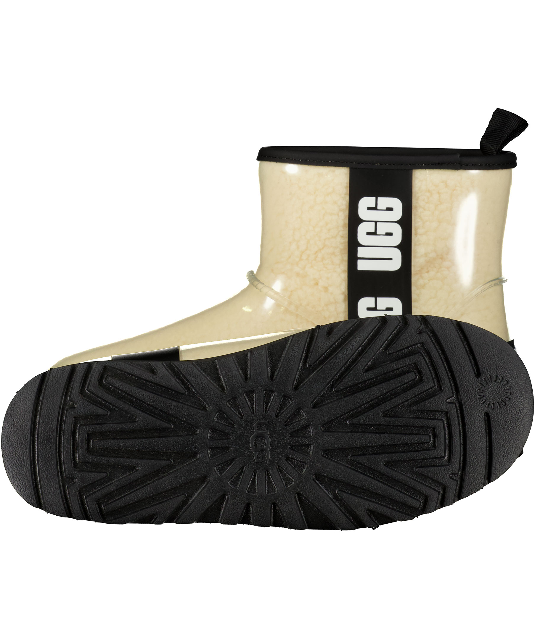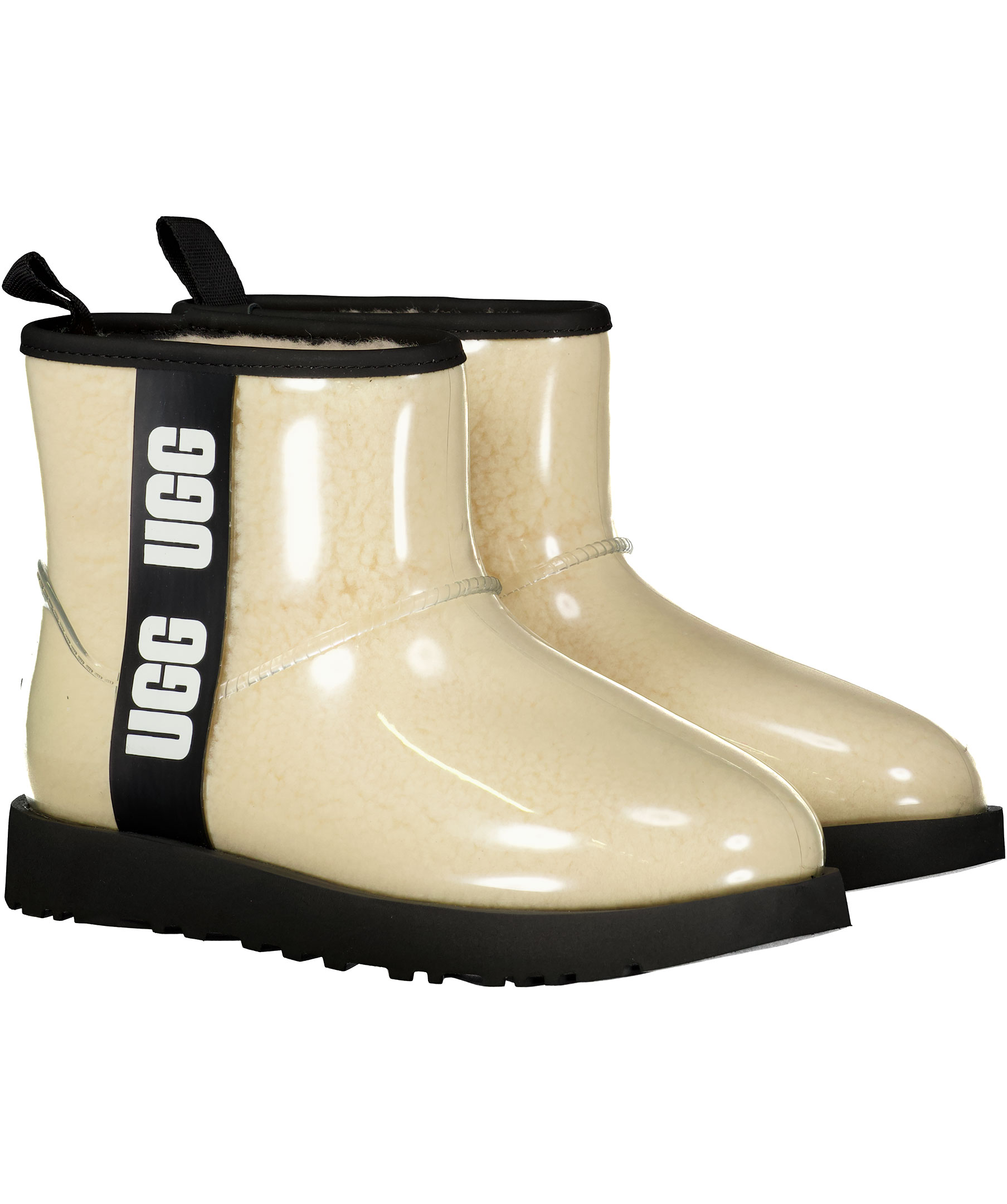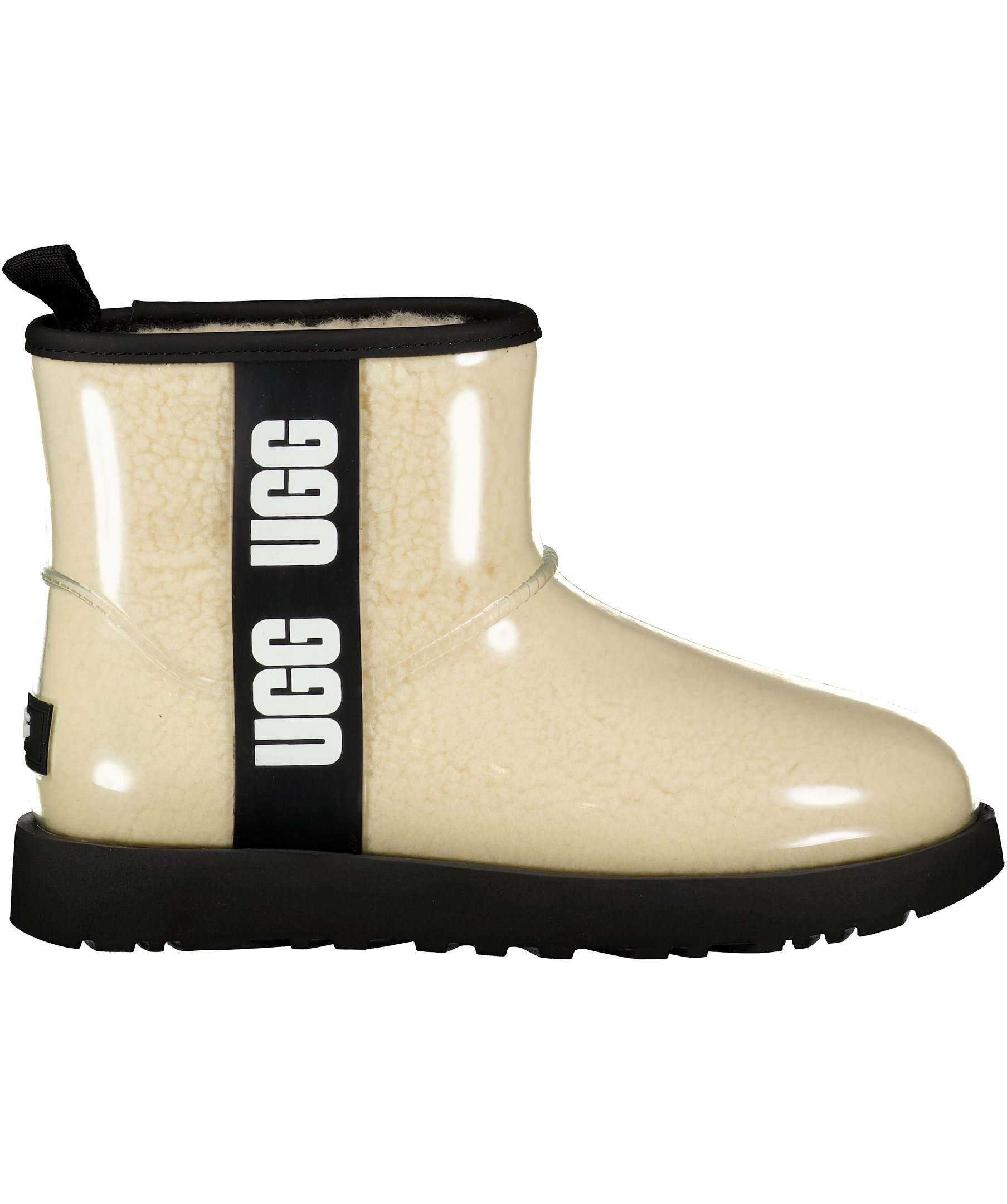 Transparenta boots från UGG där man ser det mysiga ullfodret. Svarta detaljer med UGG-text på sidan, logotyp baktill. Tillverkade i genomskinligt gummi med cremefärgat ullfoder. Väderklassificerade ned till -20° och vattentäta.
