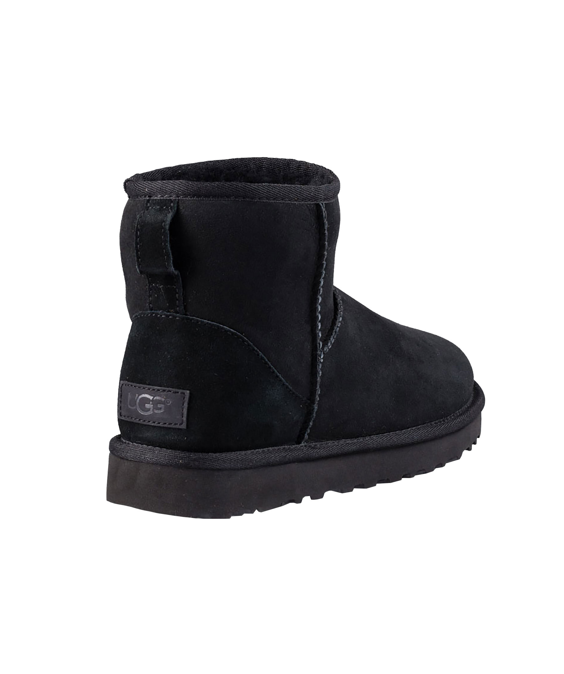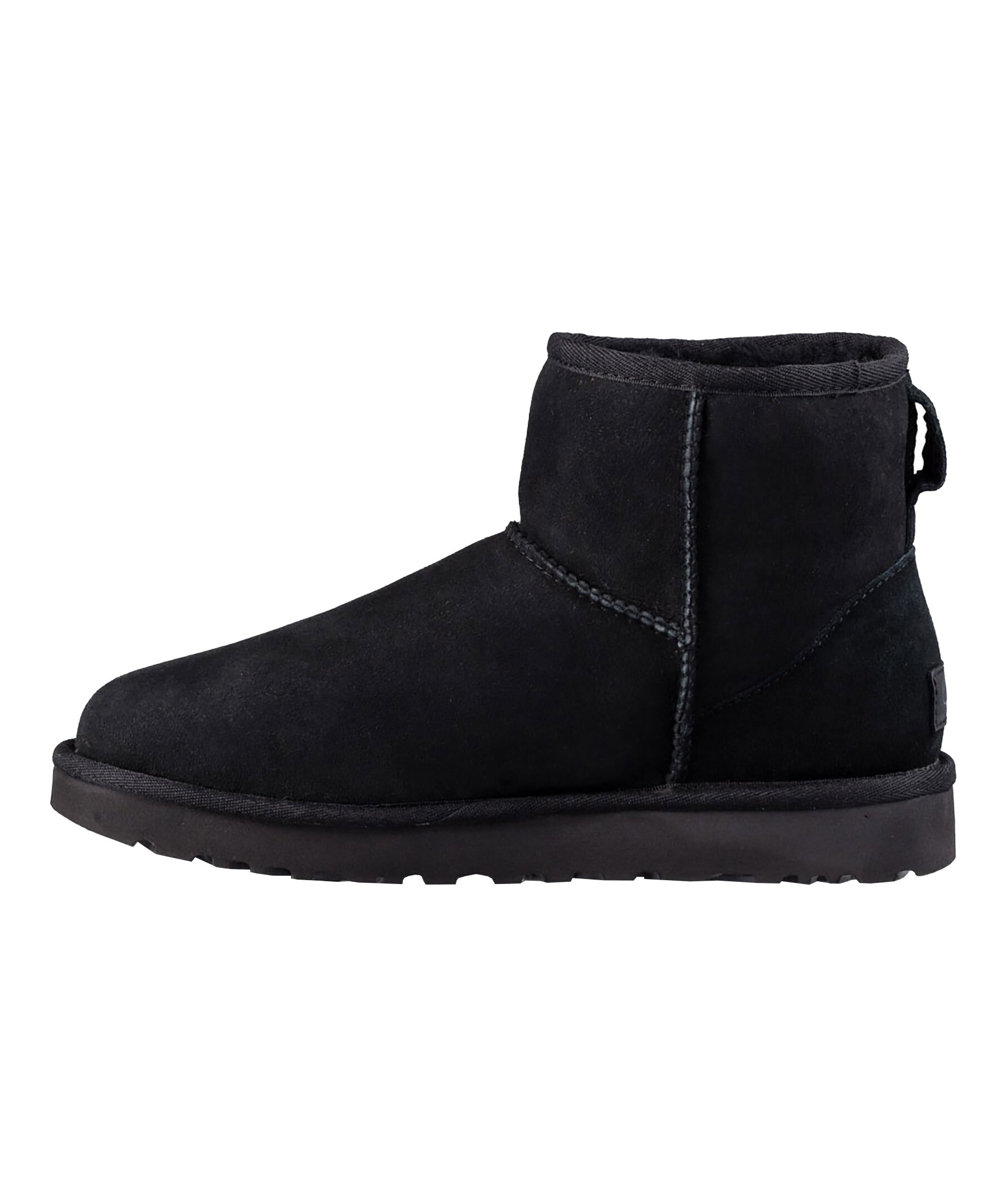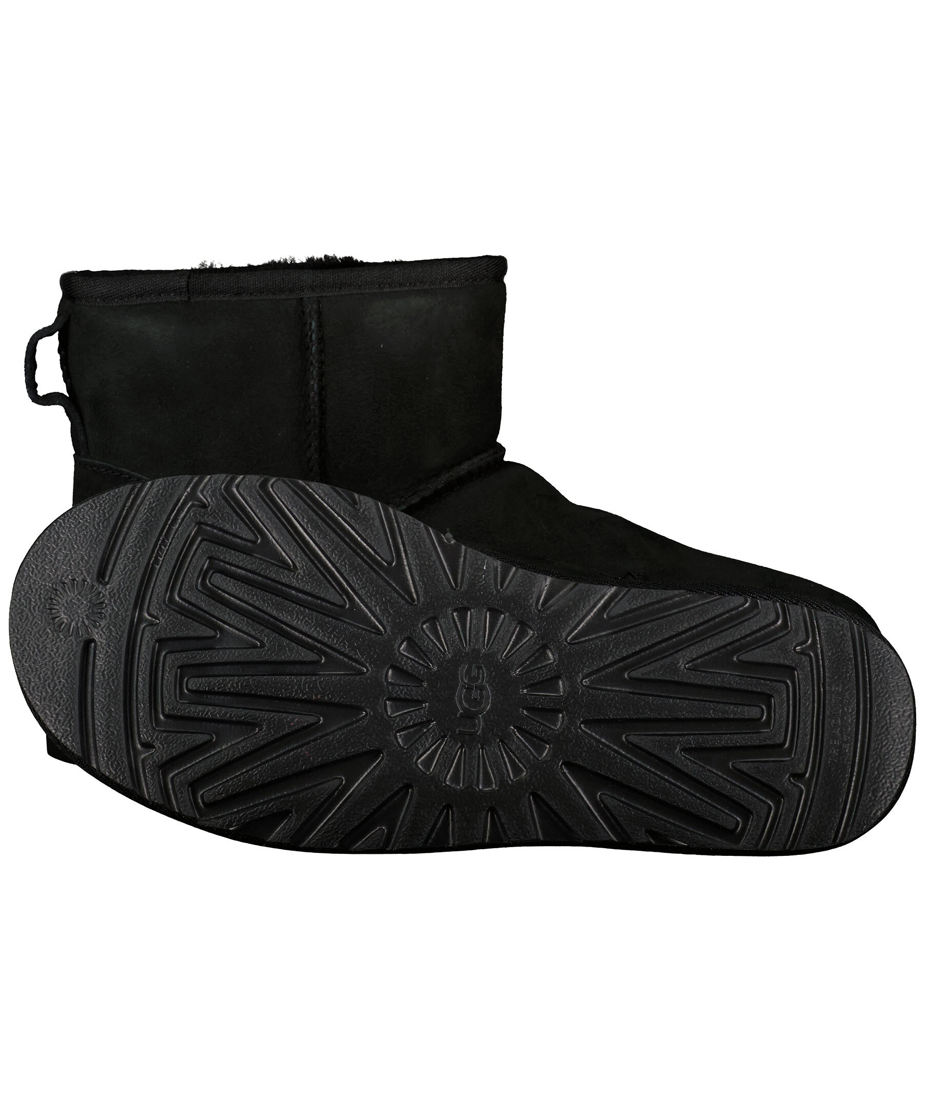 Klassiska boots i svart mocka från Ugg. Fodrade med fårskinn. Kortare skaft. Behandlad för att stöta bort lätta mängder vatten. Påsydd lapp med logotyp bak. Skorna är behandlade för att klara lätta mängder vatten. De är inte tillverkade för slaskigt och blött klimat och rekommenderas att inte användas när det är blött ute. Man behöver behandla skorna med skoimpregnering regelbundet för att skorna ska hålla längre och stå emot väta bättre.