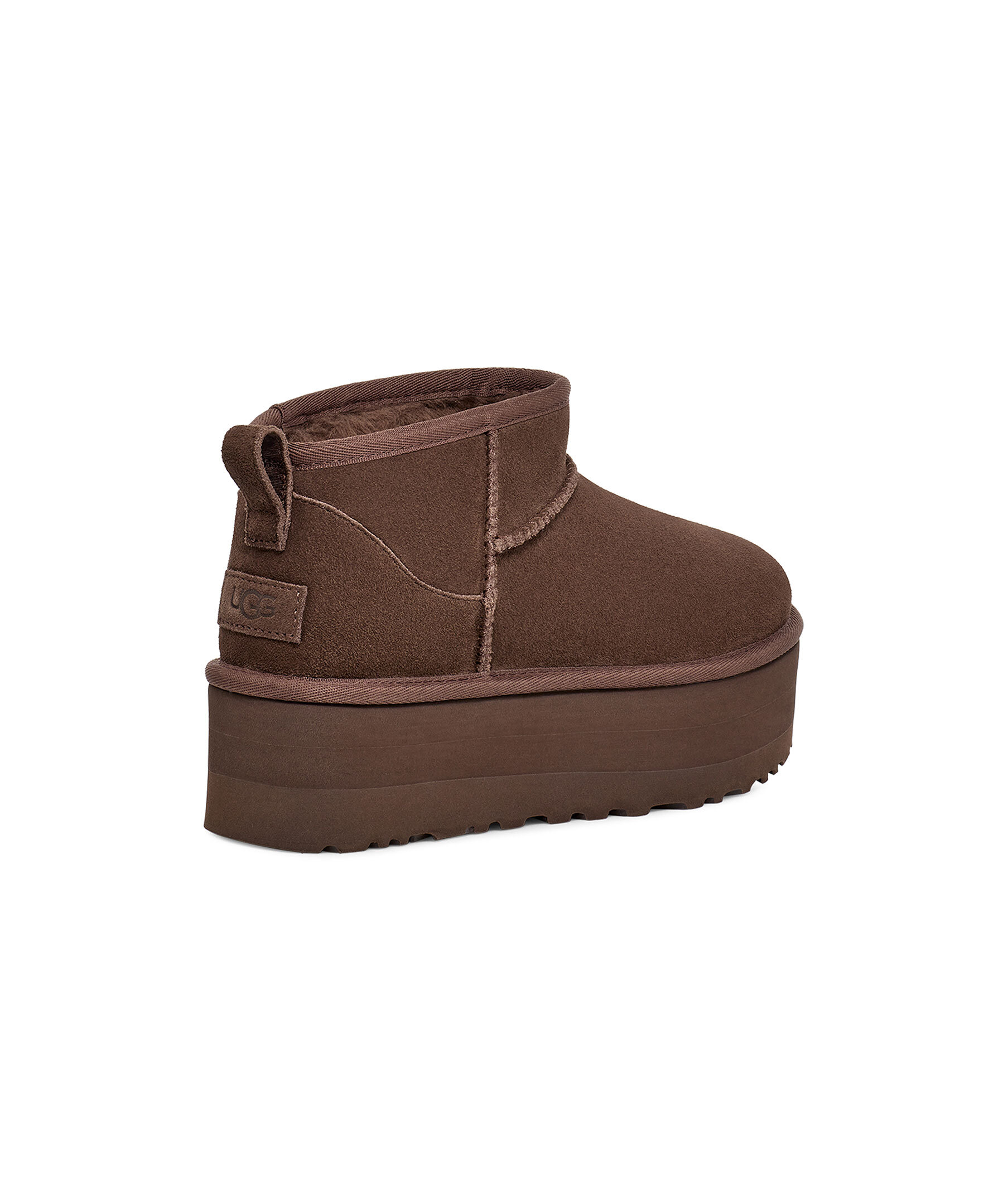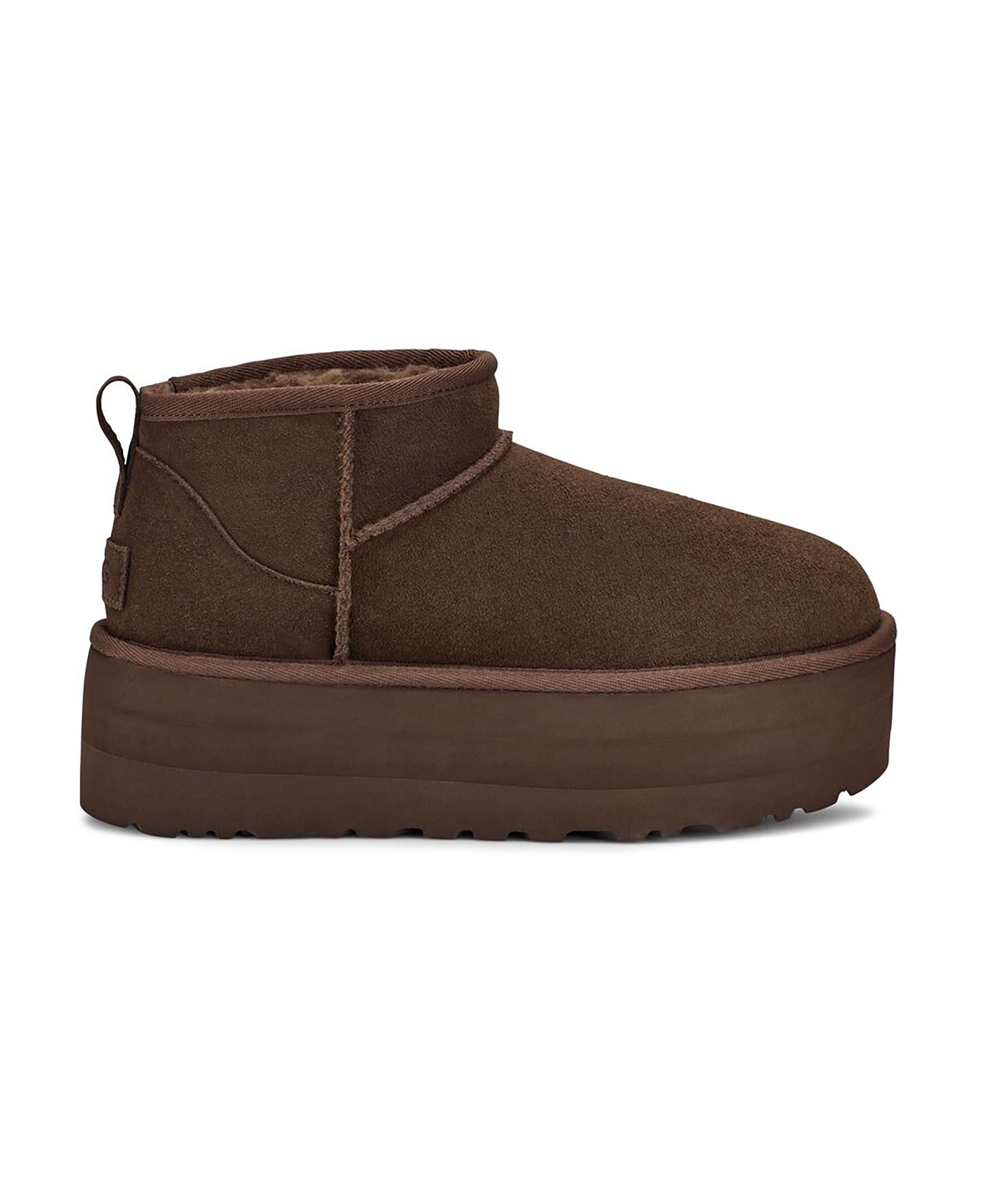 Mörkbruna, fodrade boot från UGG. En uppdaterad variant av UGGs mest ikoniska siluett med en lägre skafthöjd och högre sula. Förbehandlad med vattenavstötande behandling för att den ska se bättre ut längre. Tillverkad i fårskinn, ultramjukt UGGplush™-foder och har en flexibel, lätt sula i gummi. Overlocksömsdetaljer på sömmarna, dragflik bak och läderhäletikett med präglad UGG®-logotyp på hälen. 9vm skafthöjd. Vi rekommenderar att du köper din vanliga storlek för denna stil. Använd öglan på baksidan för att hjälpa dig att få på skon på din fot. De är inte tillverkade för slaskigt och blött klimat och rekommenderas att inte användas när det är blött ute. Man behöver behandla skorna med skoimpregnering regelbundet för att skorna ska hålla längre och stå emot väta bättre.