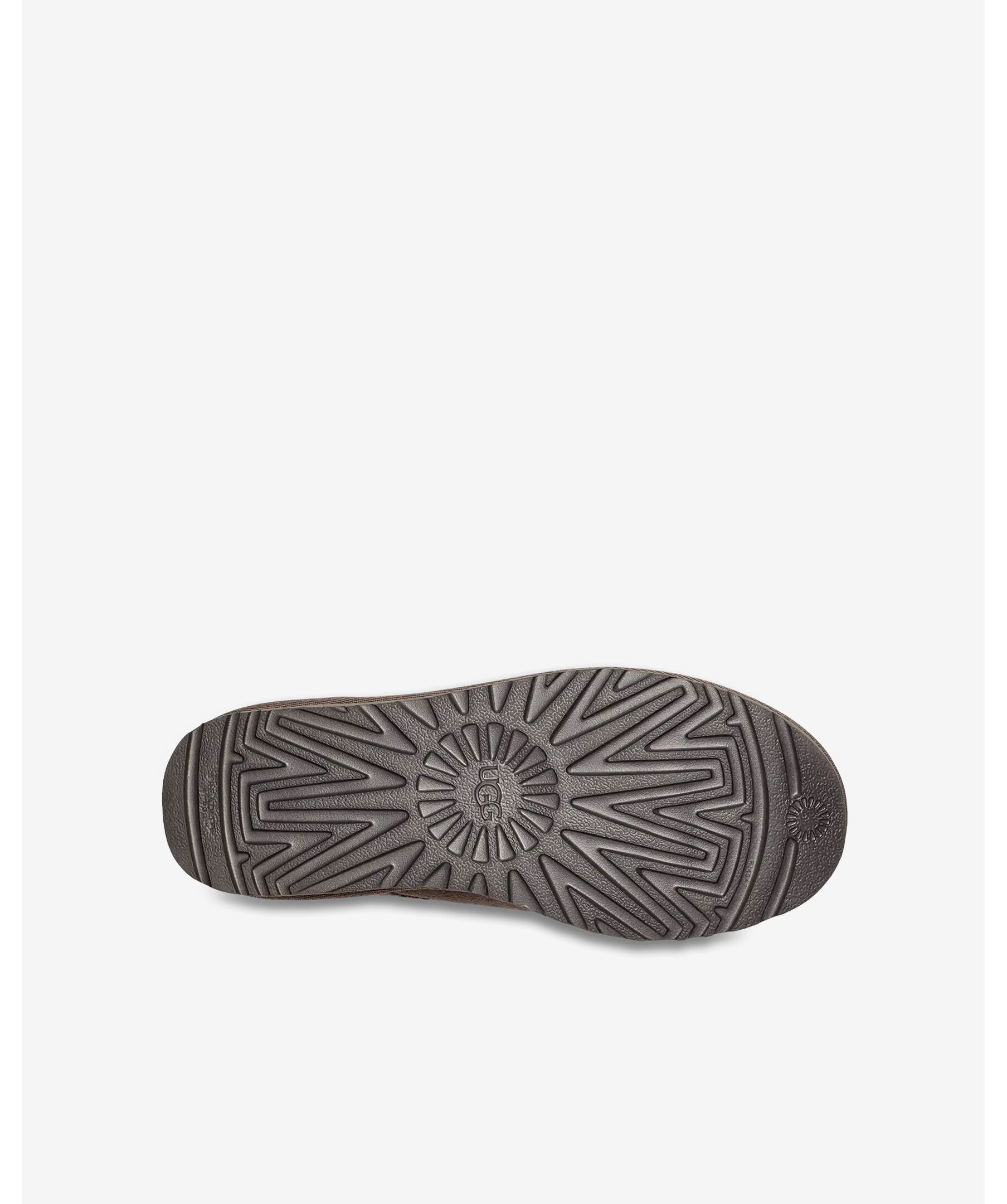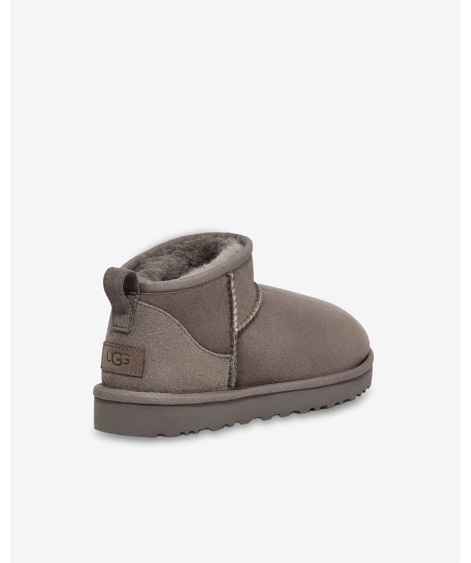 Grå, fodrad boot från UGG. Classic Ultra Mini är en uppdaterad variant av UGGs mest ikoniska siluett med en lägre skafthöjd. Förbehandlad med vattenavstötande behandling för att den ska se bättre ut längre. Tillverkad i fårskinn, ultramjukt UGGplush™-foder och har en flexibel, lätt sula i gummi. Asymmetrisk överlinje, overlocksömsdetaljer på sömmarna, dragflik bak och läderhäletikett med präglad UGG®-logotyp på hälen. 3,5" skafthöjd. De är inte tillverkade för slaskigt och blött klimat och rekommenderas att inte användas när det är blött ute. Man behöver behandla skorna med skoimpregnering regelbundet för att skorna ska hålla längre och stå emot väta bättre.