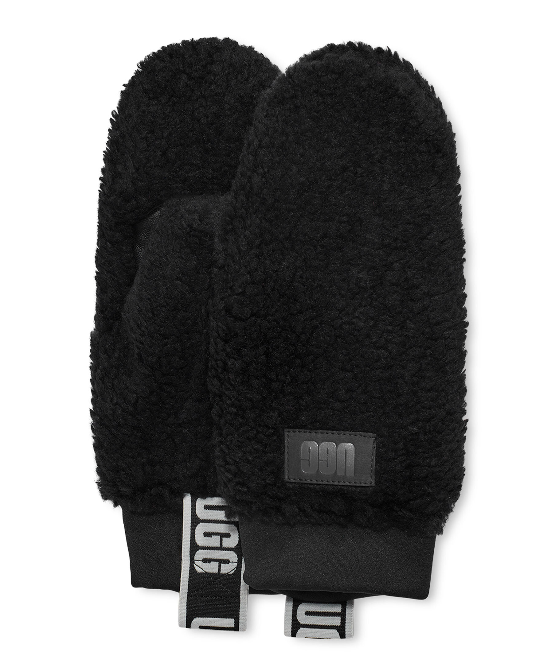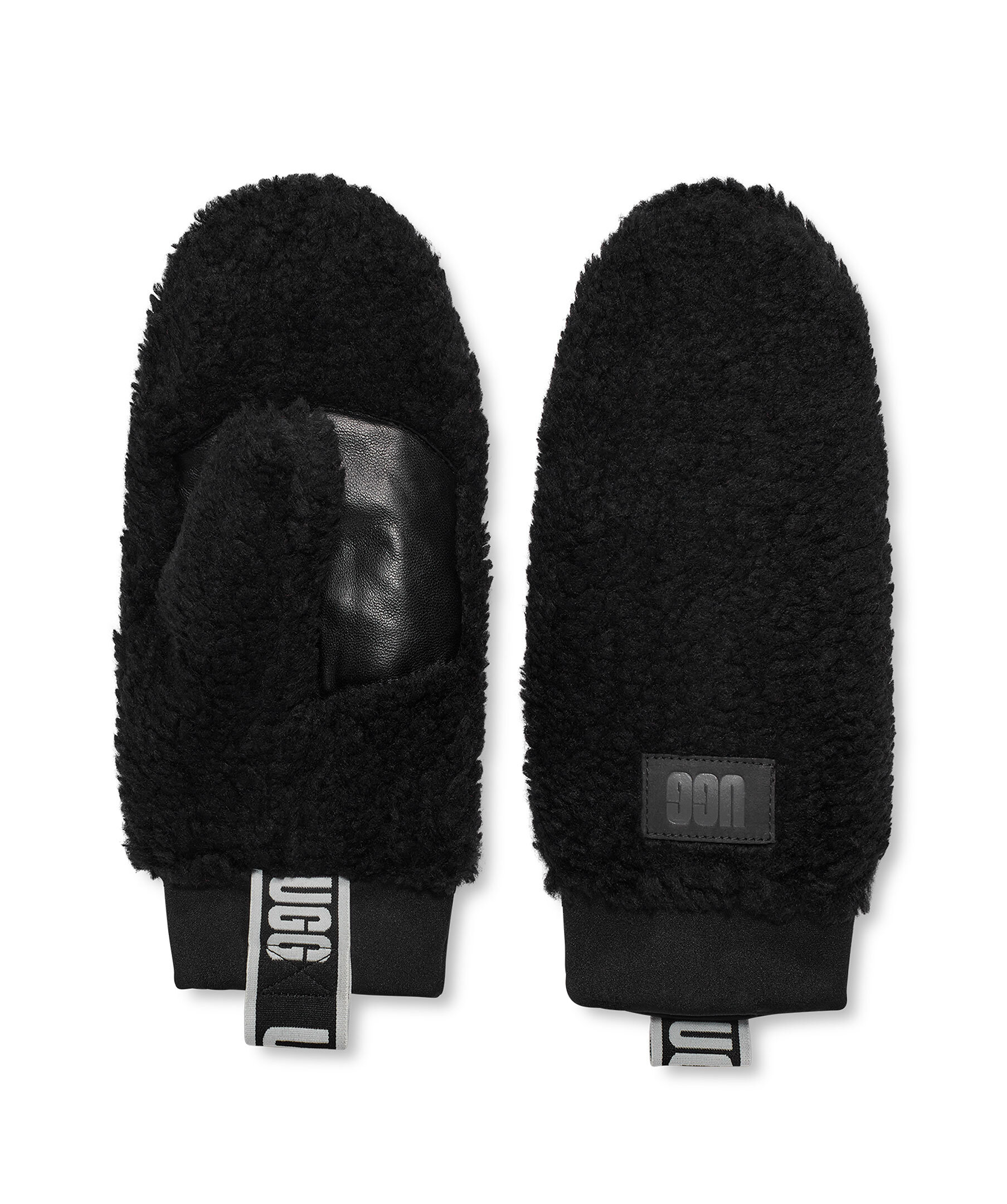 Svarta tumvantar i sherpa som är mysig, varm och mjuk att ta på från UGG. Den här fluffiga vanten har en ribbstickad mudd och en UGG-logotyp i äkta läder.
