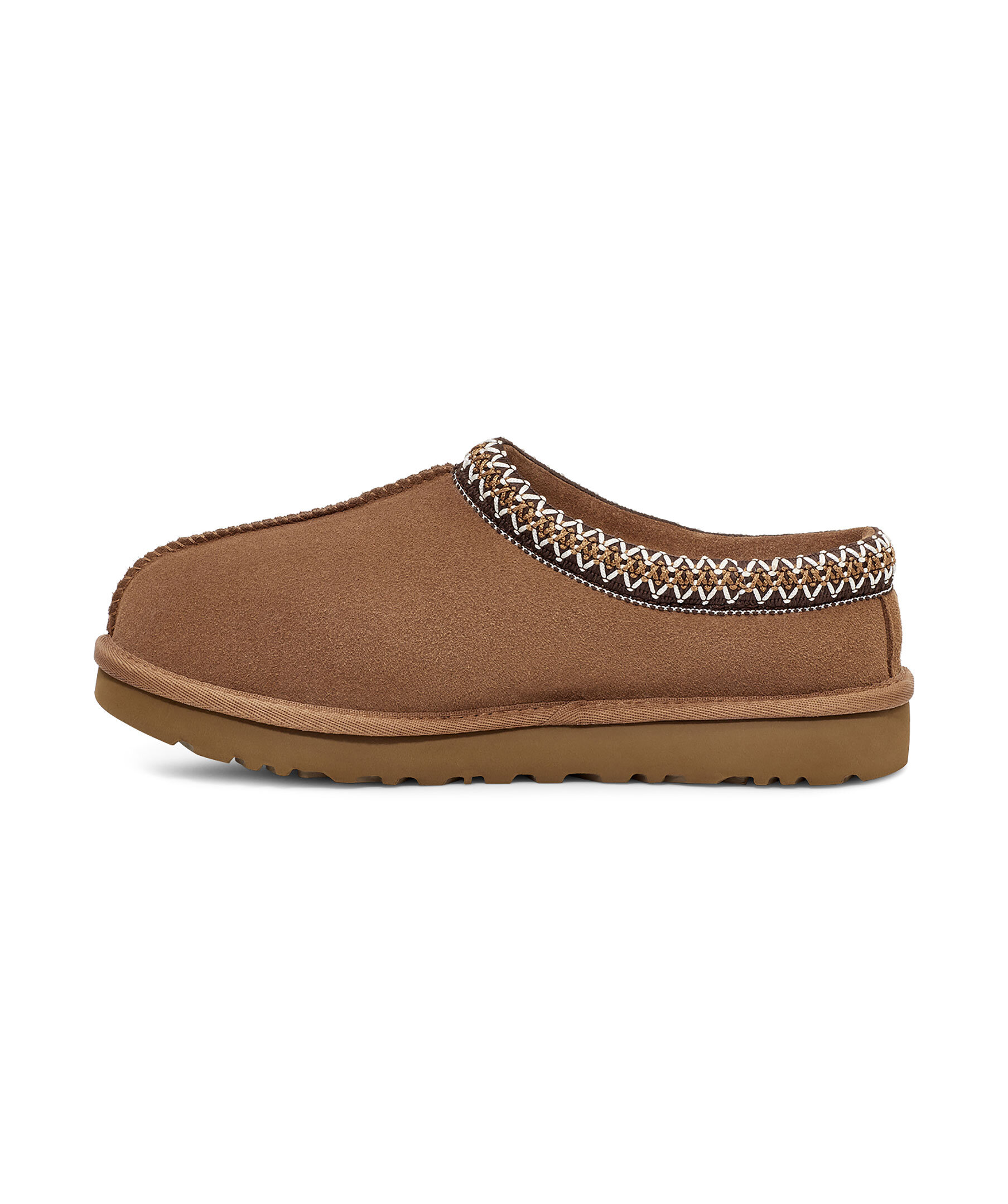 Beigea tofflor i mocka från UGG. Fodrade med mjuk ull. Brunt, flätat mönster vid tofflans öppning. Skon passar utmärkt att använda till ute- och inomhusbruk. Sulan är den klassiska lätta UGG sulan. Skon är liten i storlek, vi rekommenderar att gå upp en storlek. De är inte tillverkade för slaskigt och blött klimat och rekommenderas att inte användas när det är blött ute. Man behöver behandla skorna med skoimpregnering regelbundet för att skorna ska hålla längre och stå emot väta bättre.