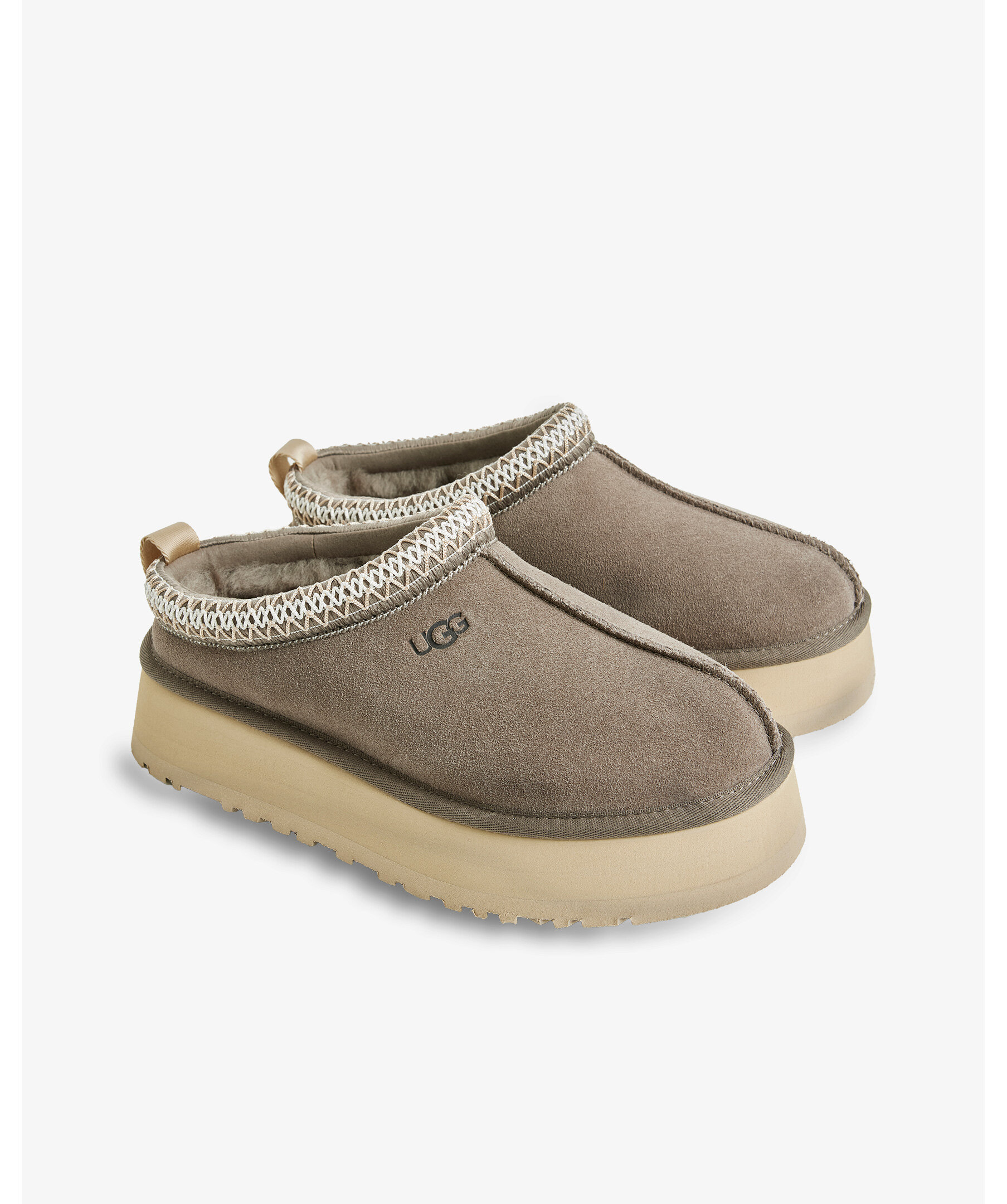 Tazz ii i färgen Dried Oregano från UGG i mjuk mocka med dekorativ flätad kant. Skorna har varmt fårskinnsfoder och en lätt platåsula som gör dem bekväma att bära både inomhus och utomhus.