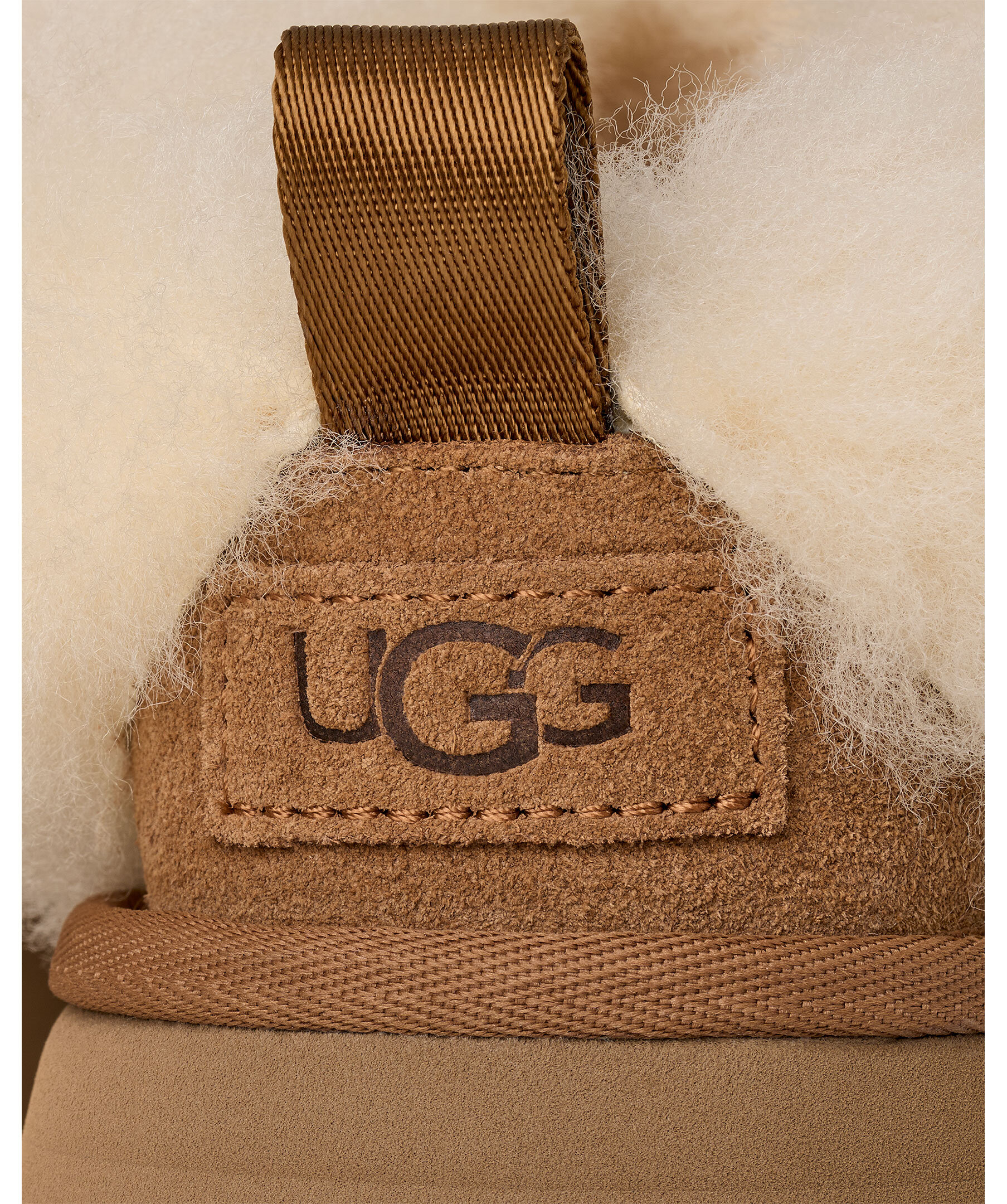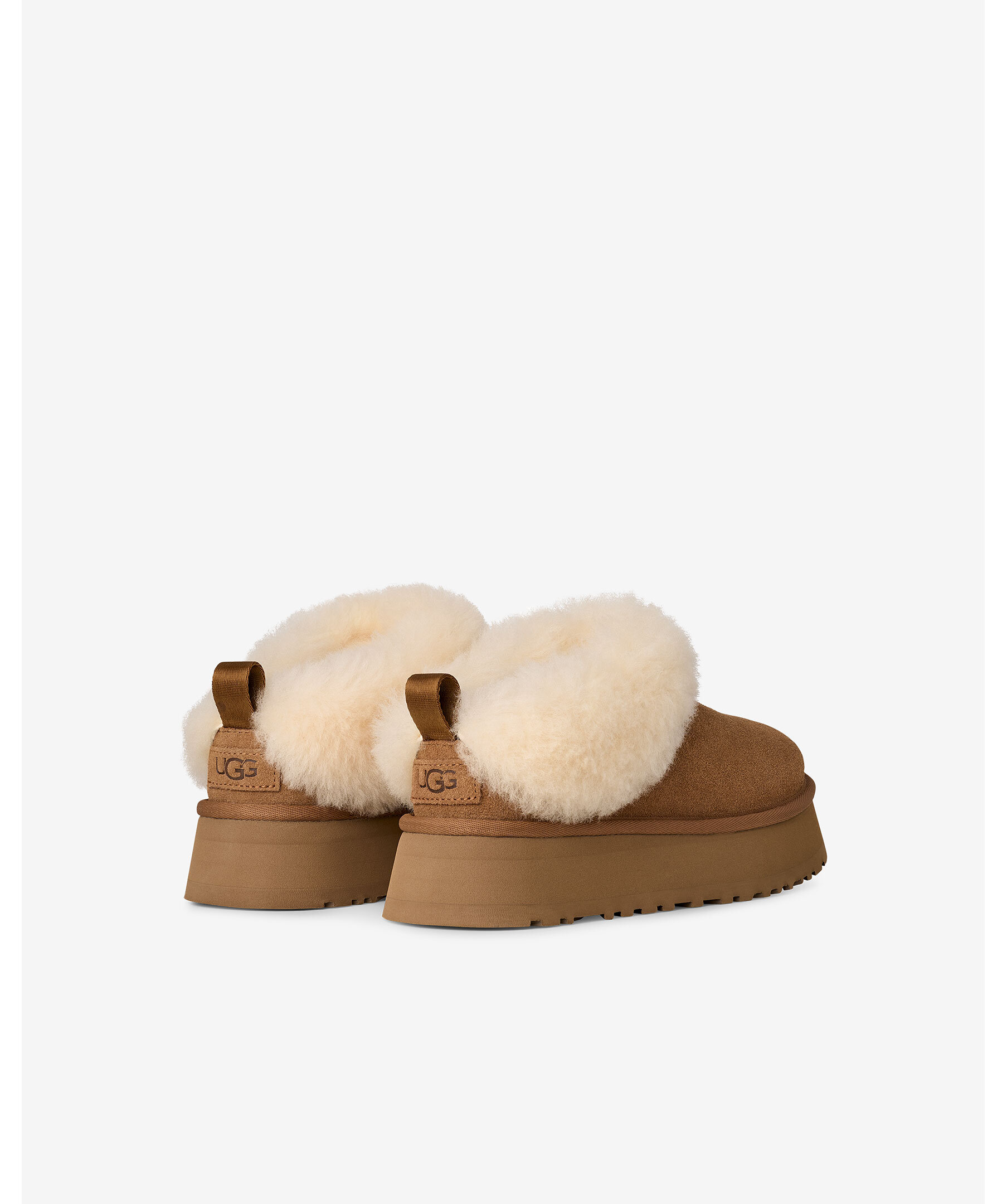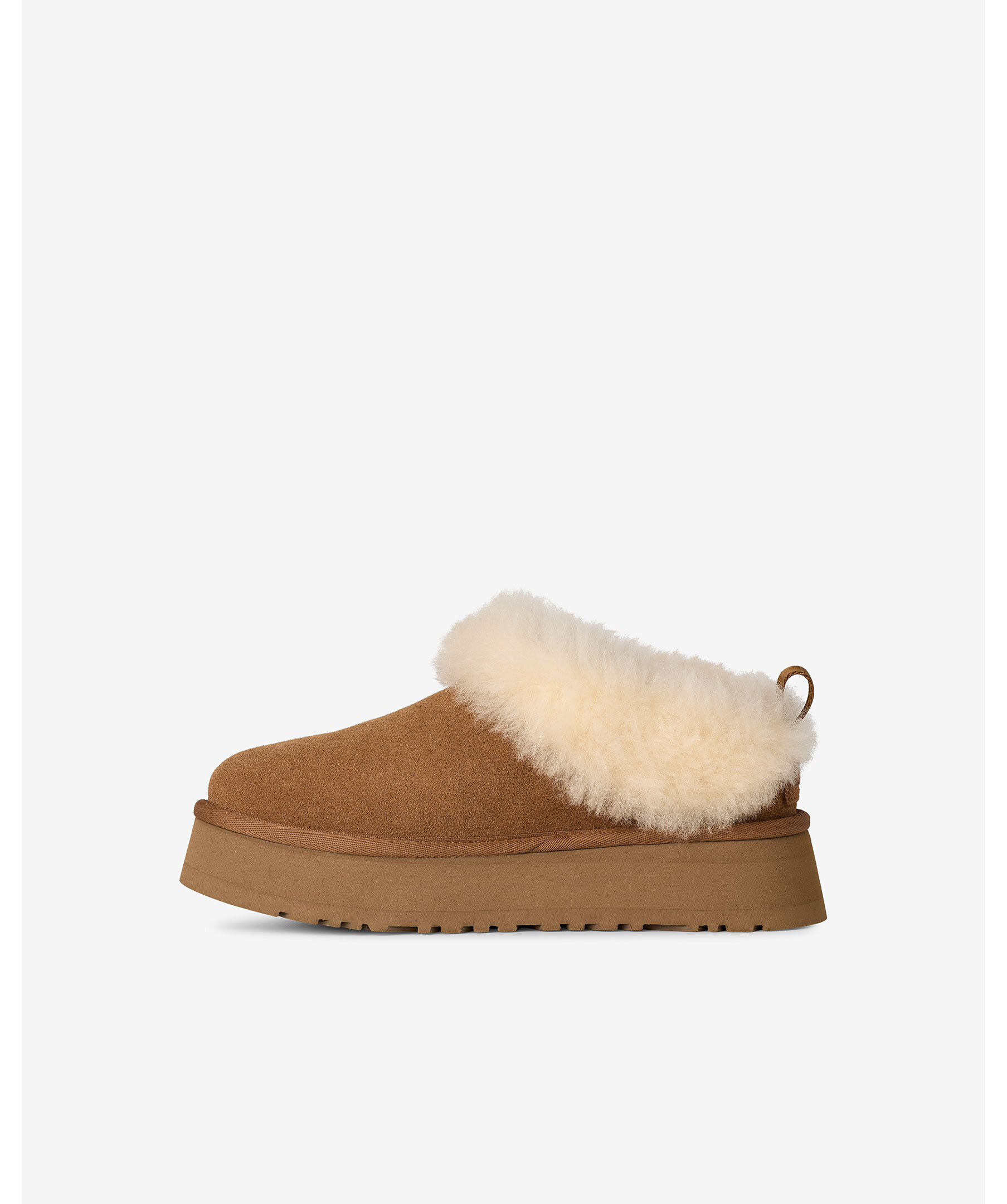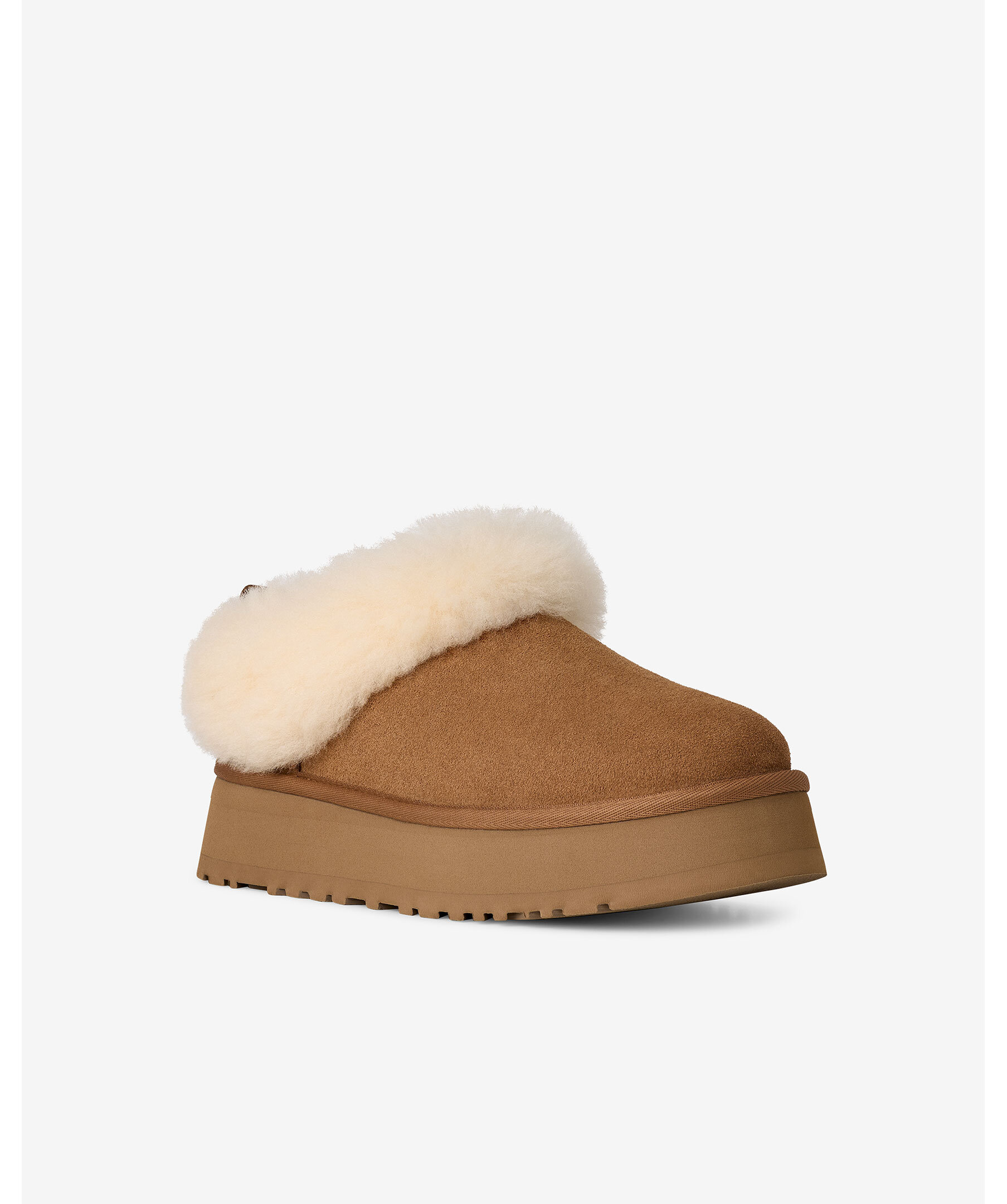 Om du älskar Tazz men vill ha mer mysighet är den här skon perfekt för dig. Kamelfärgade toffla i äkta mocka från UGG. Tofflorna har en stor, fluffig mudd i fårskinn, en platåhöjd på 4,7cm tillverkad av fjädrande sockerrörs-EVA. Logotyp på hälen. Perfekt för både ute- och inomhusbruk.