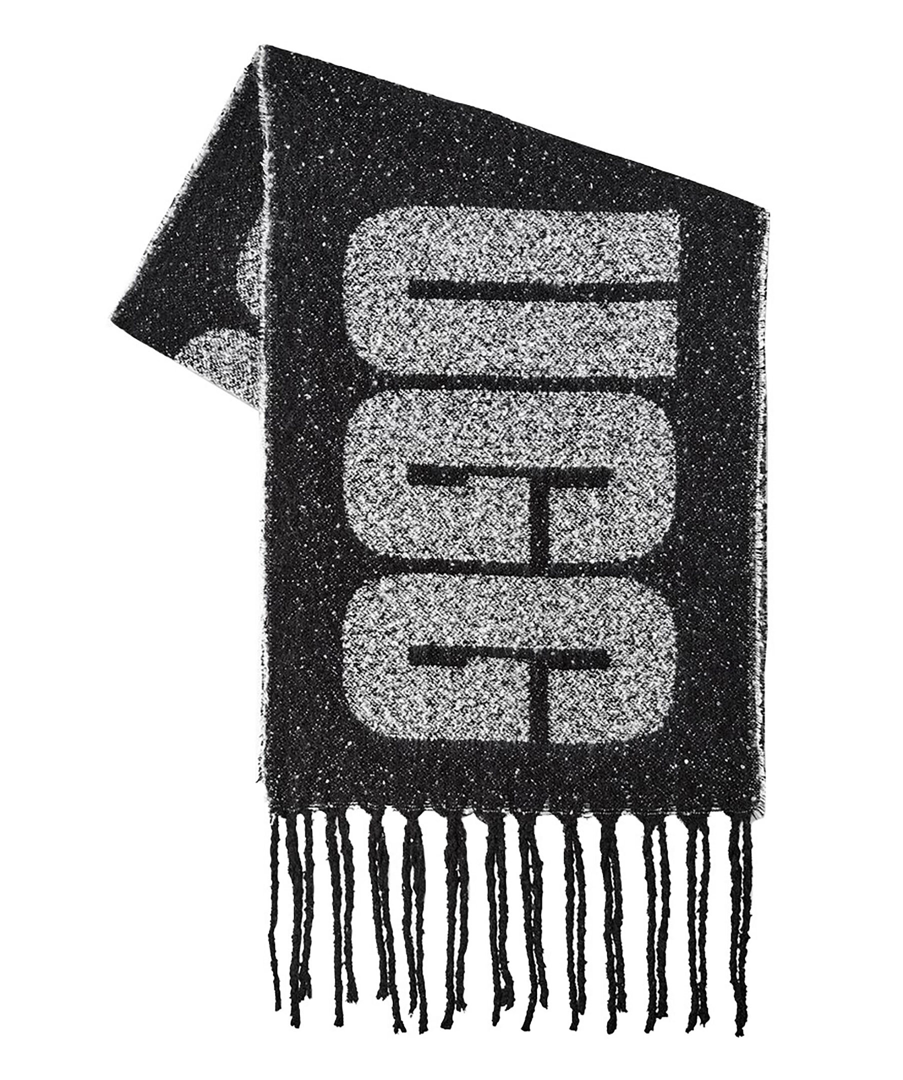 Svart och vit stickad halsduk med stickad logotyp från UGG. Tillverkad i mjukt material med fransar i kanterna.