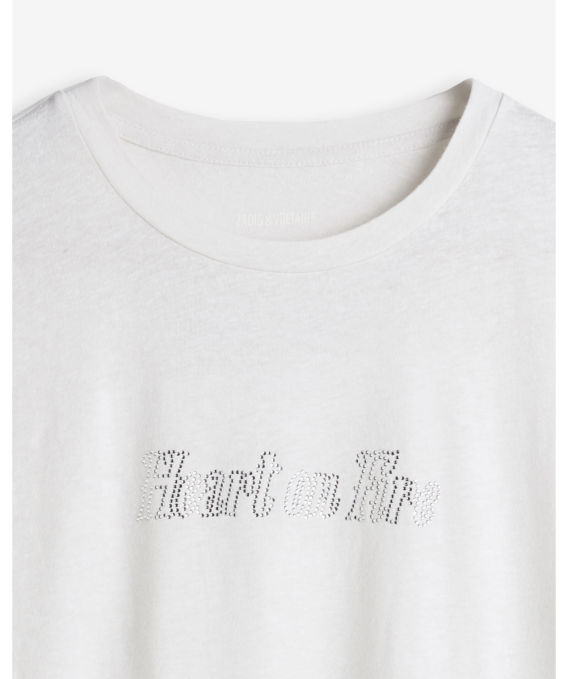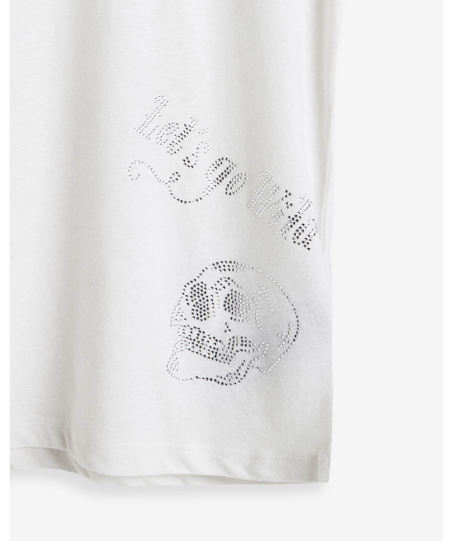 Krämvit, tunn t-shirt med flera specialdesignade strass-inskriptioner från Zadig Voltaire. T-shirten har rundad halsringning och korta ärmar. Tillverkad i en polyester-bomull- och linneblandning.