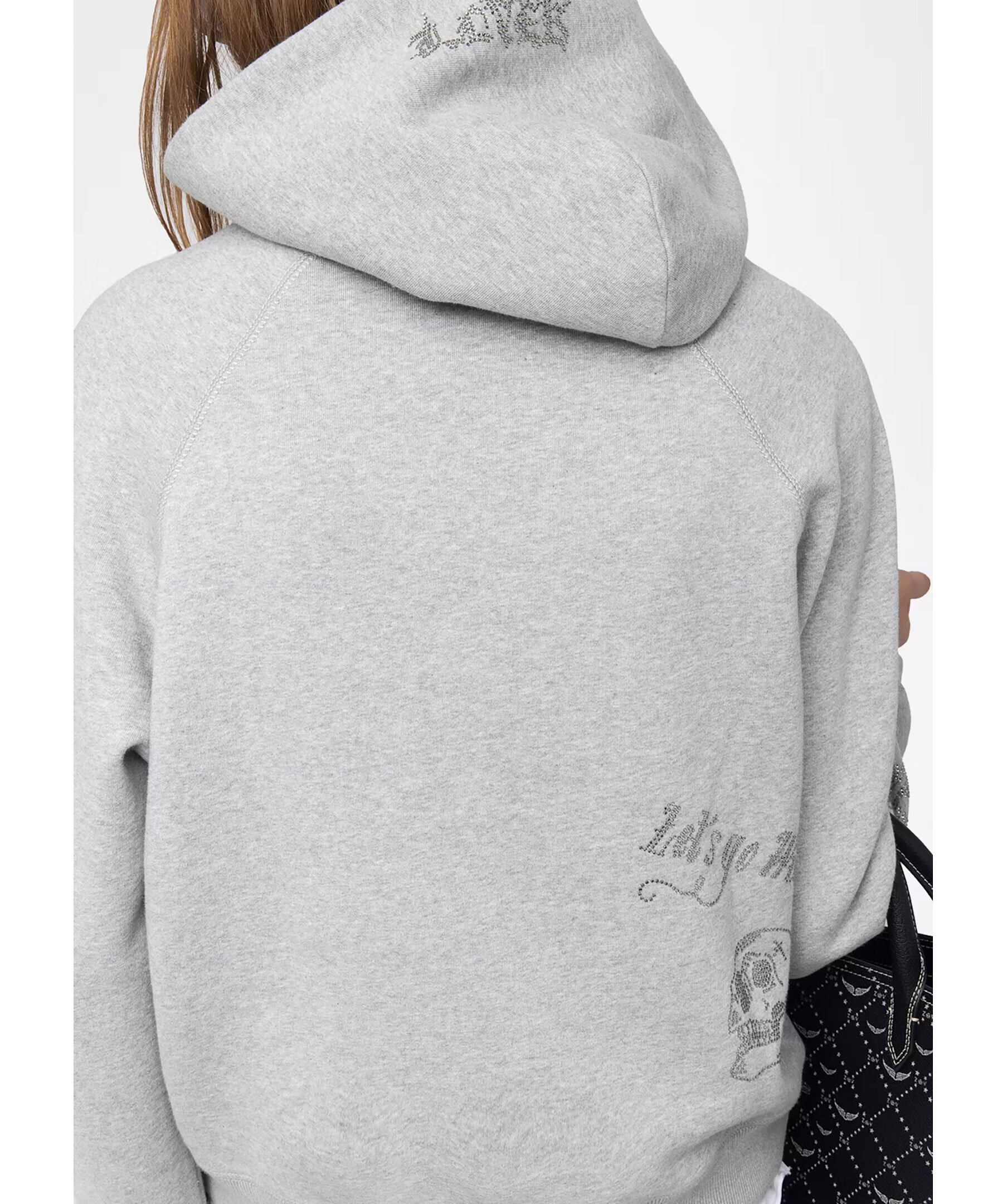 Grå hoodie från Zadig Voltaire. Hoodien har huva, långa ärmar, känguruficka på magen, ribbstickade muddar samt tryck med strasstenar. Tillverkad i bomull.