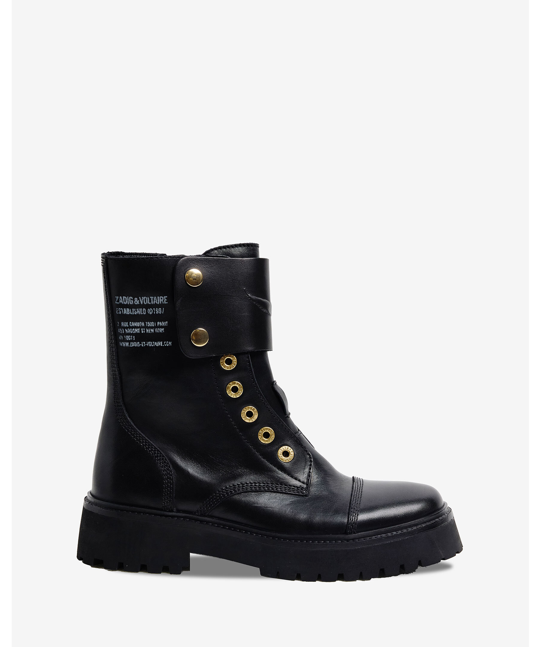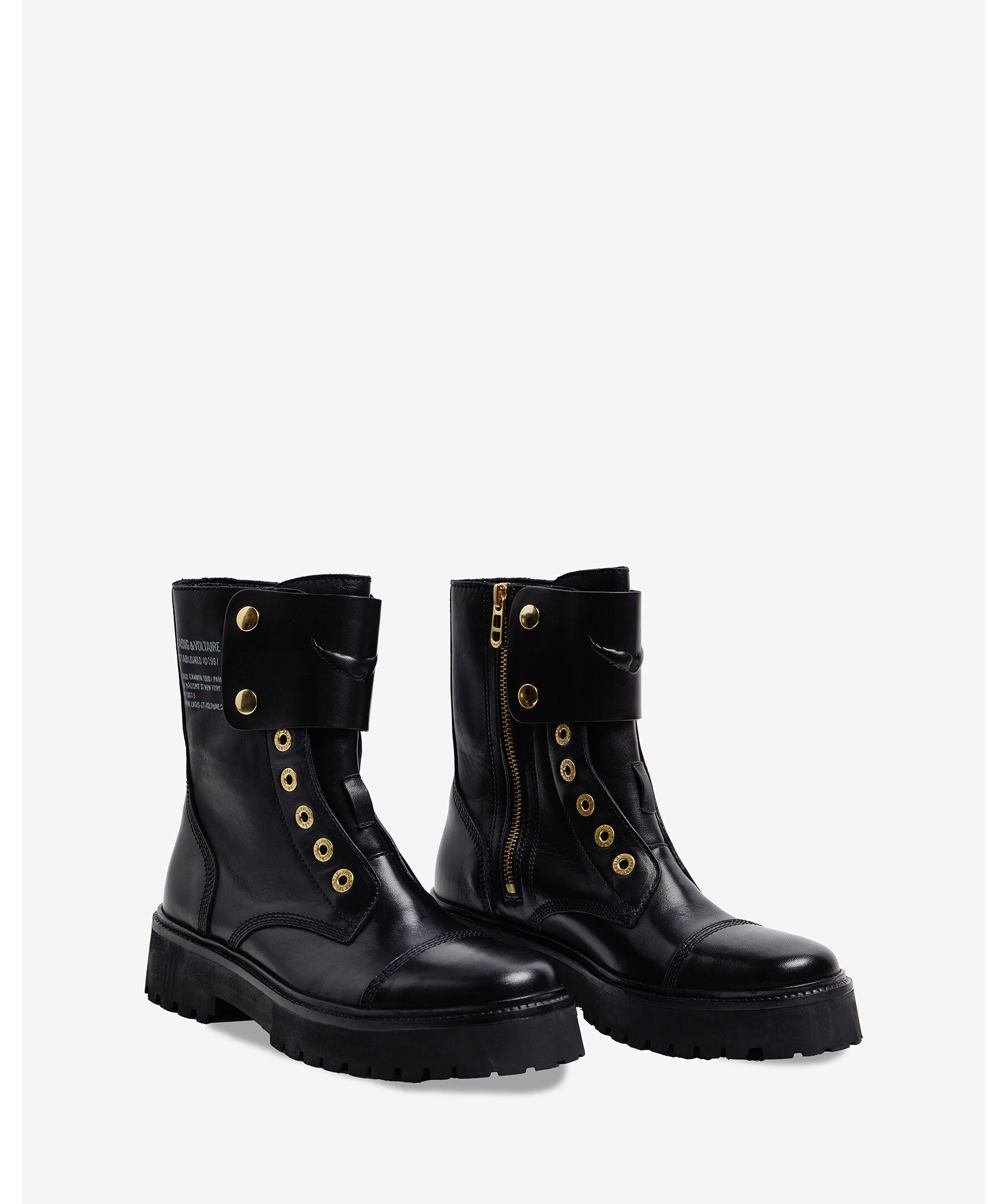 Svart kängor i läder från Zadig Voltaire. Kängorna har dragkedja på insida för lätt av- och påtagning, rem prydd med en präglad vinge i slätt läder framtill och en klackhöjd på 4,5cm. Guldfärgade detaljer. Tillverkade i läder.