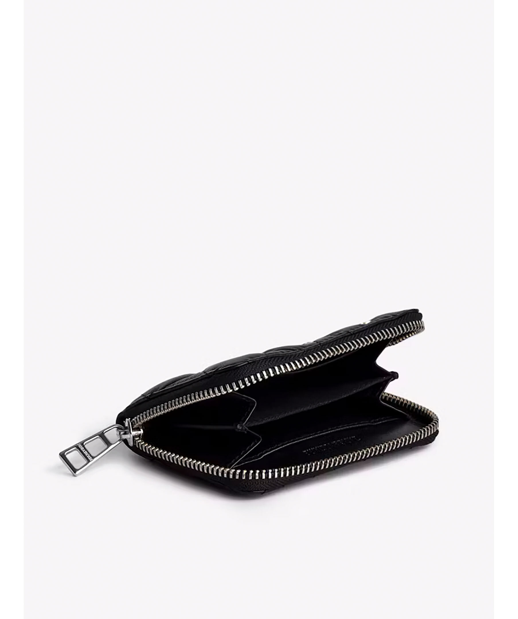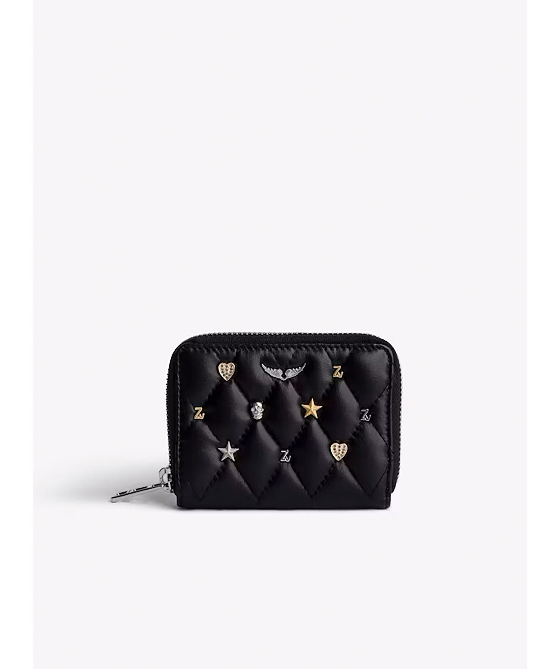 Svart plånbok i quiltat läder från Zadig Voltaire med berlocker i silver och guld. på framsidan. Plånboken har två fack invändigt. Präglad logotyp. Tillverkad i lammskinn. Mått: B: 11cm / H: 8,5cm.
