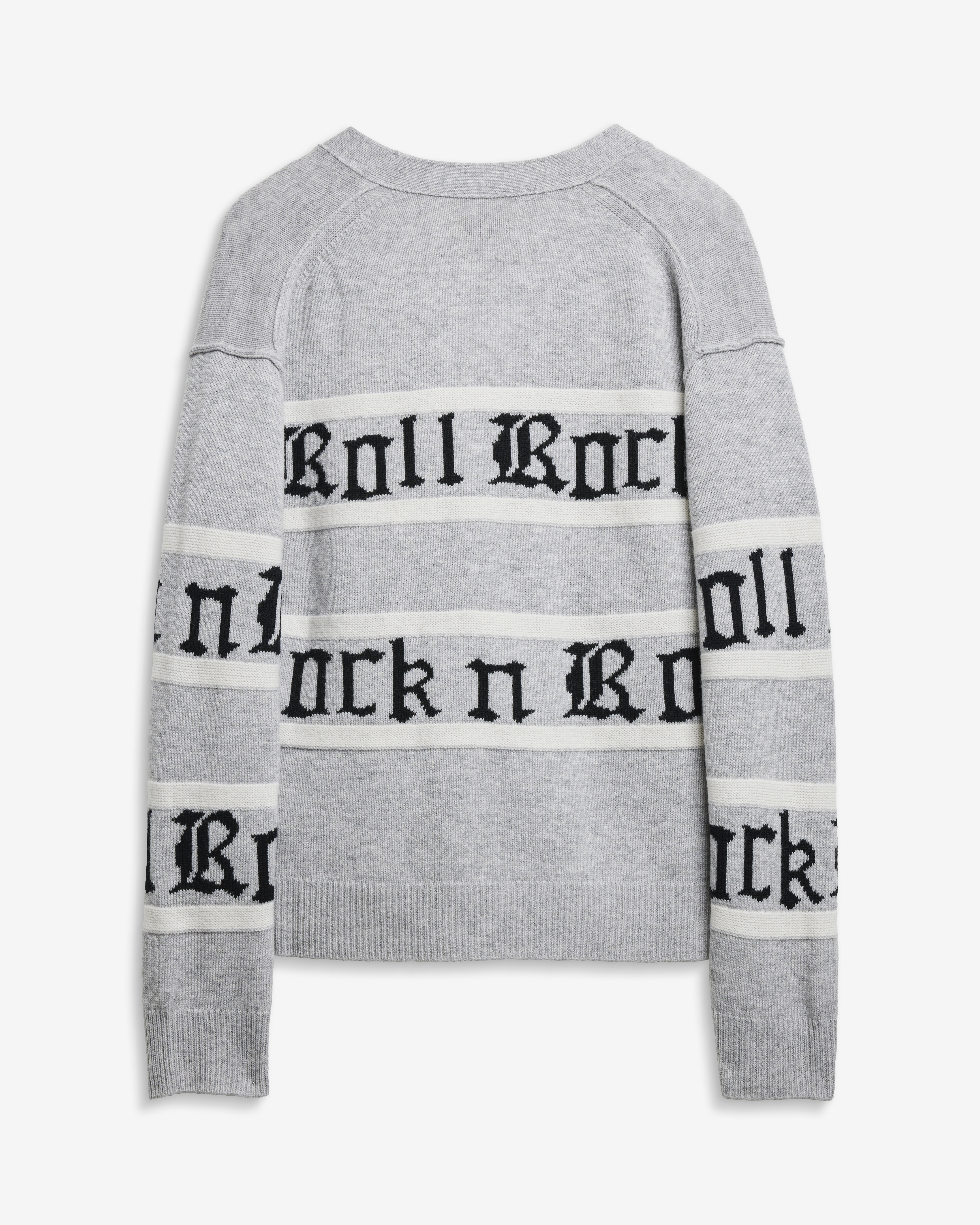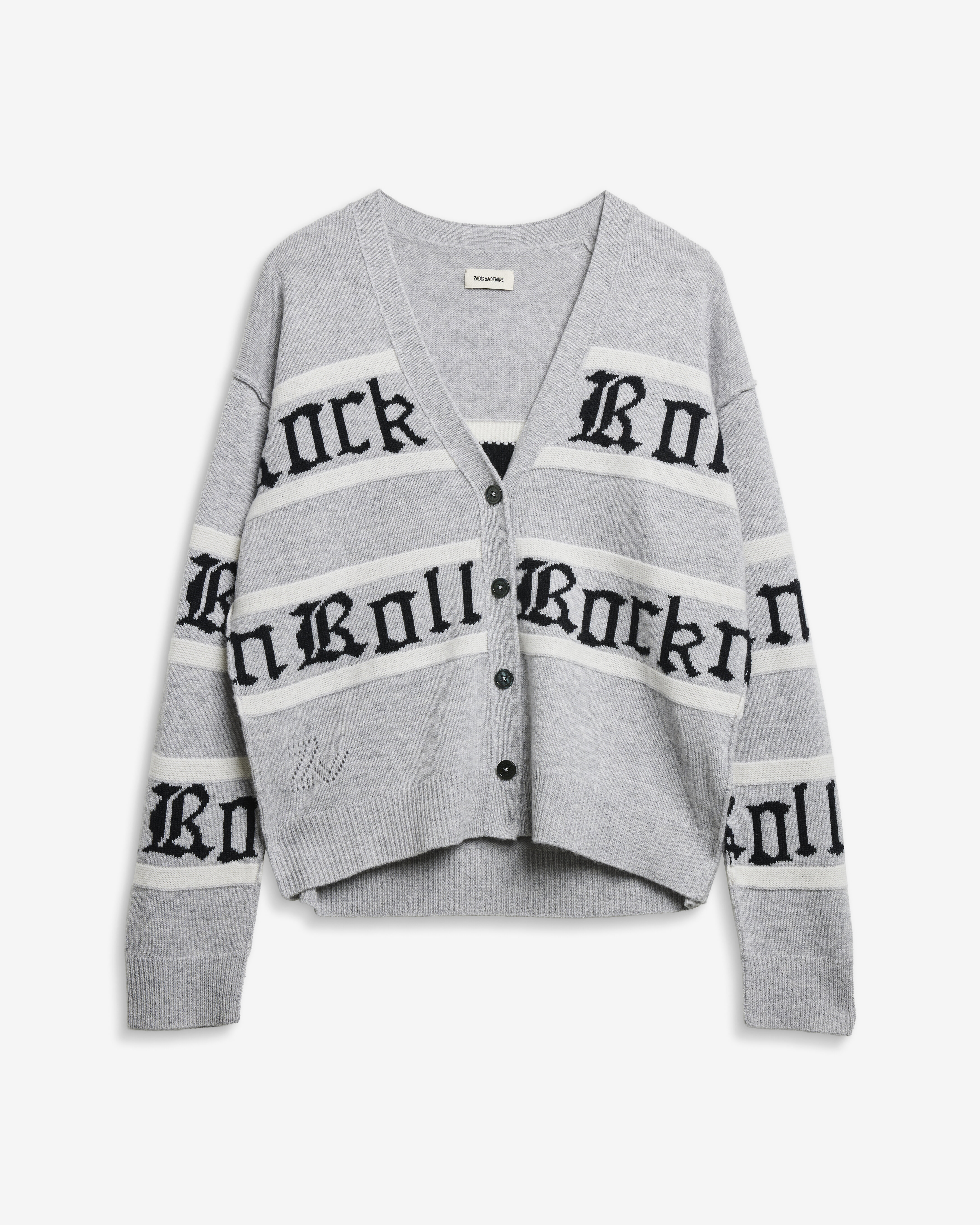 Grå kofta i ull- och kashmirblandning från Zadig & Voltaire. Koftan har ränder och ”Rock n Roll”-intarsia i jacquard.