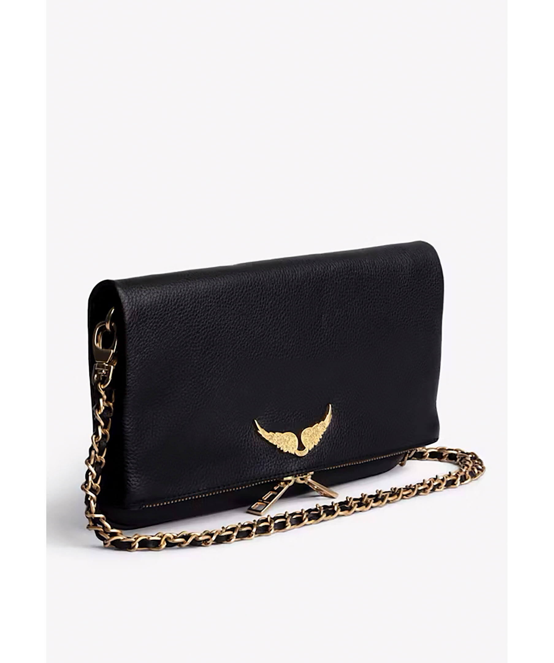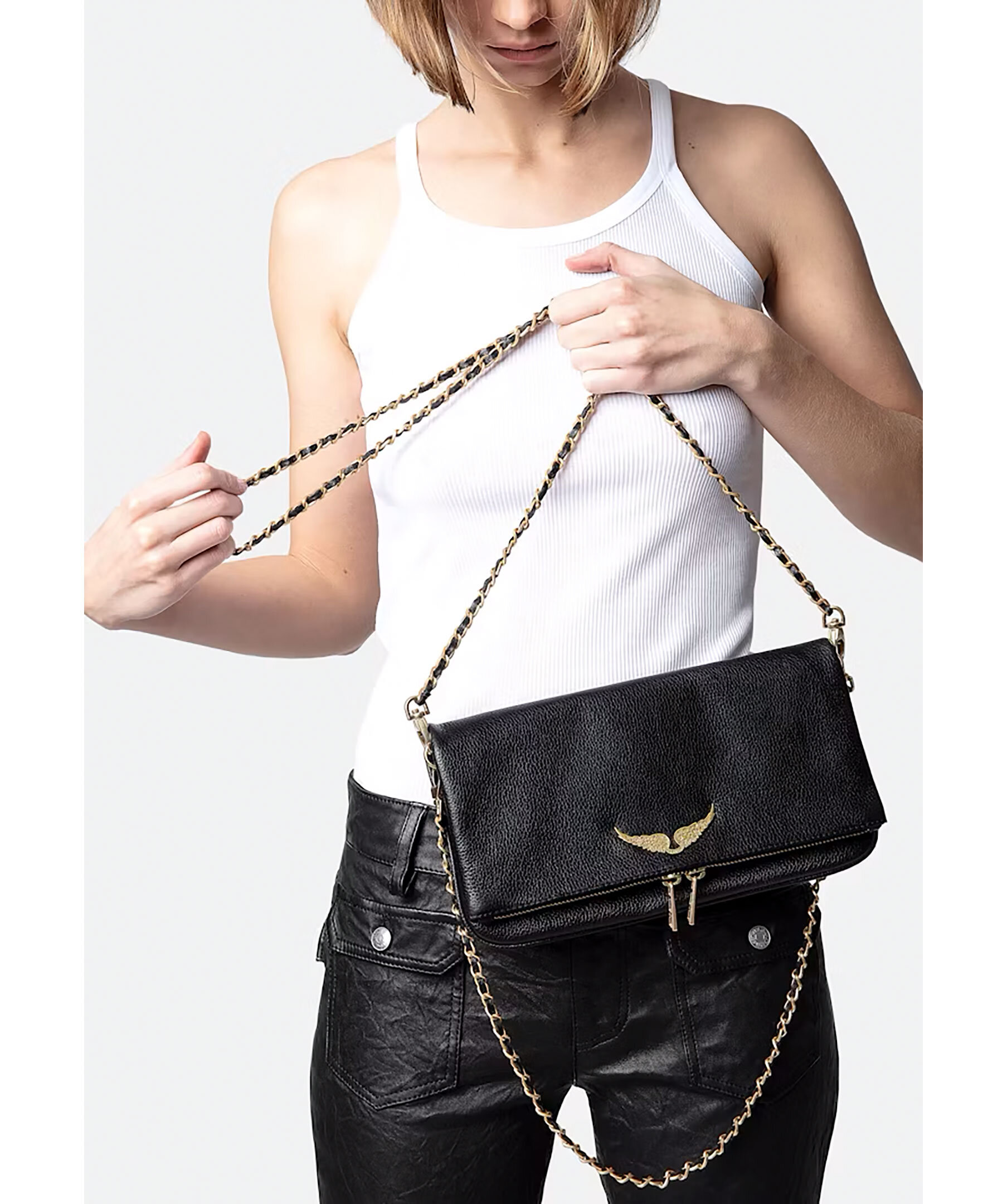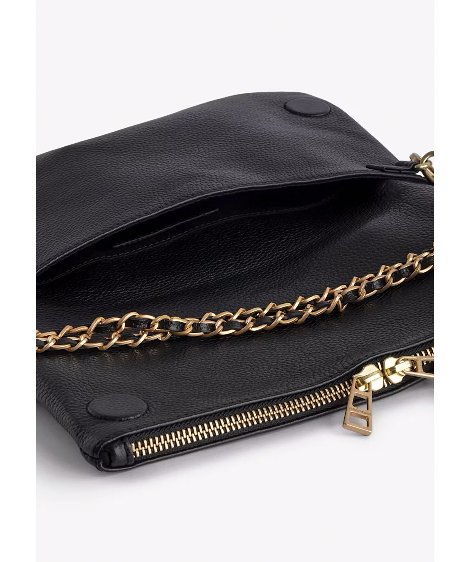 Svart läderclutch med guldtonade detaljer från Zadig Voltaire. Väskan har dubbel kedja och läderrem, så att du kan välja att bära den över kroppen eller på axeln. Bakficka med dragkedja. Väskan har en flik med magentstängning och dragkedja. Guldfärgad metall logotyp på framsidan. Tillverkad i ko-läder. Mått: B: 27cm / H: 13cm / D: 2cm. Kedjeremsfall: 33 cm och 57 cm.