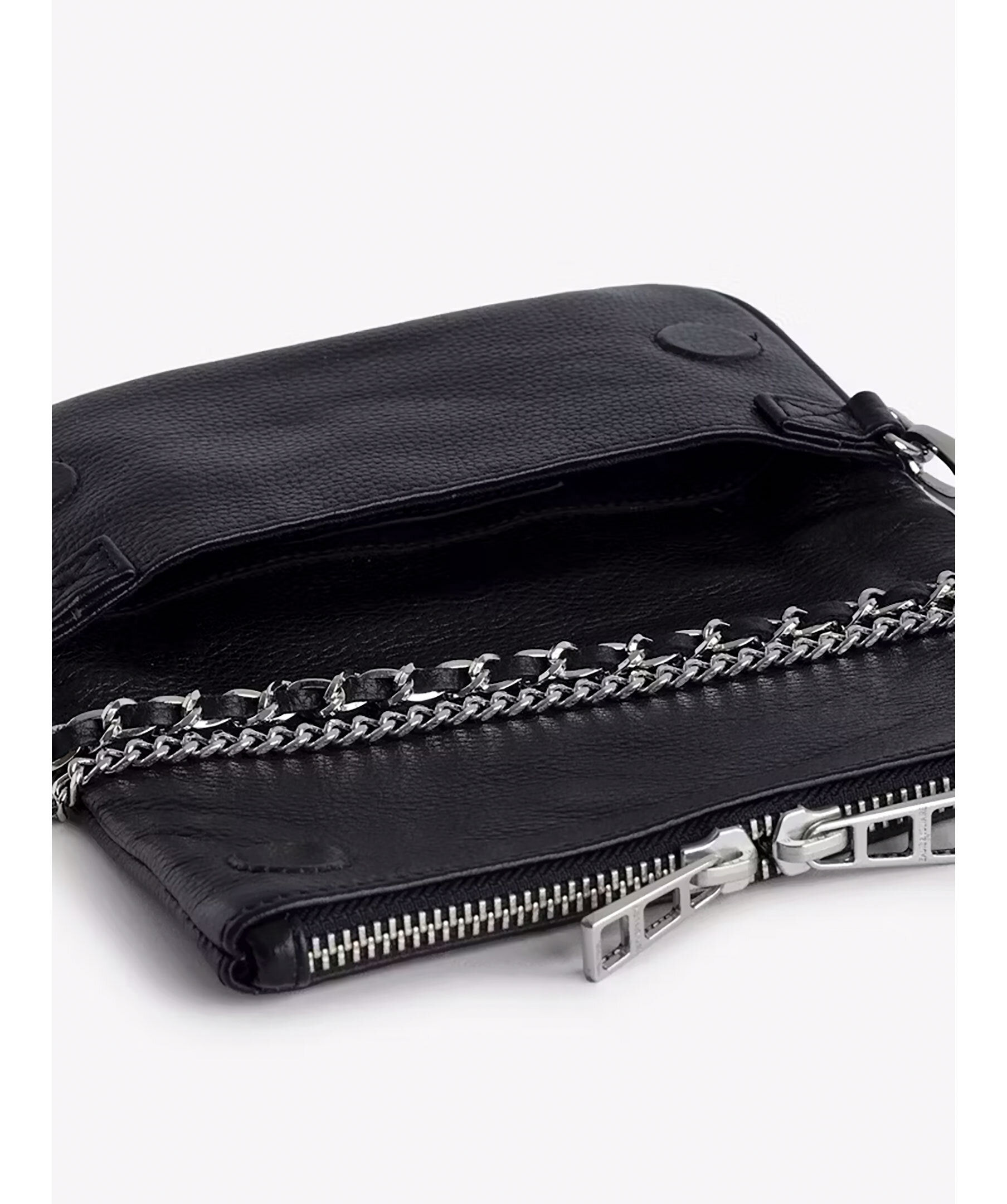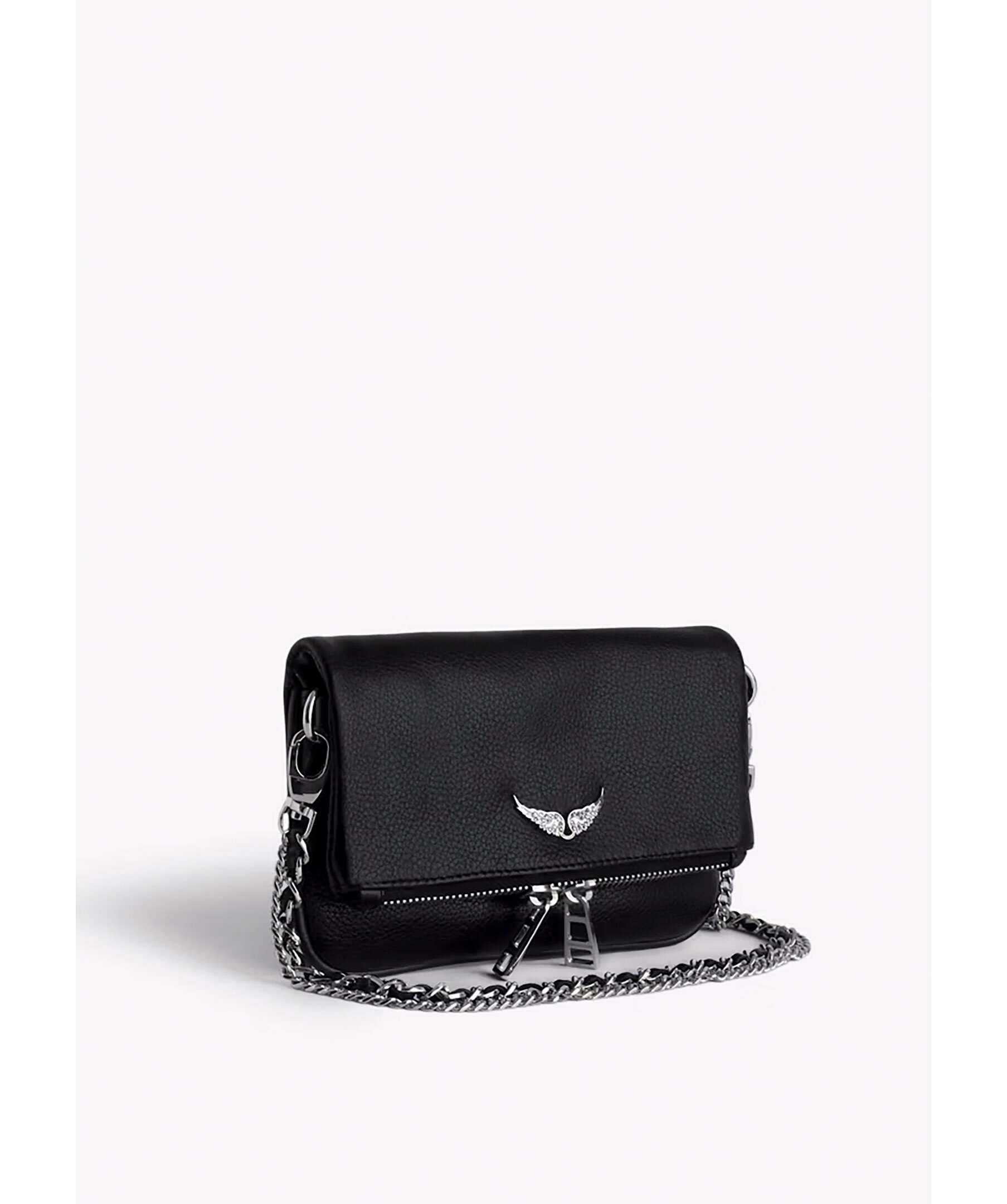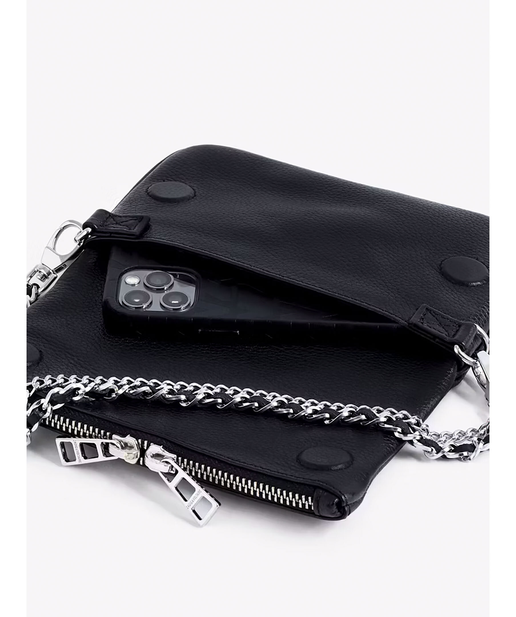 Svart läderclutch med silvertonade detaljer från Zadig Voltaire. Väskan har två avtagbara kedjor, en i läder och en i metall. Bär för hand, över axeln eller över kroppen. Bakficka med dragkedja. Väskan har en flik med magentstängning och dragkedja. Diamanté-utsmyckade vingar på framsidan. Tillverkad i kalvskinn. Tillräckligt stor för en mobiltelefon upp till 6,1 tum (t.ex. iPhone 12/13/14). Mått: B: 17,5cm / H: 11cm. Kedjeremsfall: 23 cm och 61 cm.
