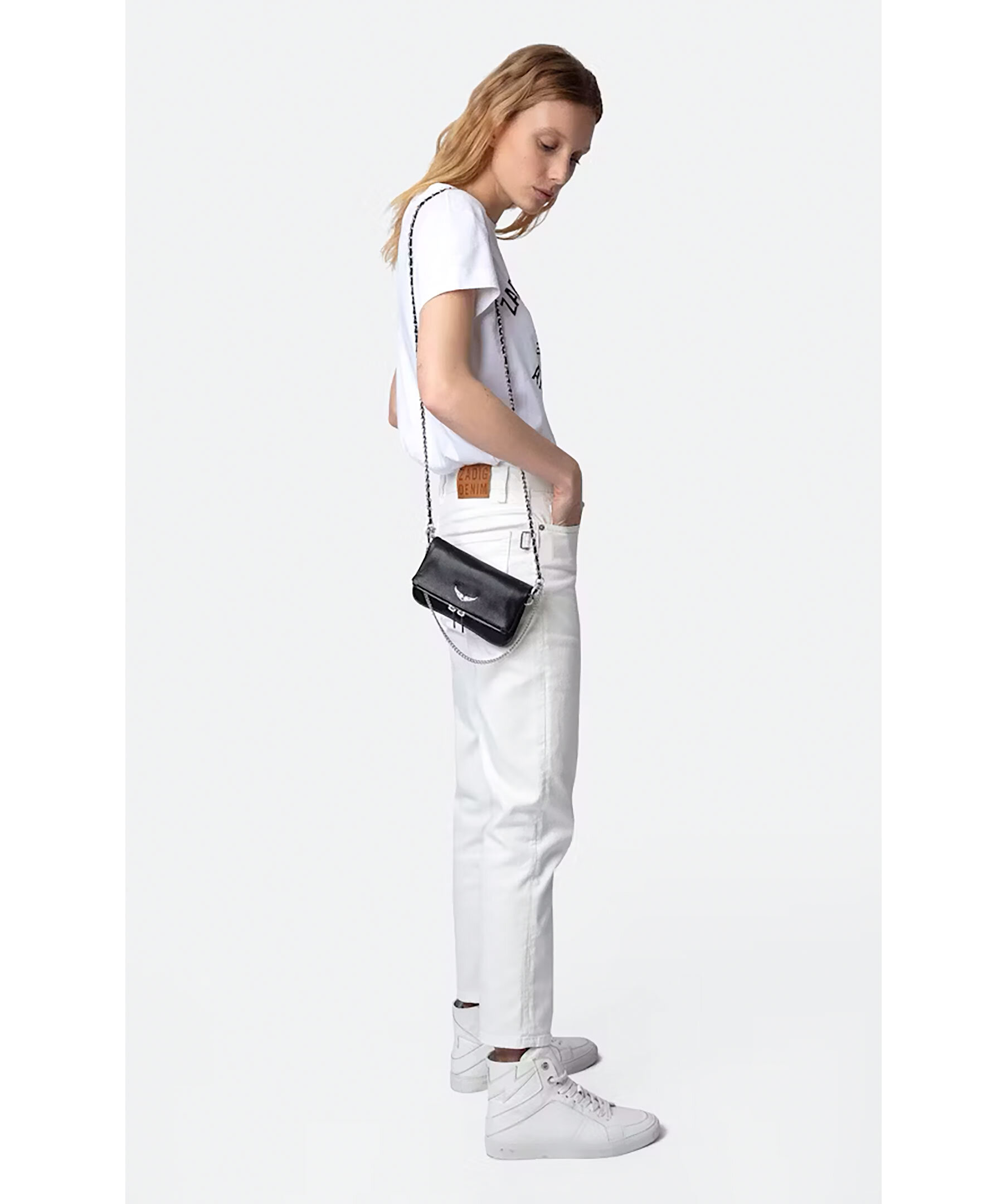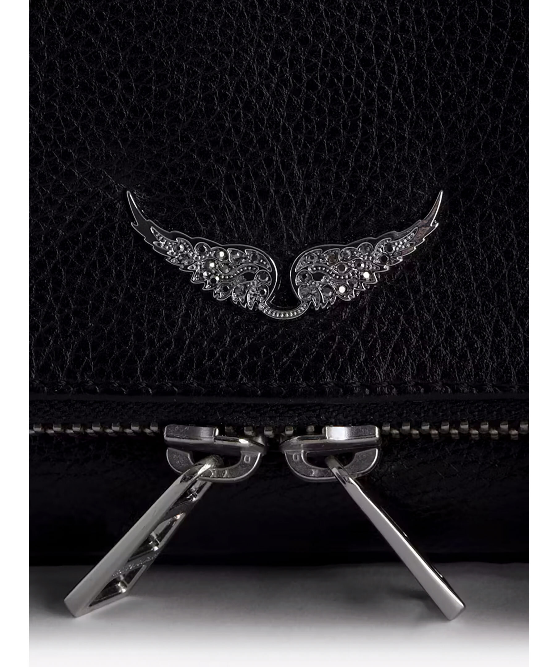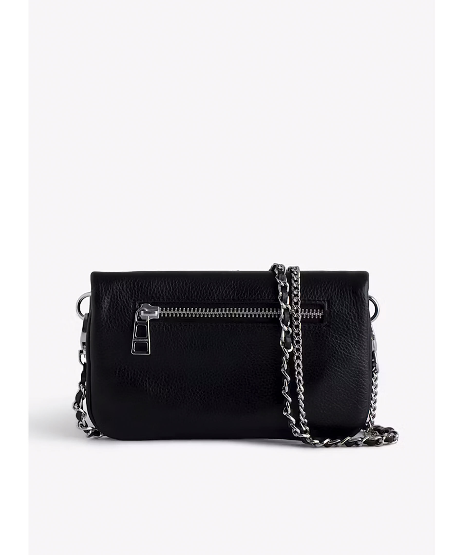 Svart läderclutch med silvertonade detaljer från Zadig Voltaire. Väskan har två avtagbara kedjor, en i läder och en i metall. Bär för hand, över axeln eller över kroppen. Bakficka med dragkedja. Väskan har en flik med magentstängning och dragkedja. Diamanté-utsmyckade vingar på framsidan. Tillverkad i kalvskinn. Tillräckligt stor för en mobiltelefon upp till 6,1 tum (t.ex. iPhone 12/13/14). Mått: B: 17,5cm / H: 11cm. Kedjeremsfall: 23 cm och 61 cm.