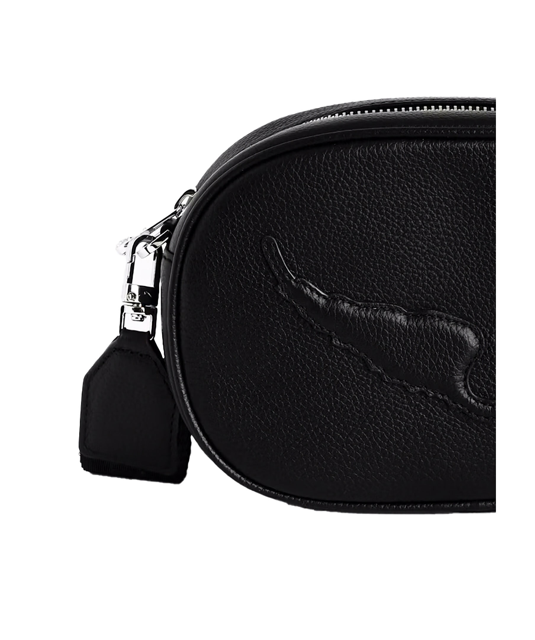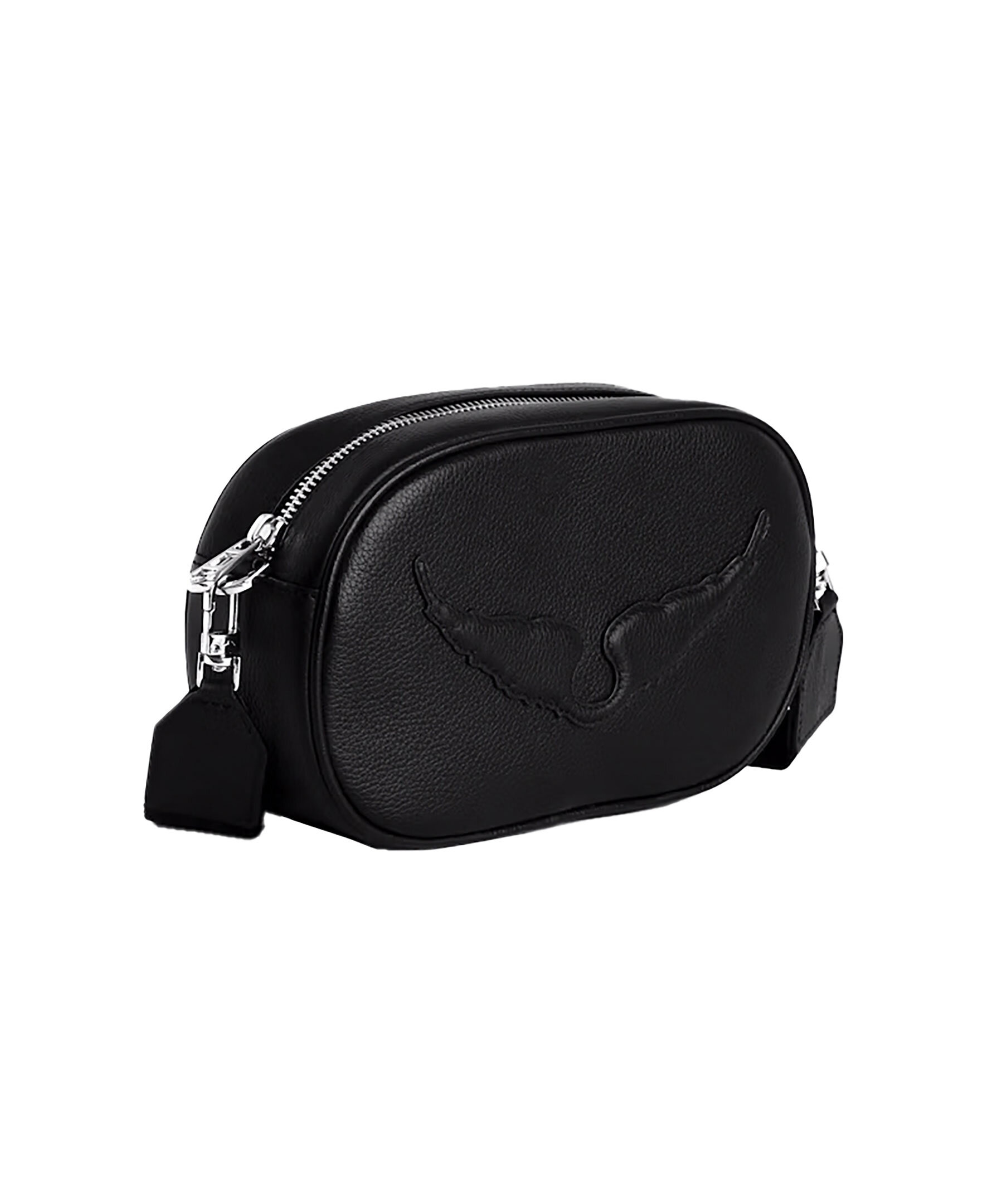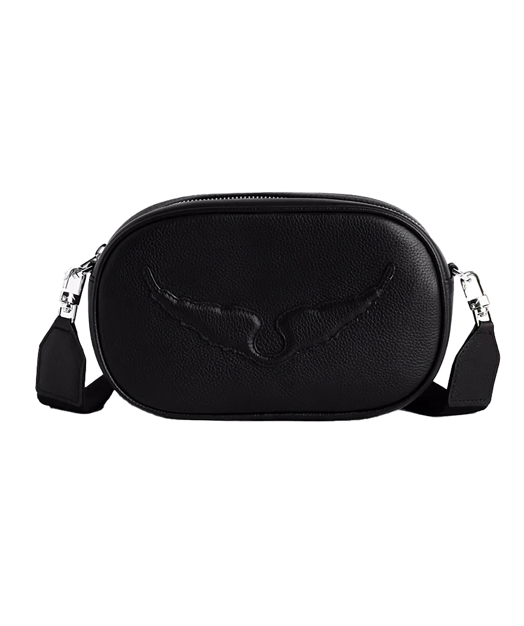 Svart crossbody kameraväska från Zadig Voltaire. Väskan har en juster- och avtagbar axelrem, en ficka baktill med magnetstängning, huvudfack med dragkedja samt ton-i-ton präglade vingar på framsidan. Försedd med hörlursfodral som fästs på axelremmen. Tillverkad i narvigt läder. Mått: 21.5 x 12 x 6.5 cm. Axelrem: 36 till 58 cm.