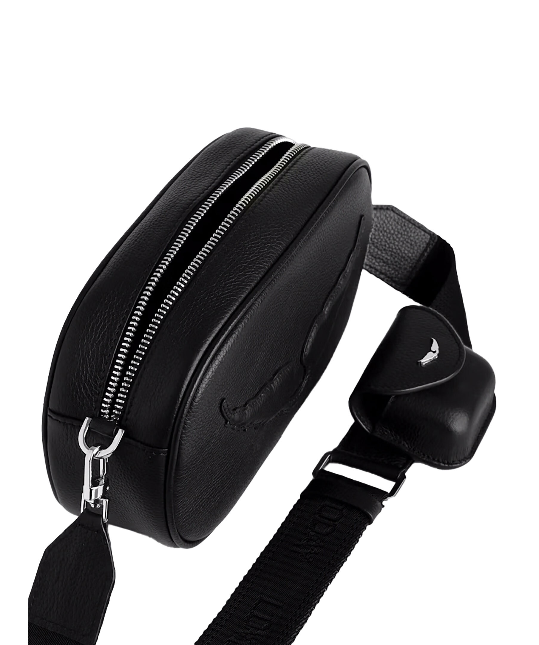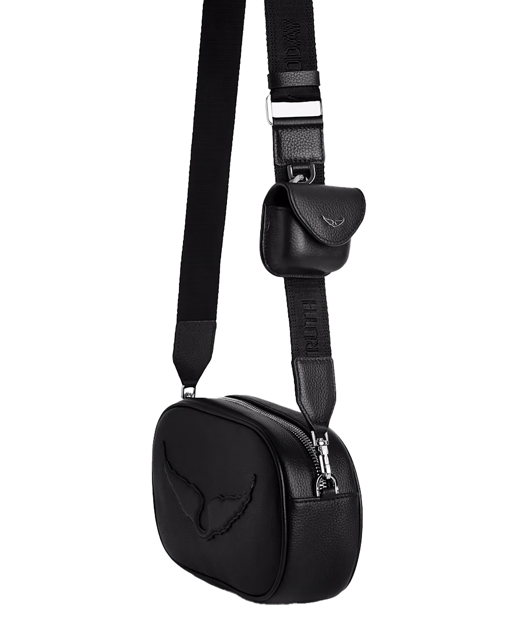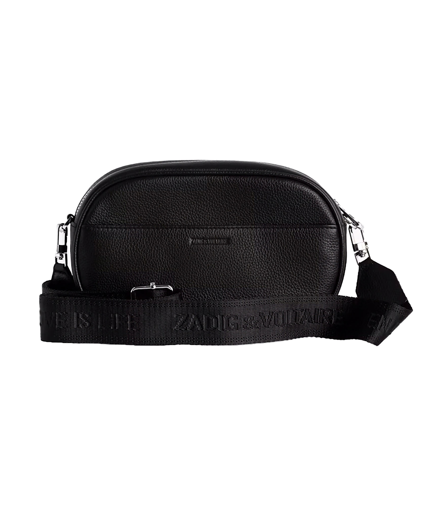 Svart crossbody kameraväska från Zadig Voltaire. Väskan har en juster- och avtagbar axelrem, en ficka baktill med magnetstängning, huvudfack med dragkedja samt ton-i-ton präglade vingar på framsidan. Försedd med hörlursfodral som fästs på axelremmen. Tillverkad i narvigt läder. Mått: 21.5 x 12 x 6.5 cm. Axelrem: 36 till 58 cm.