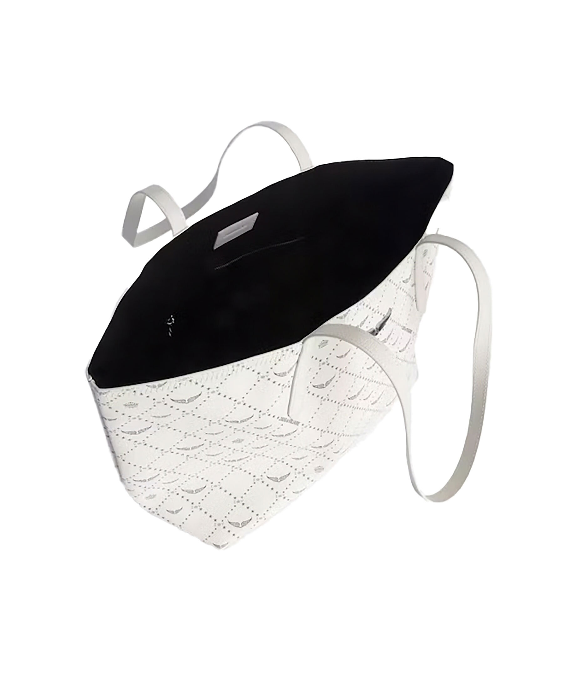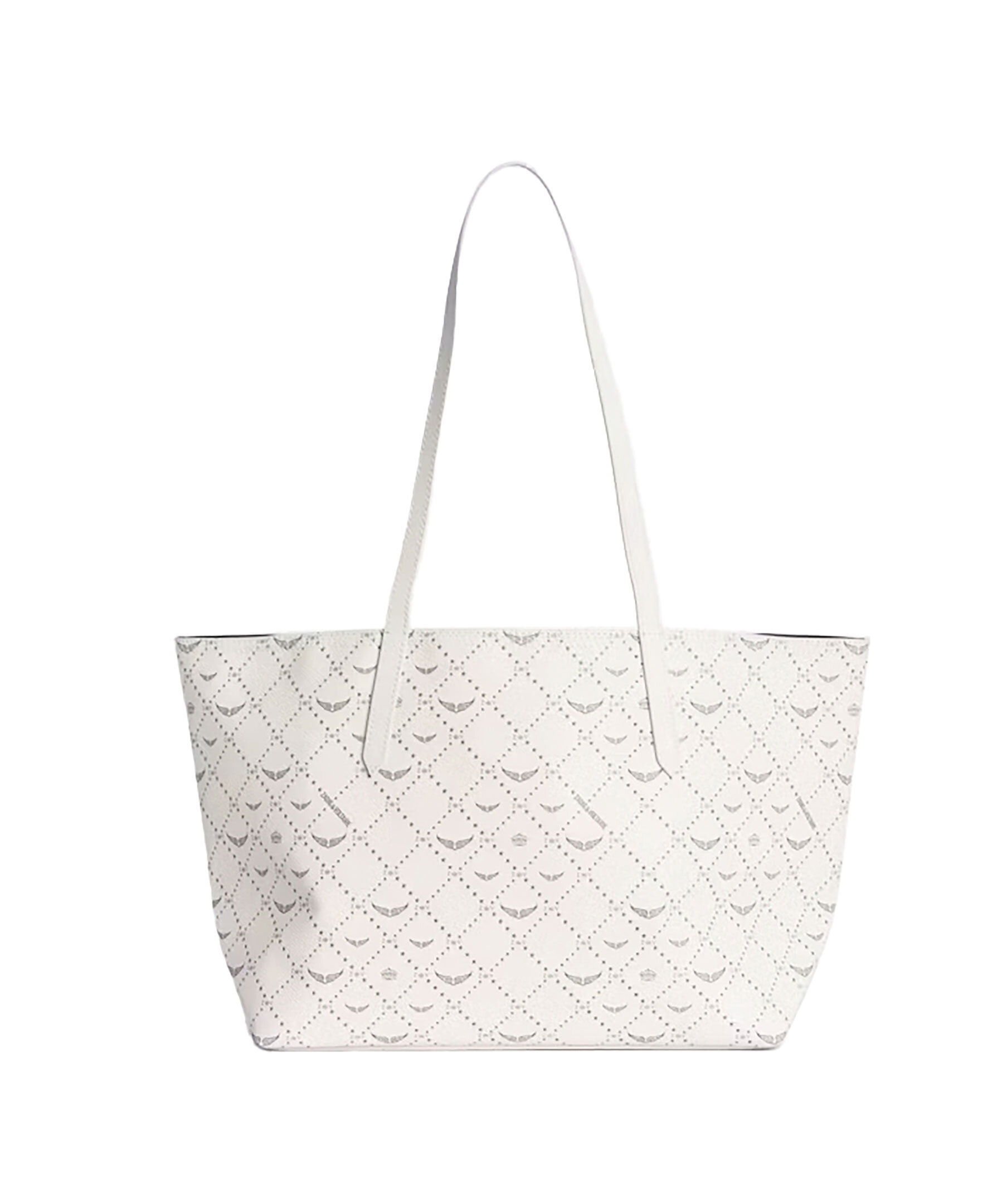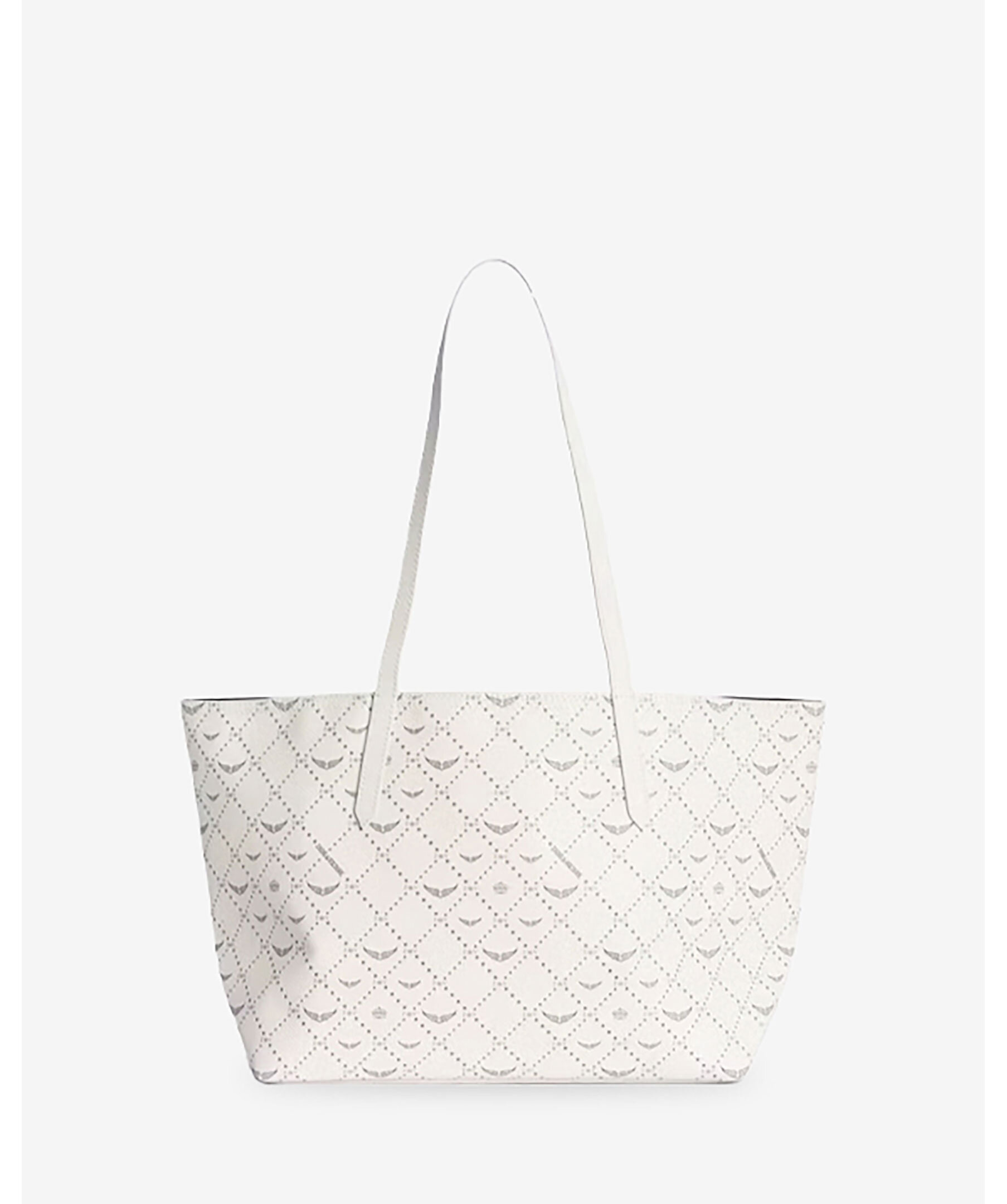 Krämvit tote bag från Zadig Voltaire. Väskan har genomgående monogramtryck, deras ikoniska metallvingar på framsidan. Tillverkad i konstläder. Mått: 44 x 24,5 x 17 cm. Handtagshöjd: 26 cm.
