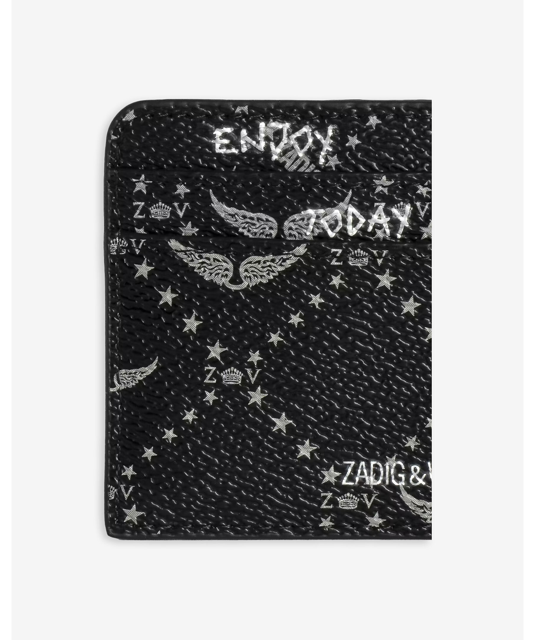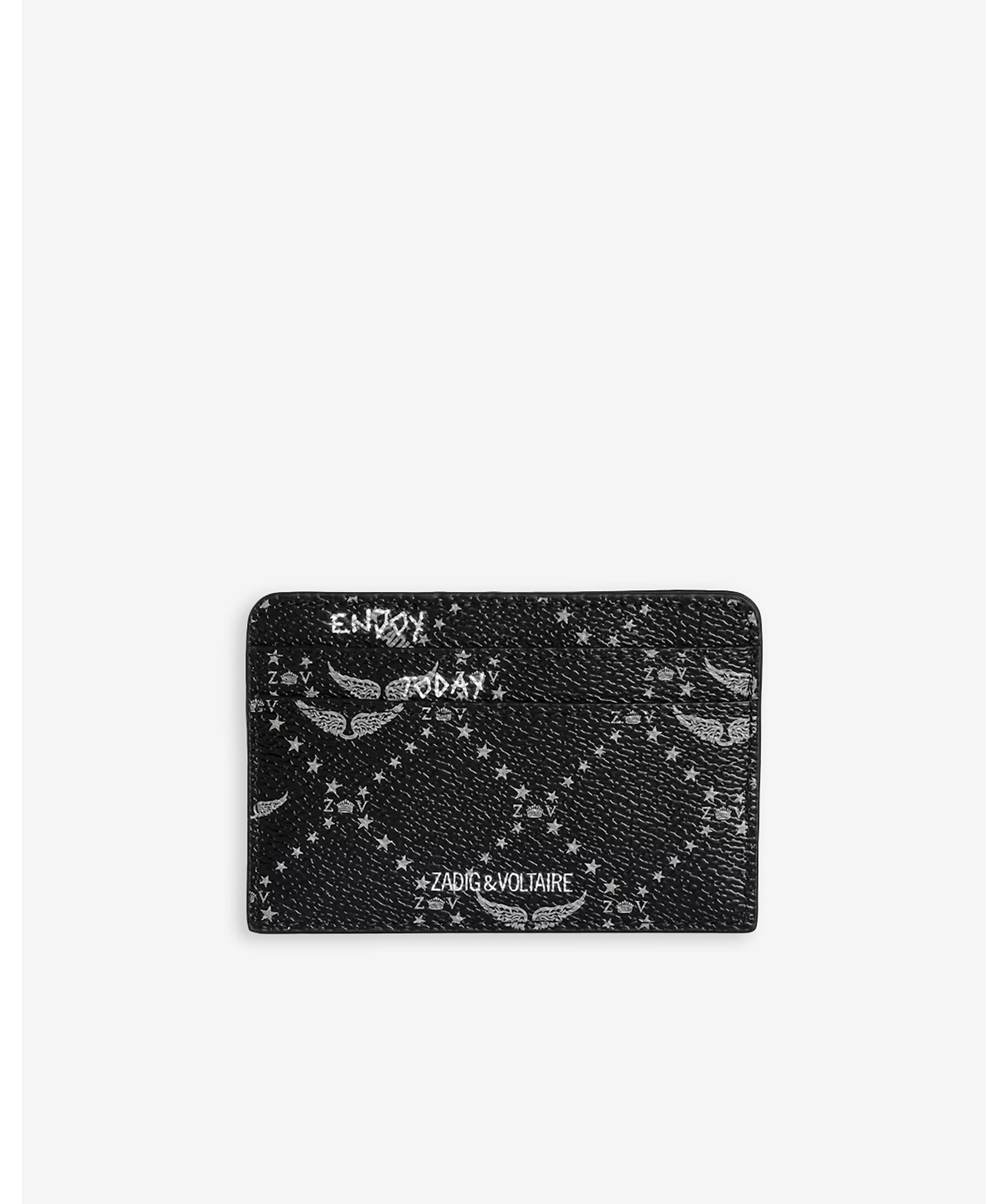 En kompakt korthållare från Zadig & Voltaire i coated canvas med monogramprint, metallvingar och texten “Enjoy Today”. Utrustad med två kortfack på baksidan och ett mittfack. Mått: 10,5 × 7 cm. Tillverkad i 67 % polyuretan och 33 % återvunnen polyester.