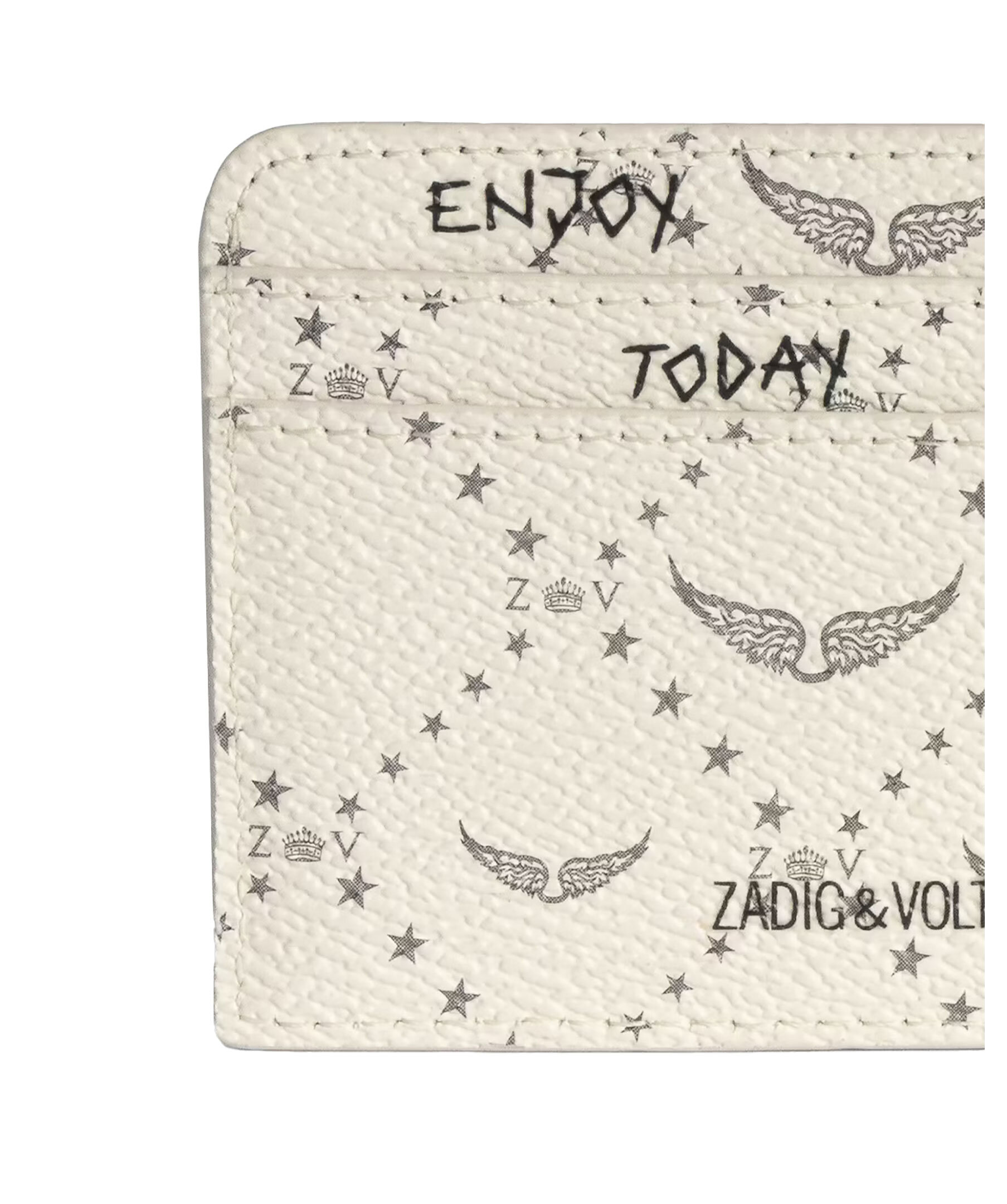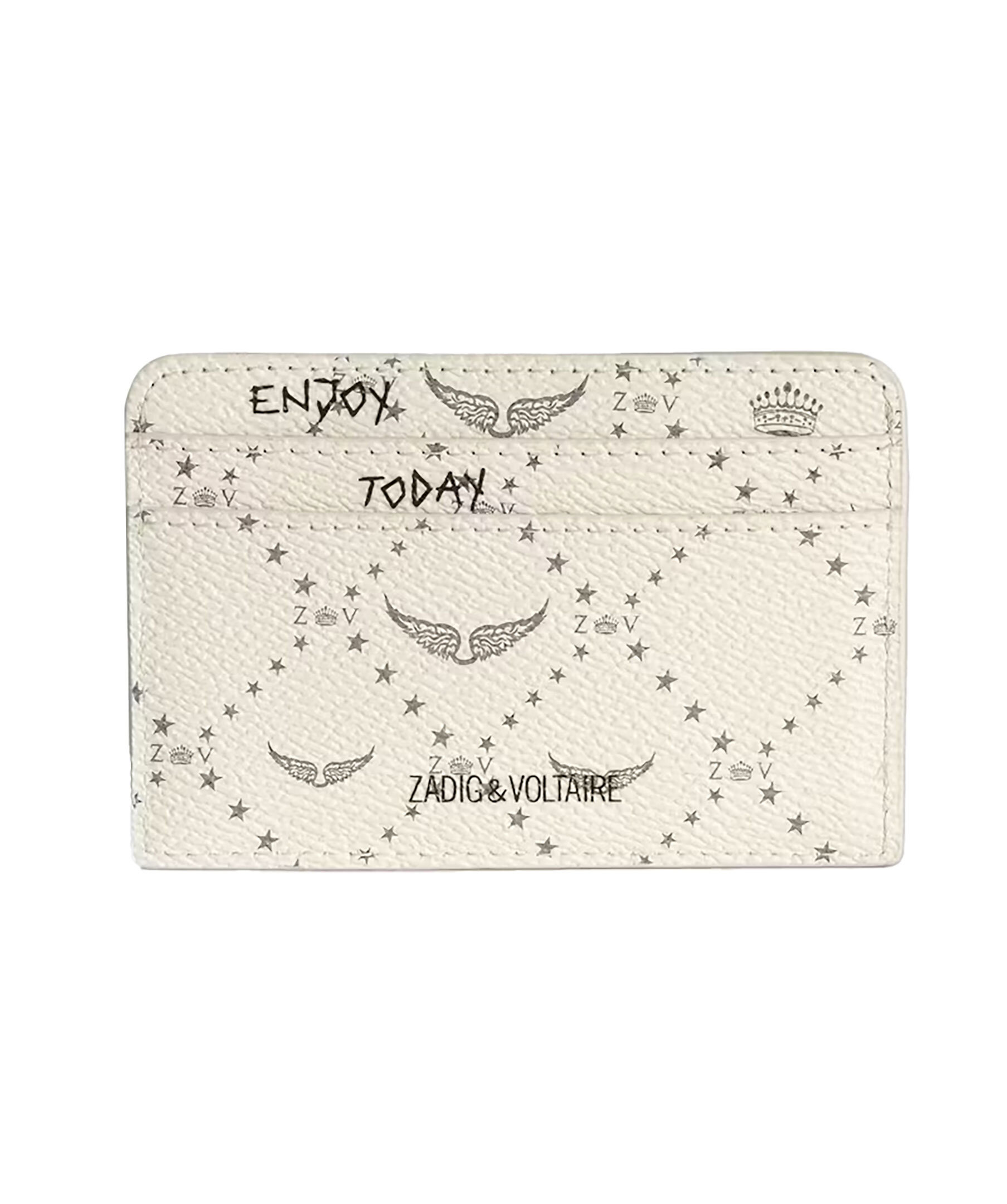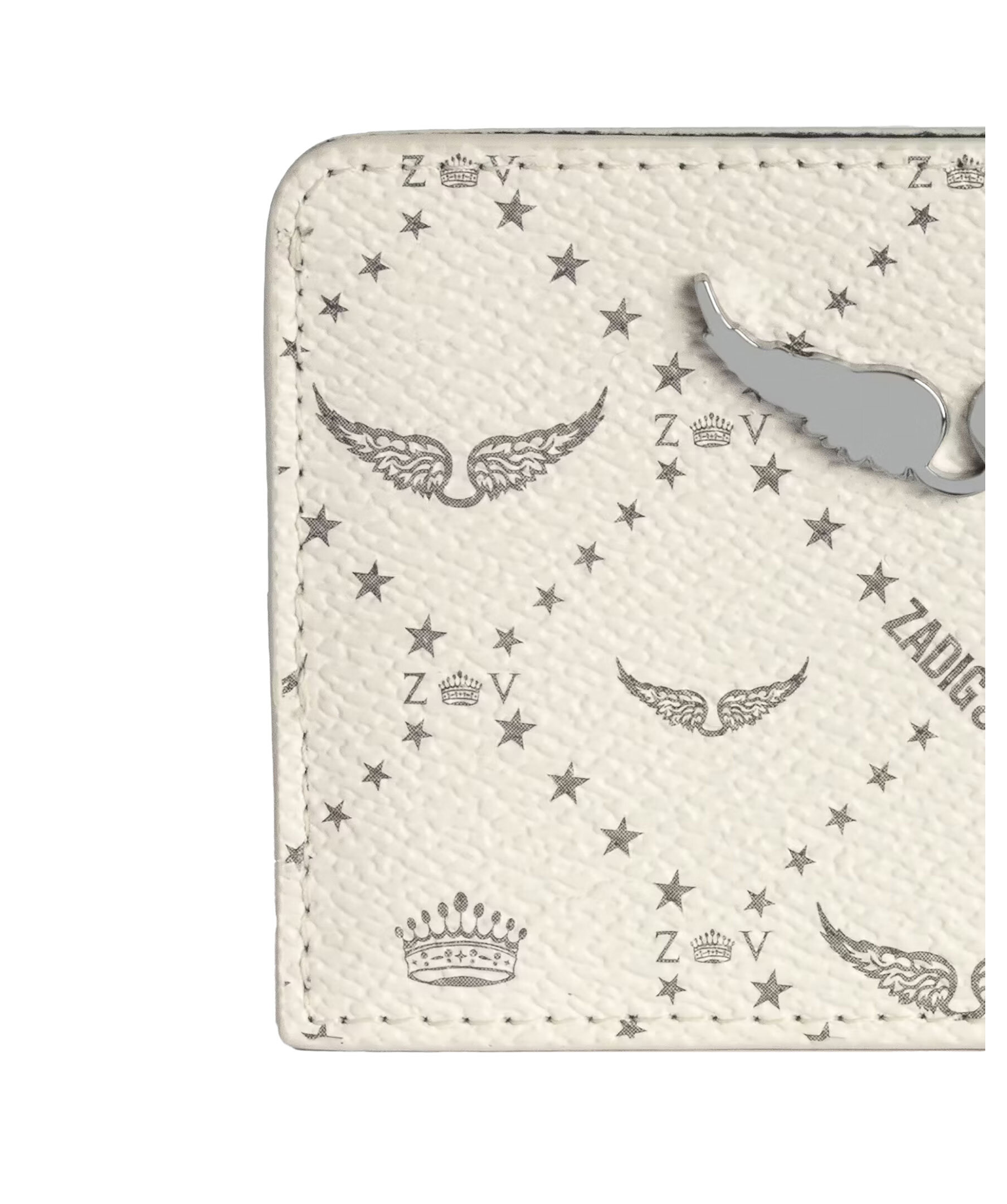 Krämvit korthållare från Zadig Voltaire. Korthållaren har två kortfack på baksidan och en ficka i mitten och är prydd med deras signaturvingar samt signaturvingar i metall. Tillverkad i fuskläder.