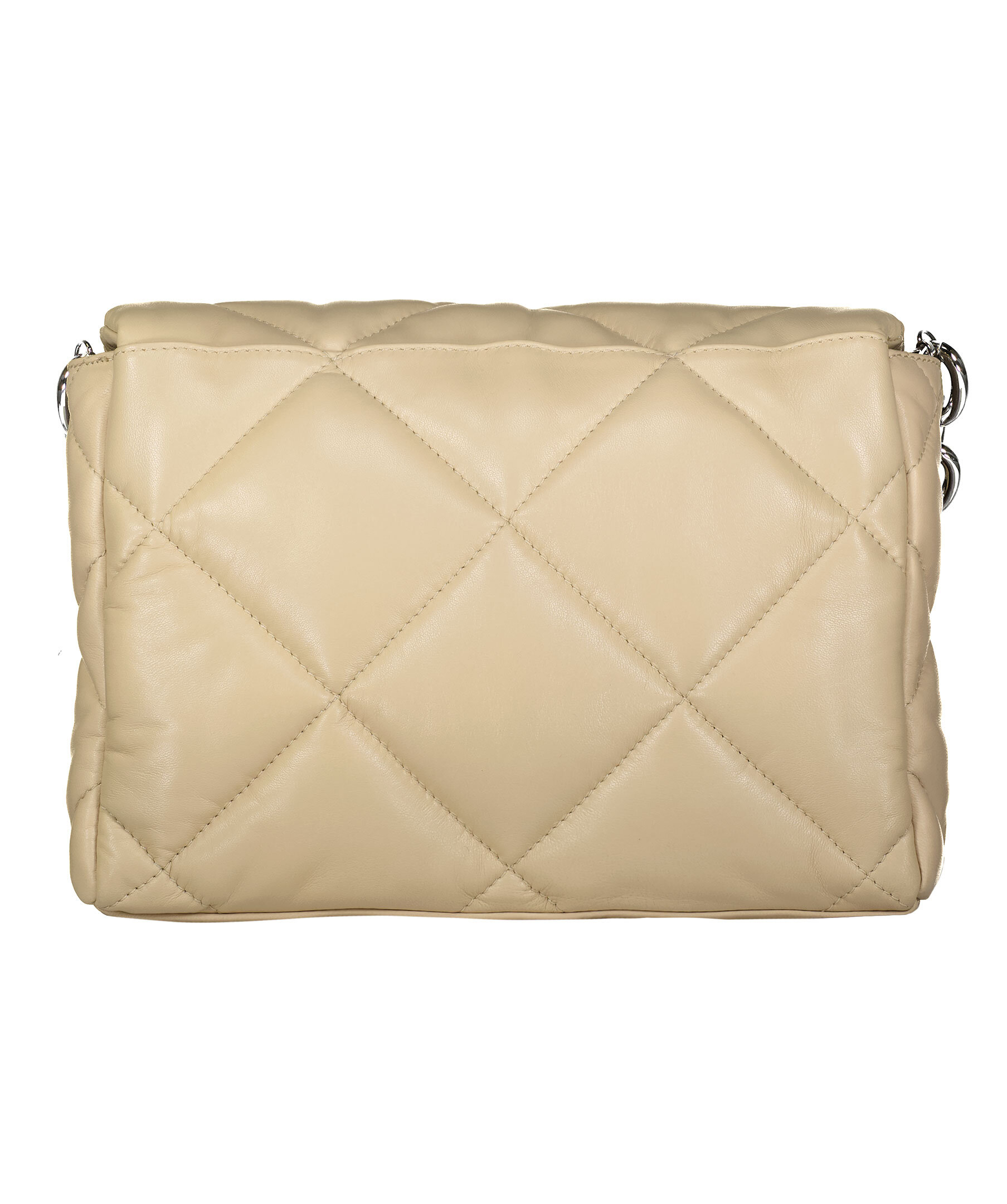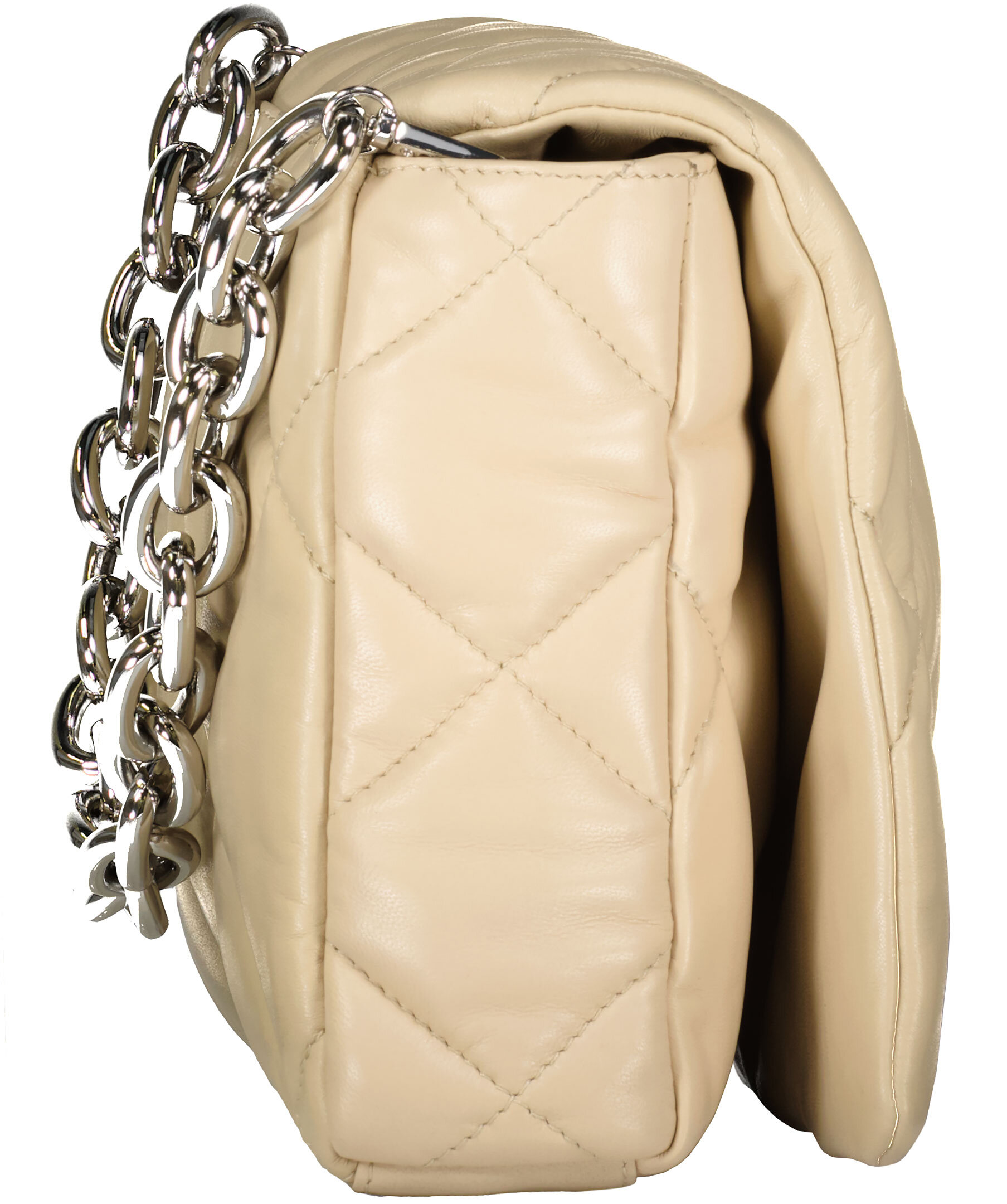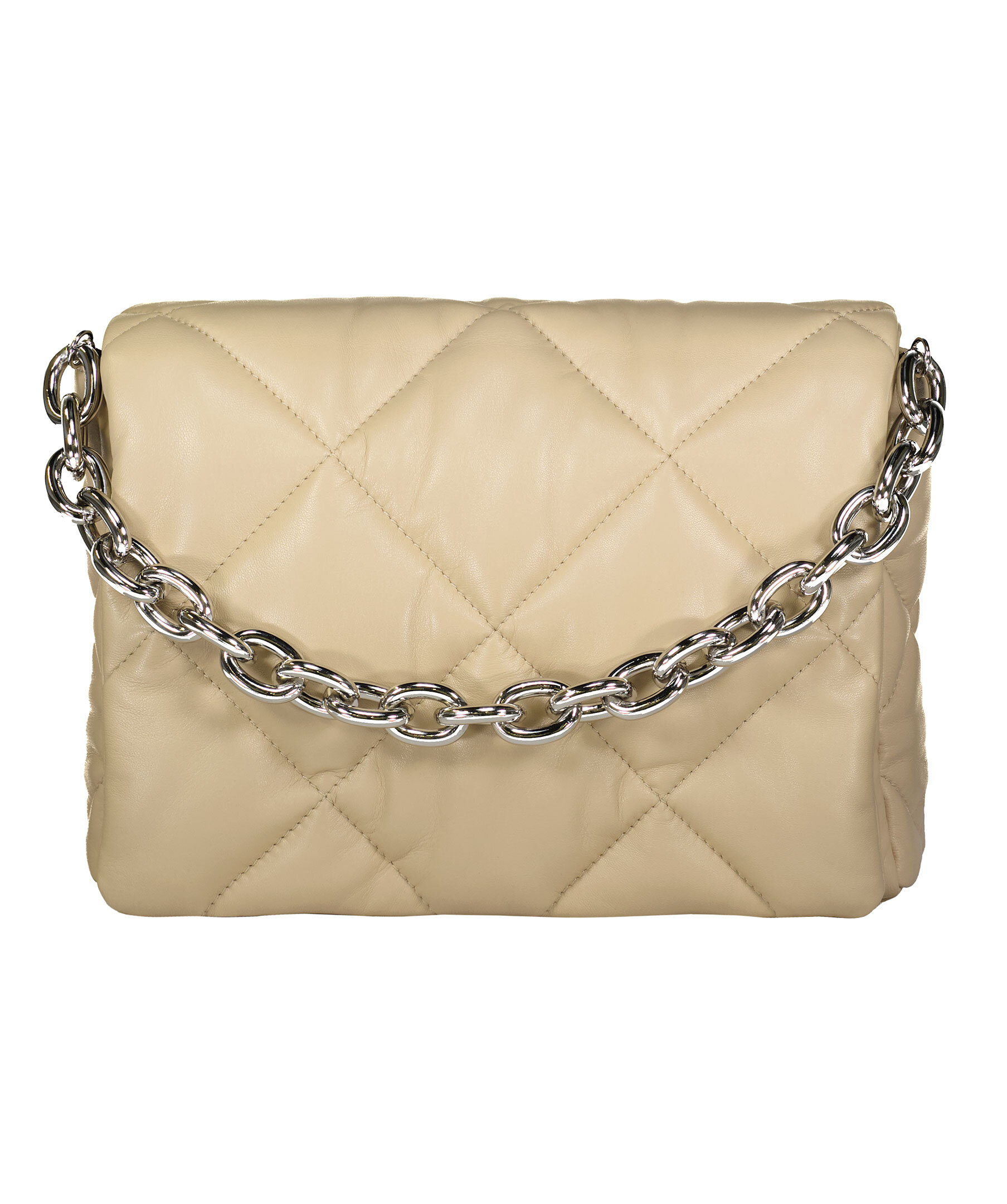Beige diamantquiltad clutchväska från Stand Studio. Den är tillverkad av smidigt lammläder och har ett tjockt kedjehandtag som är silverfärgat som passar att hänga på ena axeln. Den kommer också med en smal läderrem att byta ut till om man vill bära väskan snett över kroppen. Ficklock som stängs med tryckknapp samt en mindre ficka på insidan som stängs med dragkedja. Mått: Höjd: 20 cm Bredd: 30 cm Djup: 7 cm Axelrem: 116 cm Kedja: 56 cm