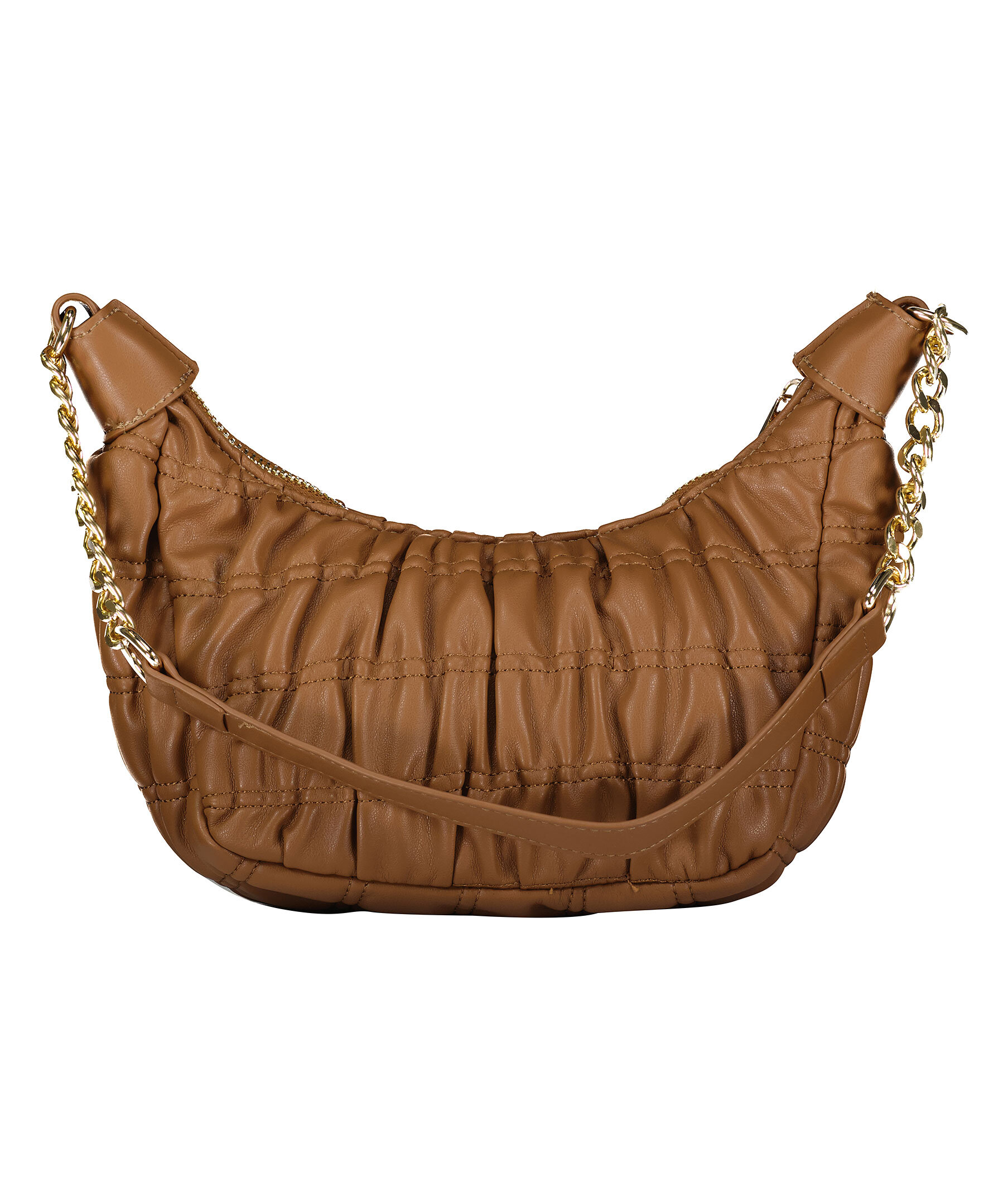 Brun baguetteväska i veckat läder. Huvudfacket stängs med dragkedja, Två innerfack varav ett med dragkedja. Guldfärgadlogotyp i metall framtill. Axelrems höjd 29 cm. Väskans mått, H: 15cm B: 23 cm D: 8cm.
