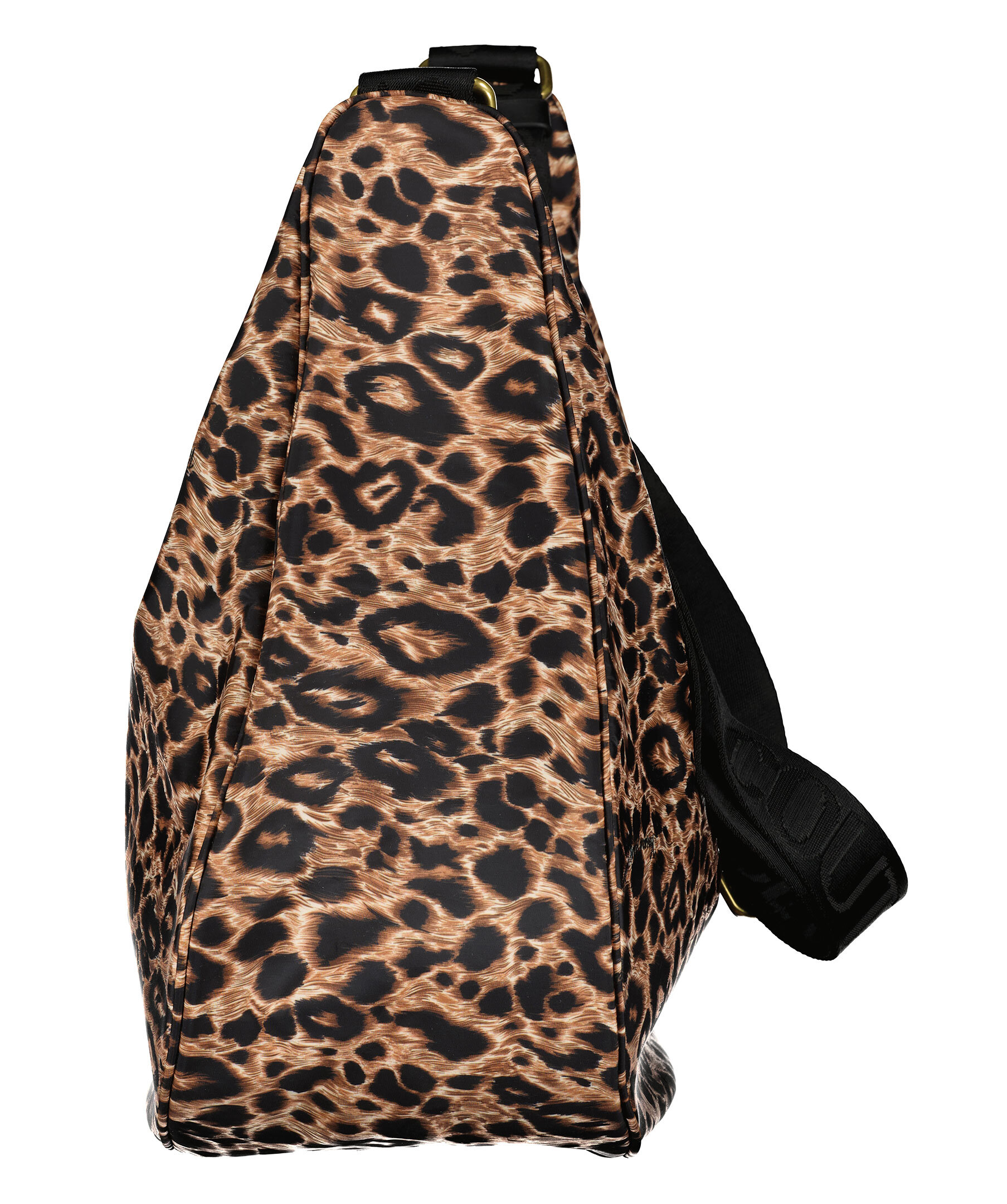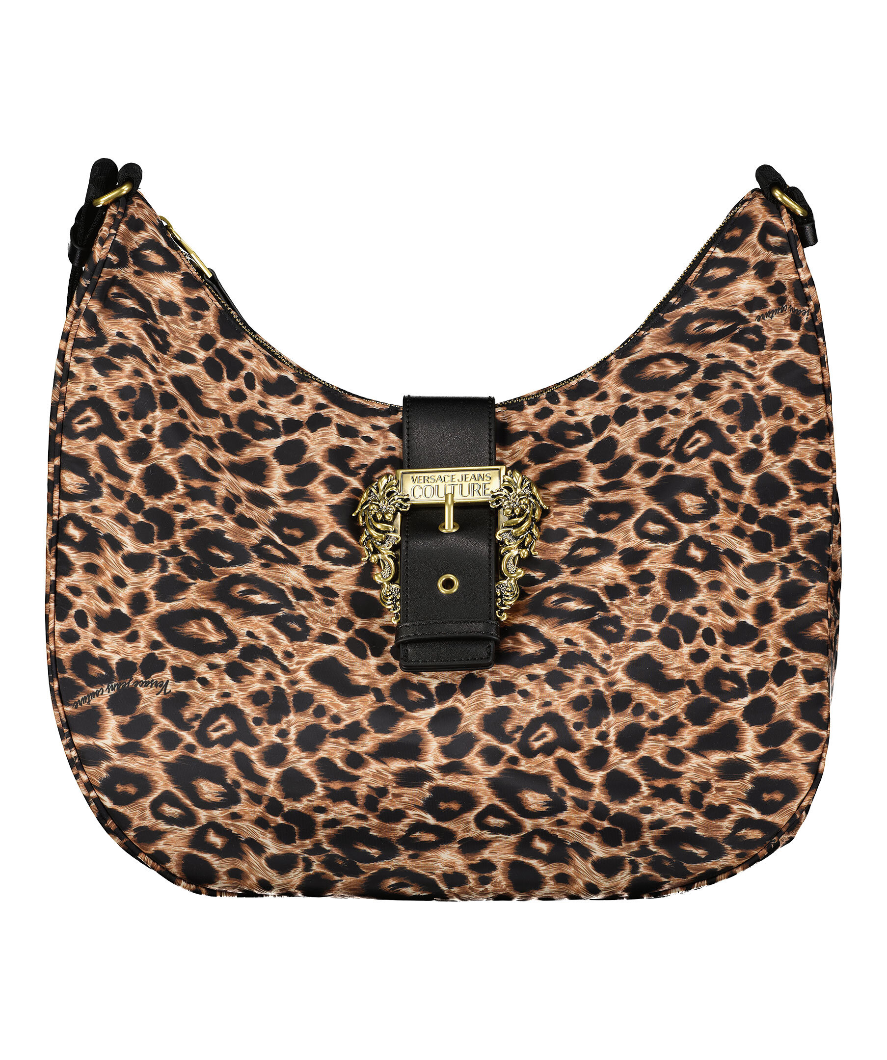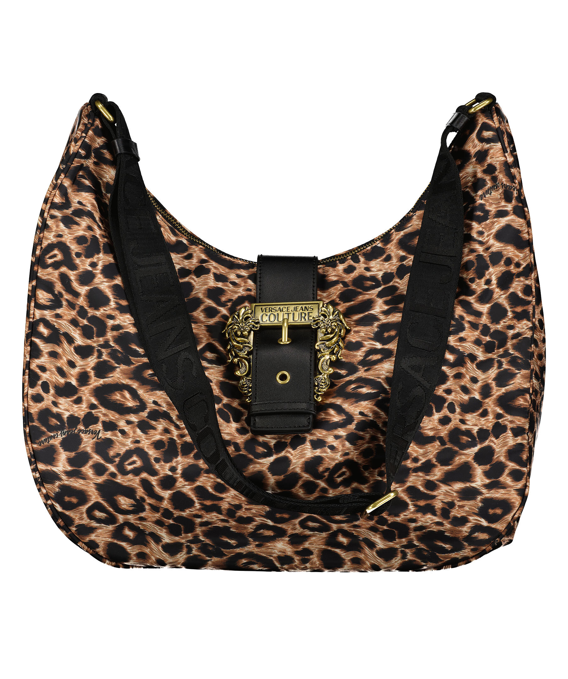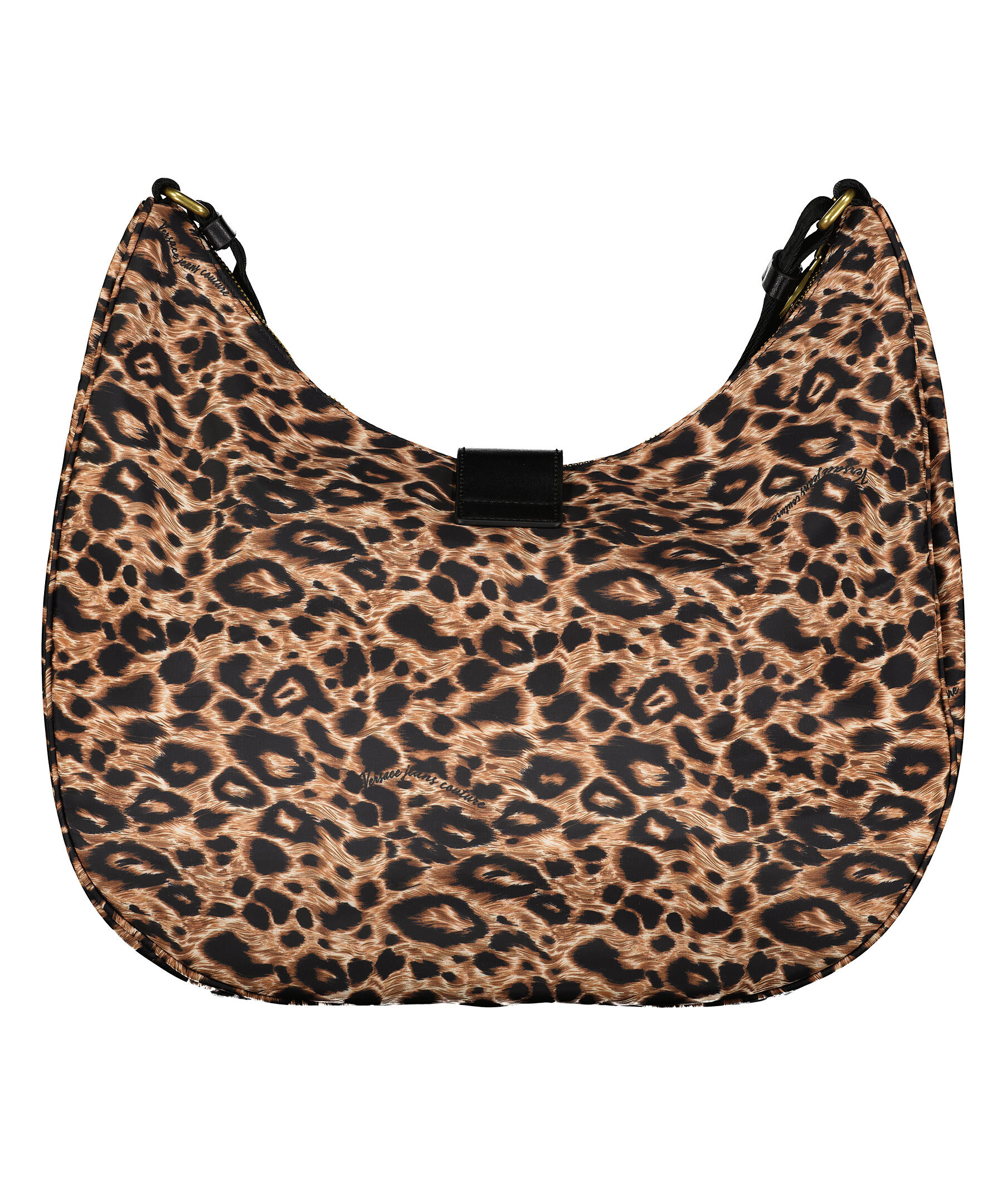 Leopardmönstrad crossbody bag från Versace Jeans Couture. Väskan är gjord i nylon och stängs med dragkedja och ett stort guldfärgat spänne med logotyp och magnet. Justerbar axelrem med diskret logotyp runt hela bandet. Väskans mått är: 28-34 cm hög, 14 cm djup och 39 cm bred.
